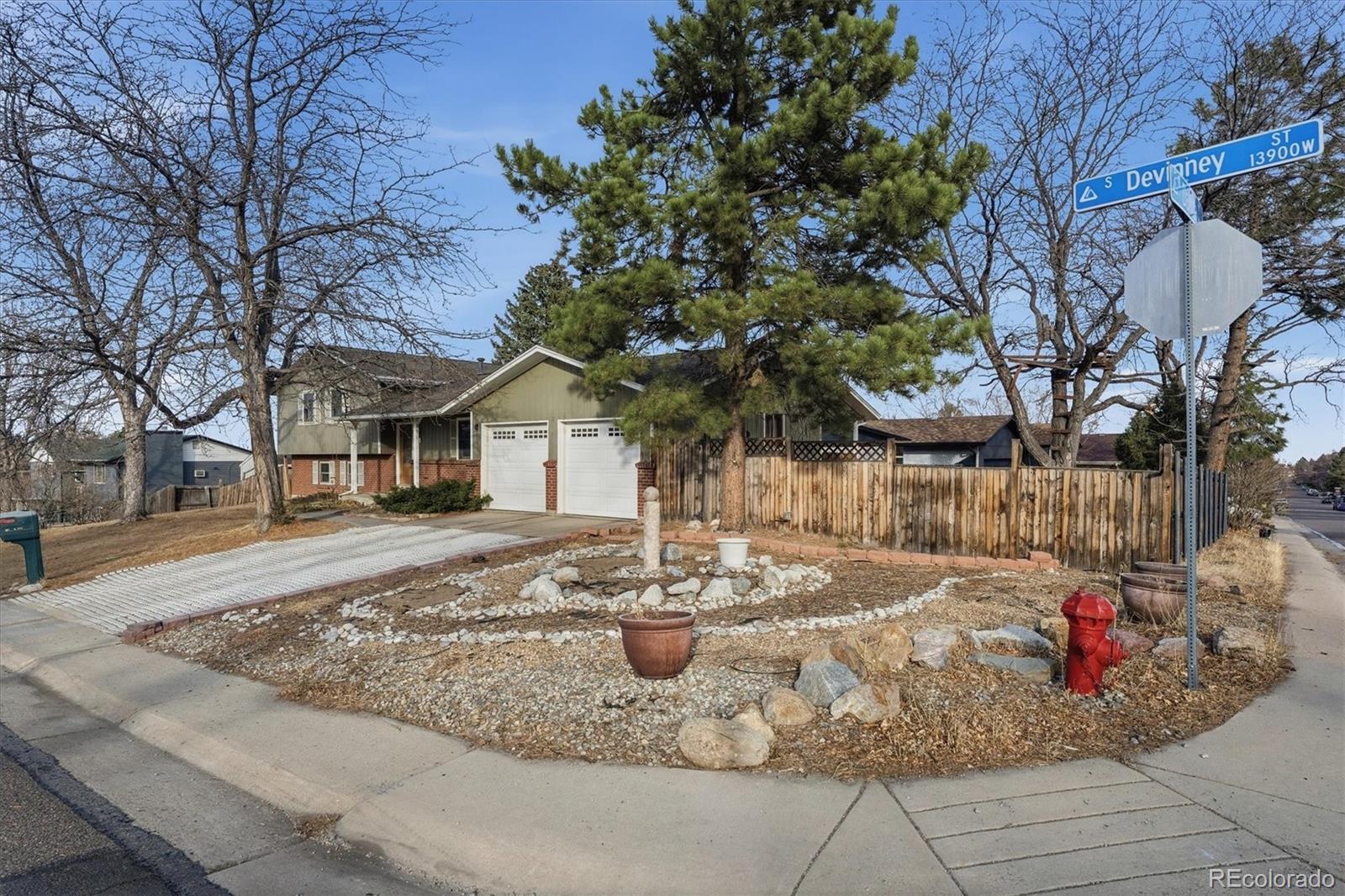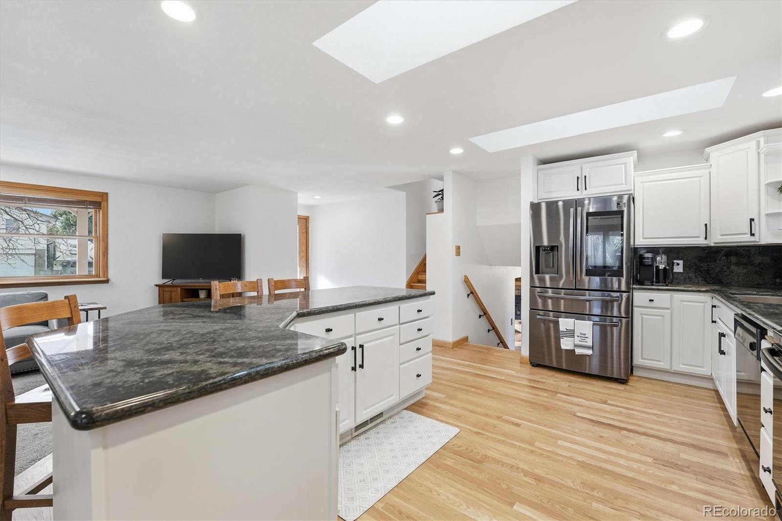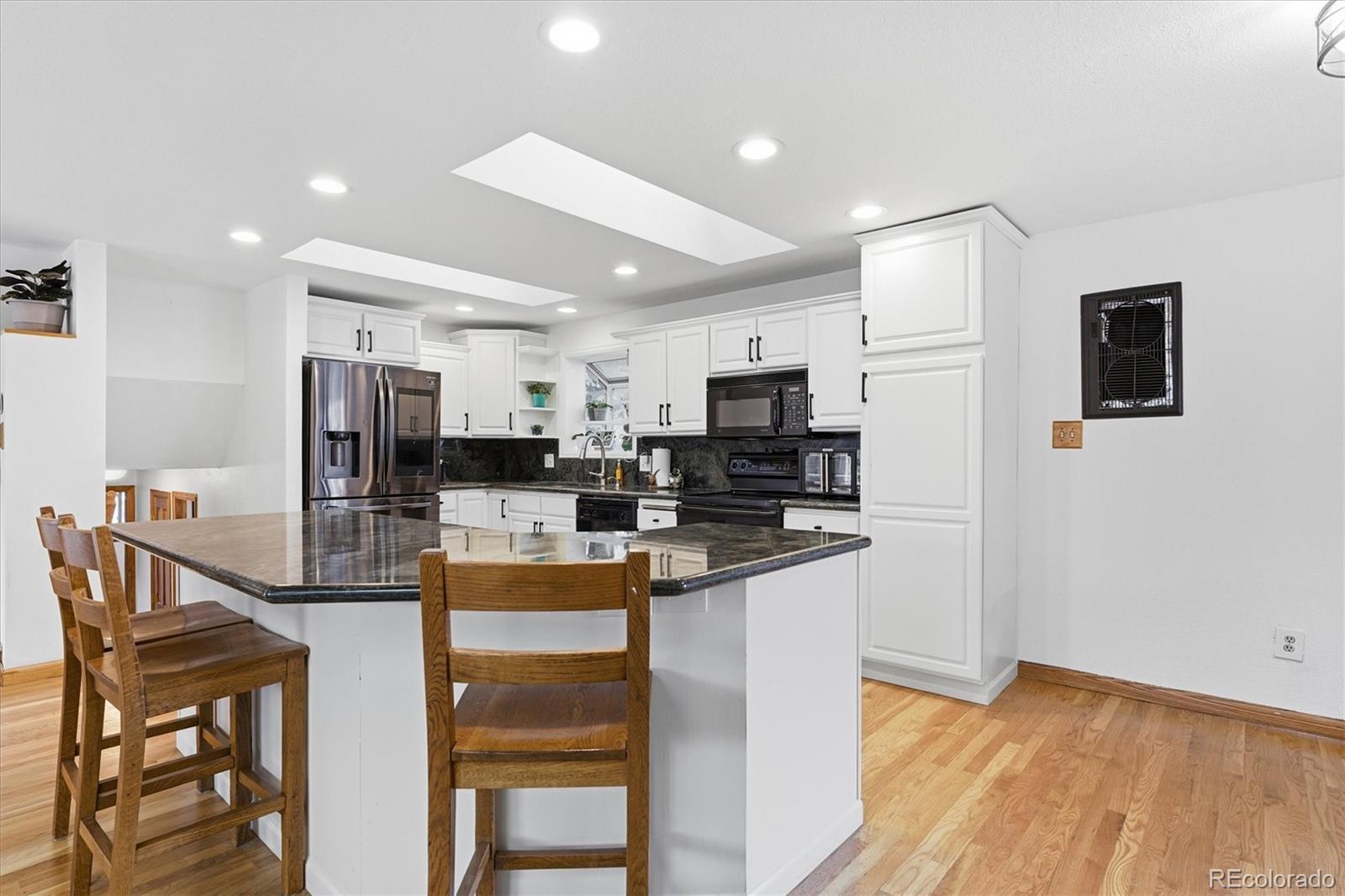 Beautiful tri-level home with a finished basement, ideally situated on a desirable corner lot just two blocks from the hiking and biking trails of Green Mountain. Fresh exterior paint and a welcoming covered front porch create inviting curb appeal. The main level features hardwood flooring throughout the entry, kitchen, and dining nook, with an open-concept living room and kitchen designed for comfortable everyday living and effortless entertaining. Skylights fill the space with natural light, highlighting the granite countertops, center island, ample cabinetry, and included appliances. A sliding glass door leads to the fully fenced backyard, complete with a large patio, covered patio area, and storage shed—perfect for outdoor gatherings and year-round enjoyment. The lower level offers hardwood flooring, a spacious family room with a gas fireplace and custom built-ins, a versatile bedroom ideal for guests or a home office, and an updated three-quarter bath with tile flooring. Upstairs, hardwood flooring continues throughout. The primary suite offers a private three-quarter bath and a built-in closet organizer, while the two additional bedrooms also include built-in closet organizers for enhanced storage and functionality. An updated full bath with skylight and tile flooring serves the upper level. The laundry area is conveniently located in the finished basement. An attached two-car garage provides everyday ease and practicality. Thoughtfully maintained and move-in ready, this home combines functional living spaces with an exceptional location close to outdoor recreation.