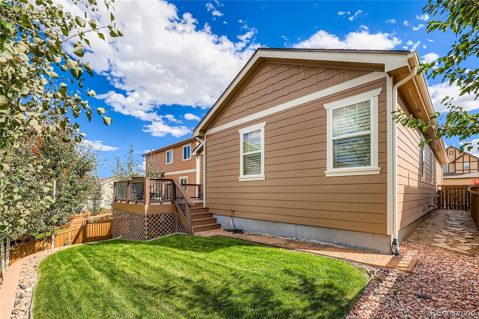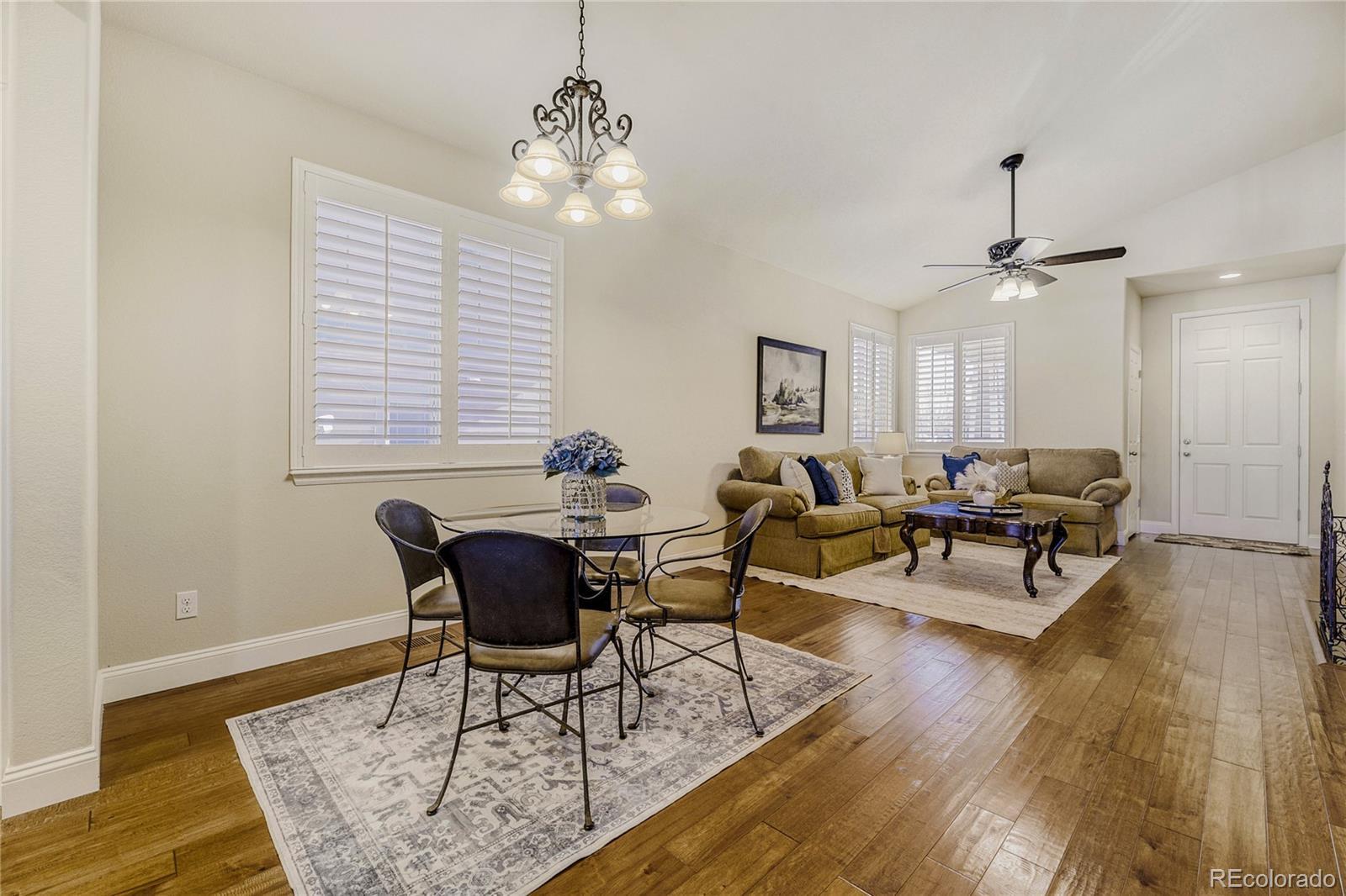 Welcome home to easy, main-level living in this beautifully designed ranch floorplan, perfectly located in The Meadows. From the moment you step inside, you’ll appreciate the open, airy feel created by high ceilings, wide-plank wood flooring, plantation shutters, and thoughtful architectural details throughout. The heart of the home is the spacious great room, where a cozy gas fireplace sets the perfect ambiance for cool Colorado evenings. The open layout flows seamlessly into the dining area and kitchen, making this home ideal for entertaining or simply enjoying everyday life. The kitchen is both stylish and functional, featuring a gas cooktop, large eat-at island, pantry, and a stunning stacked stone backsplash that adds warmth and character. Step out onto the rear deck and enjoy peek-a-boo mountain views — also visible from the kitchen and master suite — creating a peaceful backdrop to your morning coffee or evening unwind. The covered front porch provides an additional outdoor space to enjoy! The primary suite is a true retreat, offering generous space for your furniture, beautiful natural light, and those same inviting mountain views. The luxurious en-suite bath showcases elegant tile work, an oversized shower with bench and pebble stone floor, and a spacious walk-in closet with plenty of room for your wardrobe. Two additional bedrooms and a full bath provide flexibility for guests, family, or a dedicated home office to fit today’s lifestyle needs. New hail resistant roof in 2025! New exterior paint in 2023! The 2 car garage is extra deep at 23’8” providing additional storage space! Located in the highly sought-after Meadows community, you’ll enjoy access to three pools, tennis and pickleball courts, ball fields, over 1,100 acres of public open space, and 24 miles of scenic trails for hiking and biking. If you’ve been searching for low-maintenance, main-floor living with mountain views and exceptional amenities, this home is one you won’t want to miss.