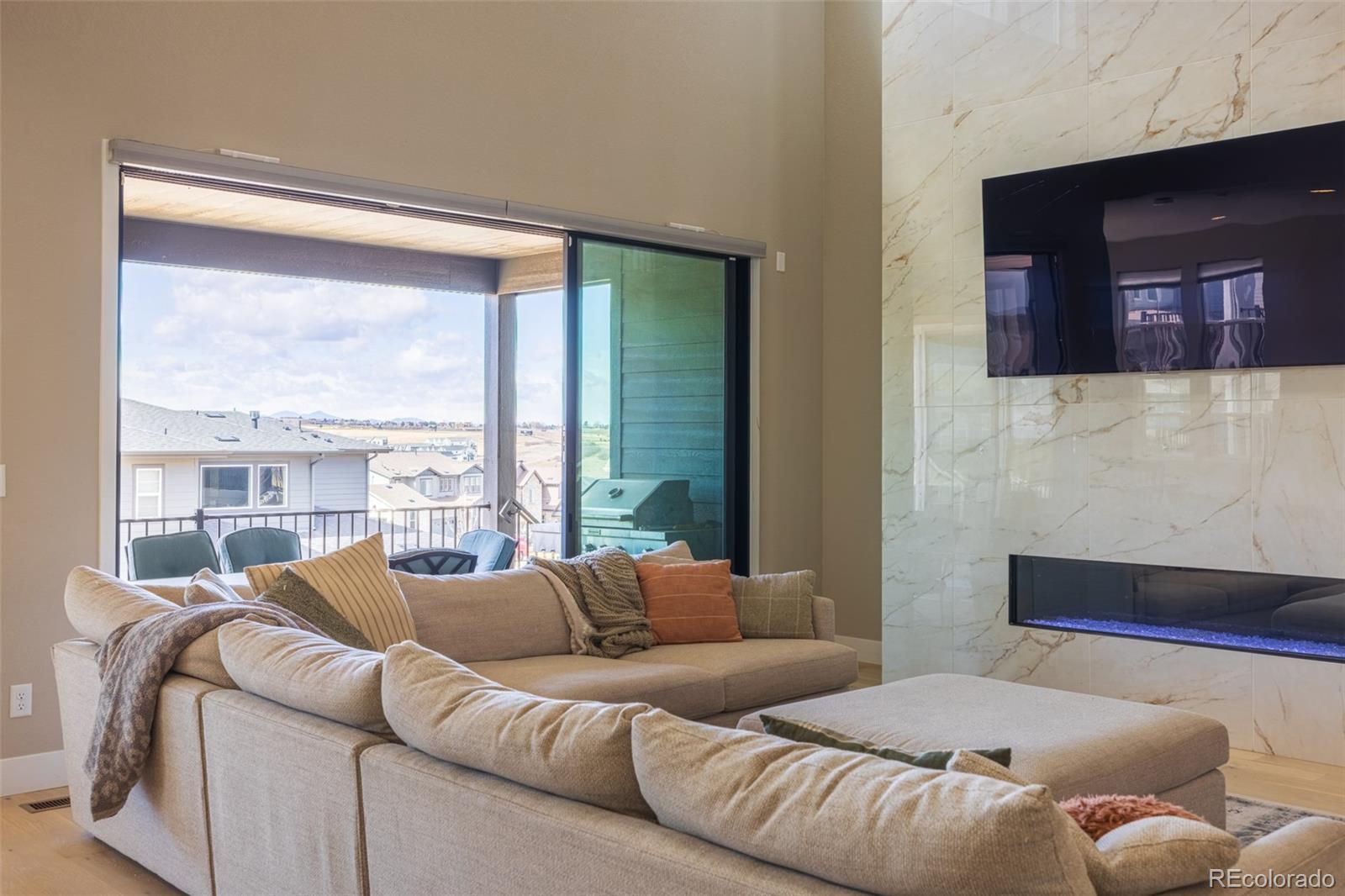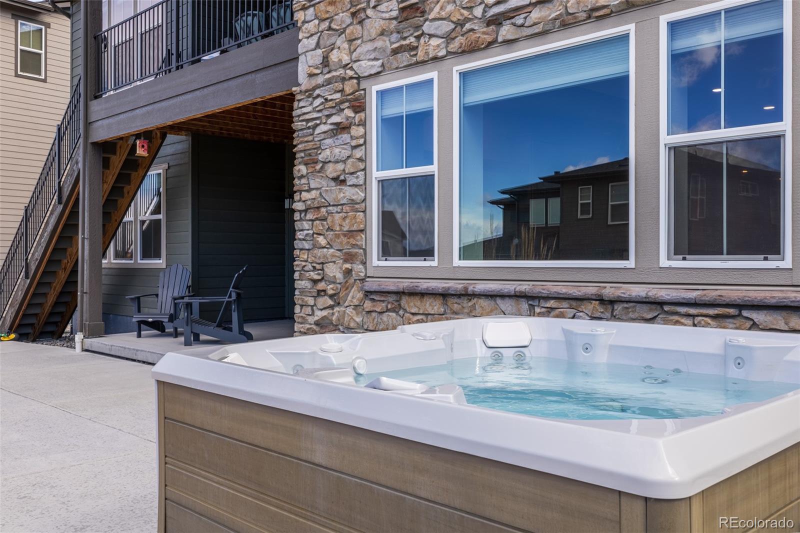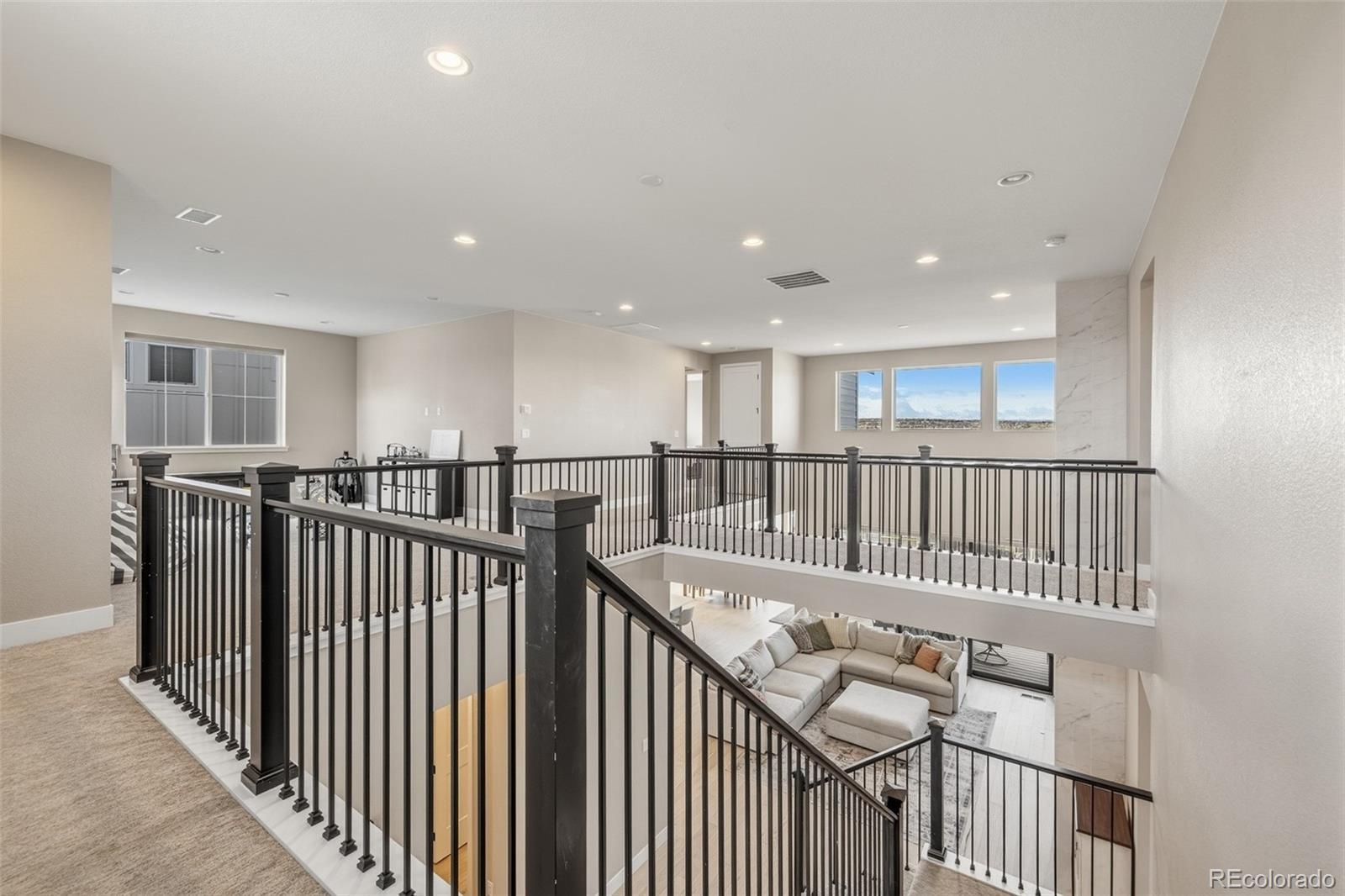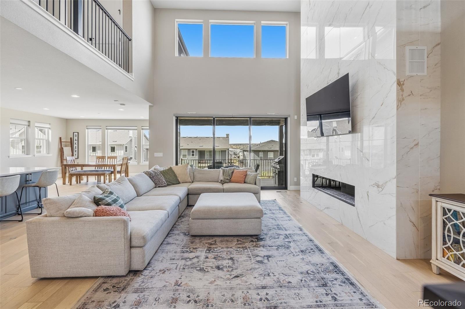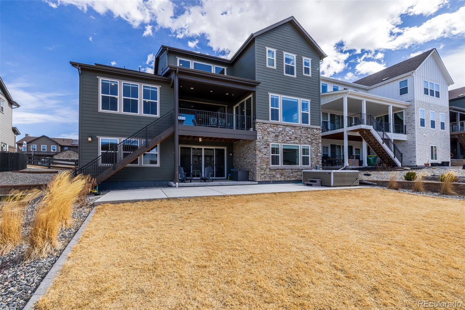 Located in The Canyons of Castle Pines, this home offers over 6,000 square feet with a gorgeous layout and extensive upgrades throughout. The main level is filled with natural light from oversized windows and features vaulted ceilings, upgraded flooring, and an open-concept design anchored by a floor-to-ceiling marble fireplace. The kitchen is designed for both everyday living and entertaining, with quartz countertops, a large center island with seating, upgraded stainless appliances, double ovens, gas cooktop, built-in wine fridge, big walk in pantry and dining room! TWO expansive sliding glass doors, one an impressive multi-panel slider opening to the covered deck, creating seamless indoor/outdoor living. The entertaining possibilities in this home are endless. The main-floor primary suite includes a spacious bedroom, large walk-in closet, and a spa-style bath with dual sinks, quartz counters, waterfall shower, freestanding soaking tub, and oversized glass shower. A secondary main-floor bedroom with adjacent full bath offers flexibility for guests or office use. Upstairs features a large loft ideal for a second living area, media space, or playroom. Bedrooms are generously sized, and every main and upper-level bedroom includes its own ensuite bath and walk-in closet. The finished walkout basement includes over $150,000 in upgrades, complete with a full wet bar featuring beverage fridge and ice maker, expansive recreation space, additional bedrooms, and direct access to the landscaped patio with hot tub. Additional highlights include a spacious laundry room with built-in cabinetry and storage, large secondary bedrooms, tons of closet space, and a 3-car garage, big enough for SUVs! Residents of The Canyons enjoy access to Canyon House clubhouse with resort-style pool, fitness and movement studios, restaurant and bar, outdoor gathering areas, and The Exchange Coffee House. Convenient access to I-25, nearby trails, and open space. This home is STUNNING!