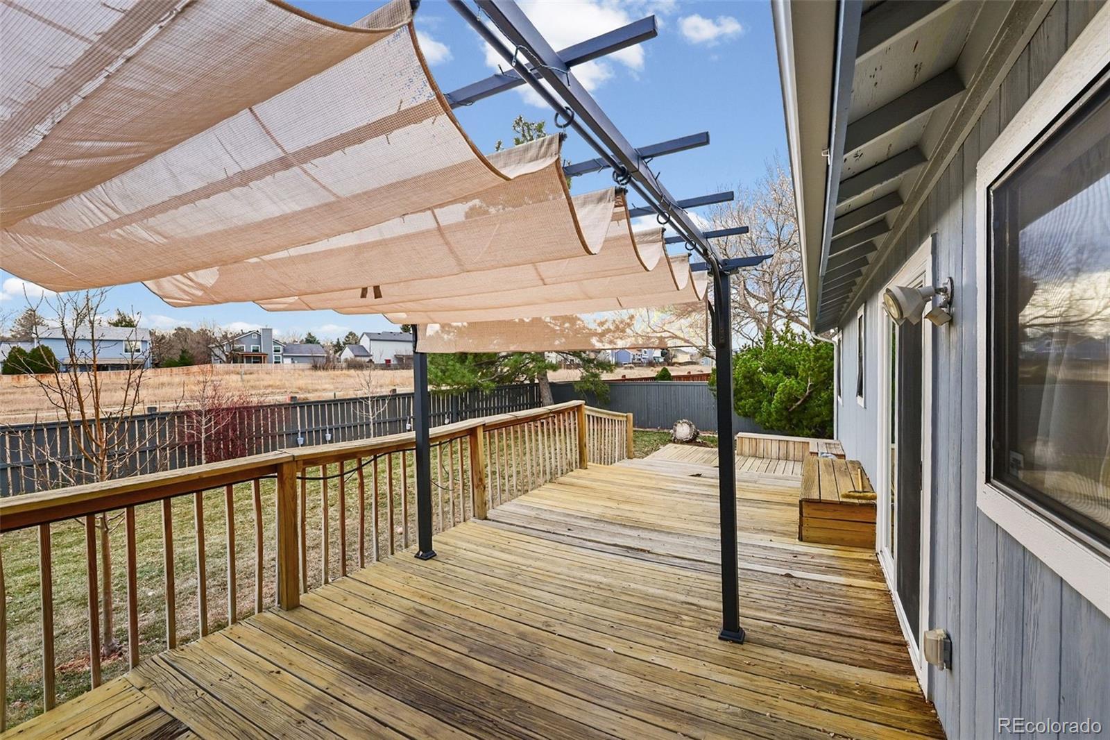 There are some homes that simply feel good from the moment you step inside! This Highlands Ranch ranch that backs to open space was designed for light, warmth, and ease. Vaulted ceilings open the main living spaces, fresh paint brightens the kitchen, hallway, dining, and living rooms, and hardwood floors guide you effortlessly throughout the main level and down the stairs to the finished basement. Morning sunlight pours into the kitchen, reflecting off the updated lighting and creating the kind of space that makes everyday moments feel special. Step outside and the Colorado experience unfolds with the backyard bordering open space with direct access to miles of trails, and some mountain views from both the deck and front yard. A pergola casts soft shade over the large deck, making it the perfect place for morning coffee, afternoon gatherings, or watching the colors change at sunrise. The primary bedroom is a quiet retreat, offering a generous closet and a private bath with a new vanity and walk-in shower. The finished basement extends your living space with a cozy family room and wet bar, a non-conforming bedroom and bath, plus a spacious utility room with laundry - washer and dryer included. Outdoor living comes naturally here. Living in Highlands Ranch means access to beautifully maintained parks and trail systems, Lebsack Tennis Center, Redstone Park, the Highlands Heritage Park, the newer Senior Center, and more - all part of the highly regarded Metro District. Shops, restaurants, and the seasonal farmers market at Town Center are just minutes away, and easy routes to Santa Fe, C-470, and I-25. This is Colorado living - comfortable, connected, and surrounded by the outdoors. Buyer to verify all information.