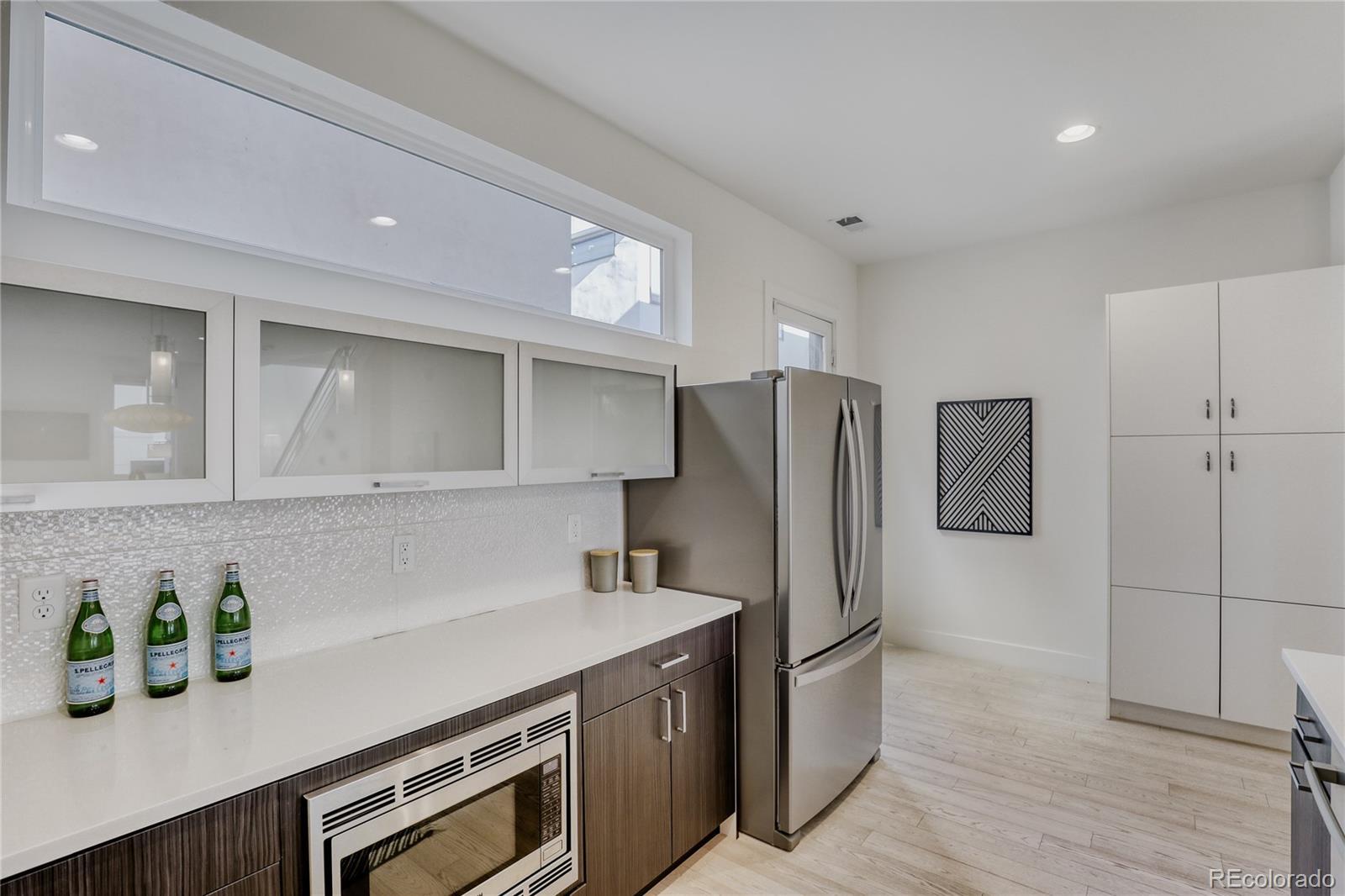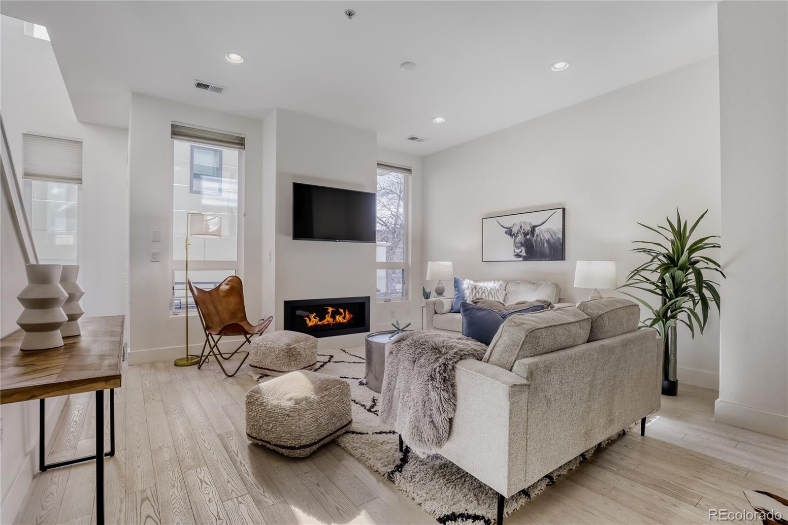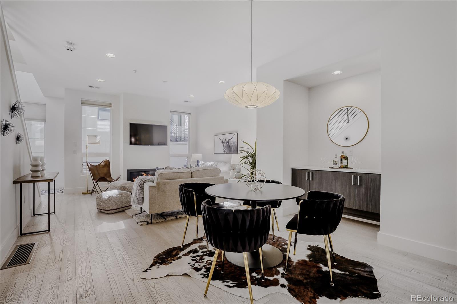 Contemporary Urban Townhome with Impeccable City and Mountain Views. Conveniently located in the heart of Lohi, this home features a thoughtfully designed floorplan for every day living and entertaining. With three levels of prime dwelling space, each floor has its own character and uniqueness. The main level has abundant natural light, white oak plank hardwood floors and a desirable open concept with 9 foot ceilings. The Living Room is anchored by a gas fireplace and tall West facing windows. The Dinng Area has its own built-in buffet with stoage and located by the generous kitchen peninsula with room for plenty of countertop seating. Euro styled cabinetry, Bosch appliances with 5 burner cooktop, convection oven and pull-out drawer pantry add to this kitchen's practicality. You can grill steps away on an outside balcony with installed gas line. The upper level Primary Suite is bright and cheery and a generous size wth stunning bathroom. The 2nd Bedroom and attached private full bath makes a great guest suite. Laundry room is also next to both bedrooms. The 3rd level is a Great Room with half bath, wet bar and beveage fridge overlooking the City and Mountains. Step outside to your own rooftop deck and enjoy one of the best views of Denver. The lower floor has a space for your Peloton next to the heated 2 car garage. There is NO home owner association. Only a Party Wall Agreement with monthly dues of $150 to $200. This home is equipped with a builder's fire sprinkler system on each level. Walk to nearby restaurants and parks. Close to Downtown and both interstates. Become a part of a very special neighborhood