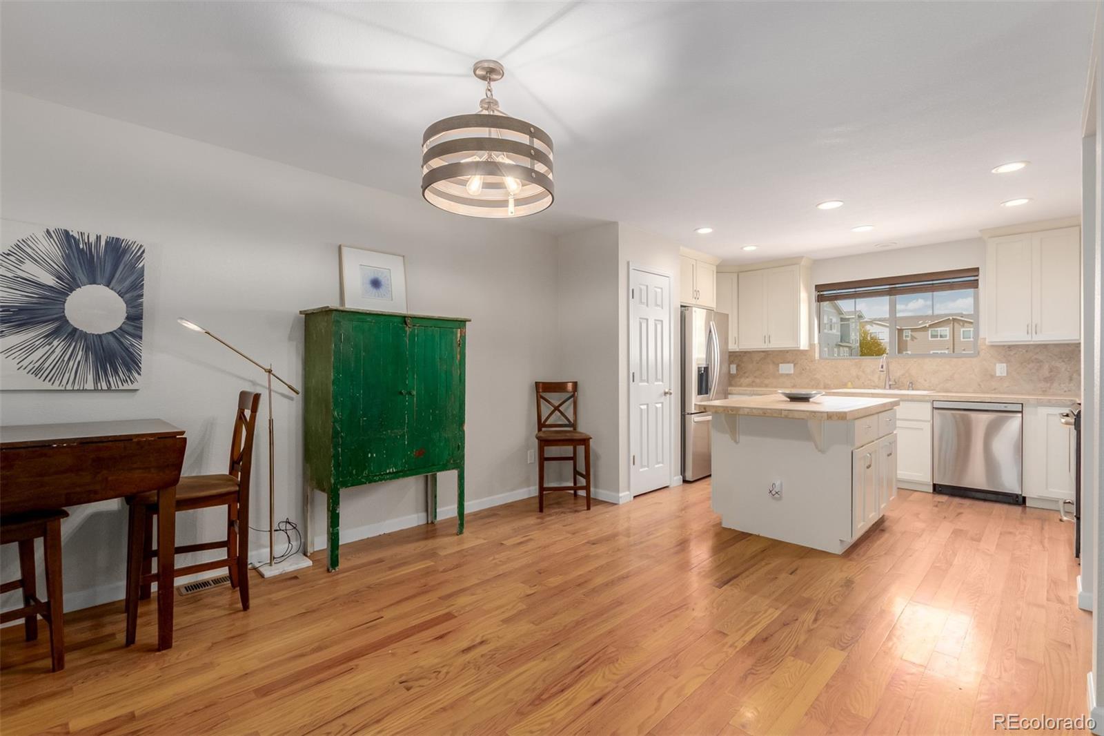 Welcome to this beautifully upgraded Kingsbridge townhome in highly desirable SW Longmont, where natural light and contemporary design create a bright, comfortable living space. This airy, open-concept home features high ceilings, spacious living and dining areas, and a graceful staircase that allows light to flow freely throughout. The pleasing kitchen includes recent stainless steel appliances, abundant counter space, and well-designed cabinetry. A tucked away laundry area with newer W/D and extra shelving adds convenience and functionality. Upstairs, the primary en suite bedroom welcomes the morning sun, while the second bedroom and flexible bonus room—ideal for a home office, workout space, or potential 3rd bedroom—offer partial views of Long’s Peak and the foothills. Contemporary lighting, window blinds, and fresh, neutral tones bring comfort and style to every room. Step outside to a welcoming deck and enjoy the peaceful surroundings. Access a beautiful greenway for walking and biking just steps from your door. An oversized two-car garage provides ample space for vehicles and gear, and the above-ground crawl space offers easy-access storage. The Kingsbridge HOA covers trash, recycling, water, sewer, roof and exterior maintenance and insurance, landscaping, and snow removal—so you can relax and enjoy low-maintenance living just 15 minutes from Boulder.