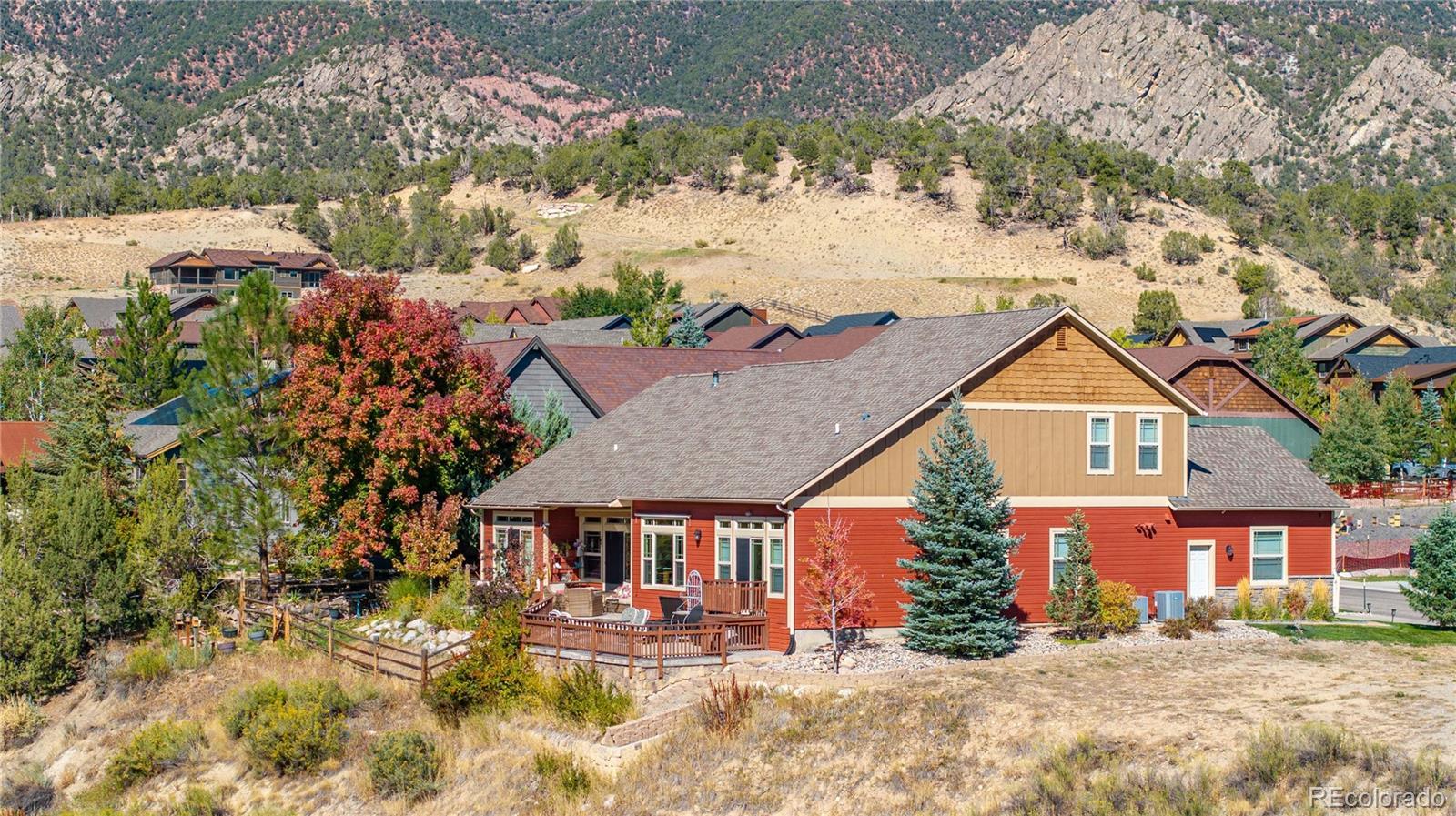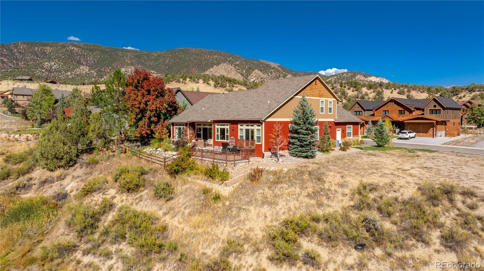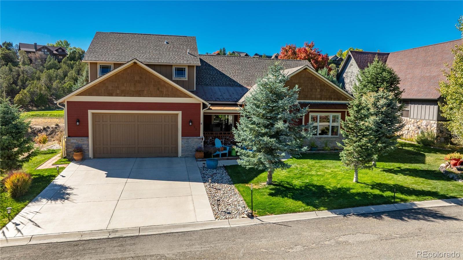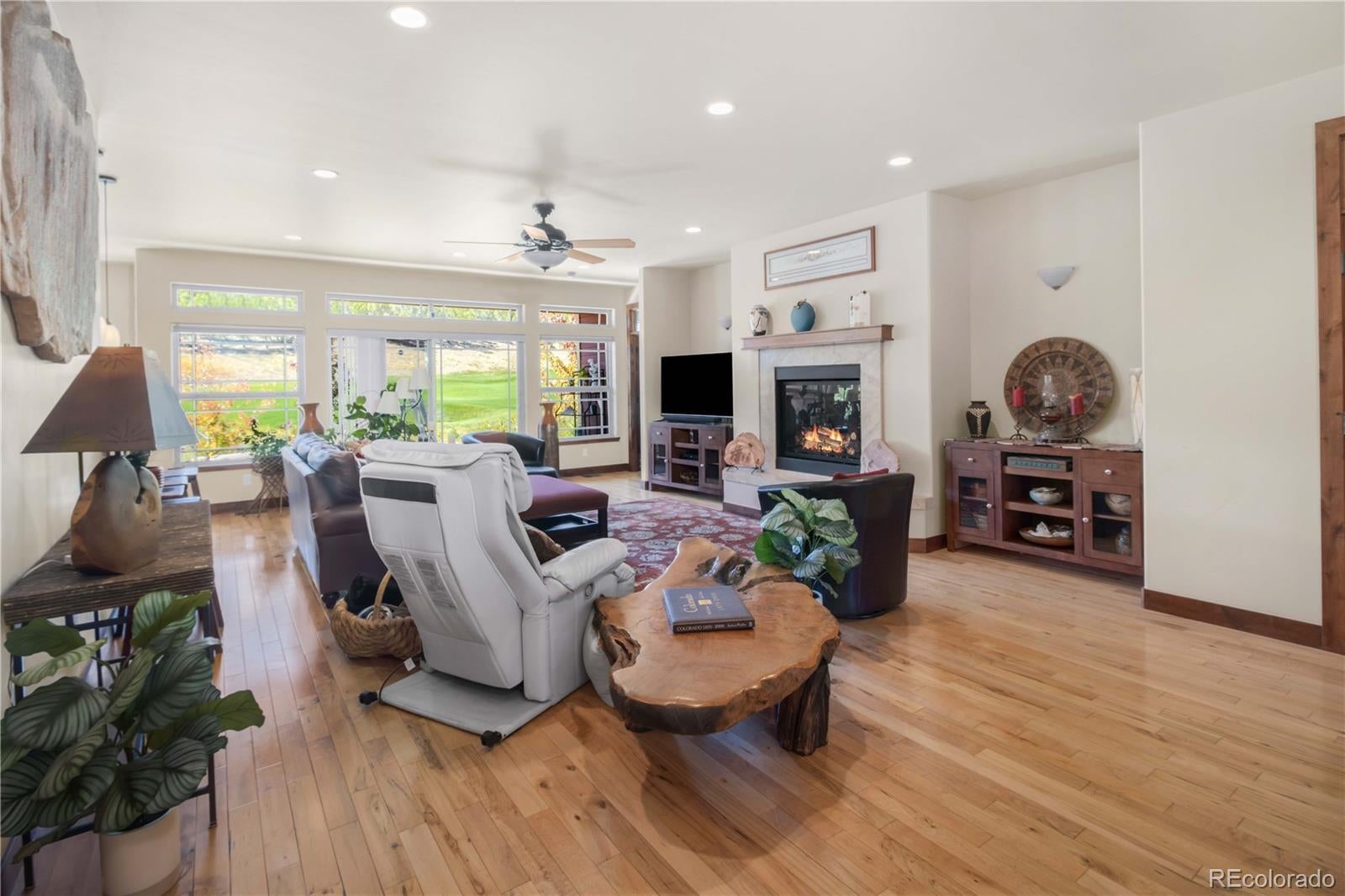 This home delivers a true WOW factor the moment you step inside, with incredible west-facing Lakota Golf Course views from nearly every room—all on one level. The open living, dining, and kitchen layout is designed to capture almost floor-to-ceiling views, creating a seamless connection to the outdoors. The guest bedroom features large windows and sliding doors that open to a charming balcony overlooking the expansive west-facing deck, while the primary suite offers sliding glass doors, peaceful golf course views, and the quiet stillness of mountain nights. Step out onto the full-length deck to watch the stars appear and listen to the crickets under Colorado skies. Set in a peaceful, friendly neighborhood, enjoy walking and biking trails right outside your door, excellent schools within walking distance, and a nearby dog park. A cozy covered front porch invites morning coffee or evening meals while neighbors pass by with kids, bikes, and dogs. With easy, low-maintenance landscaping, this home is perfect for a lock-and-go lifestyle—offering exceptional outdoor living and refined mountain-style elegance, highlighted by custom wood interiors and views, views, views!!