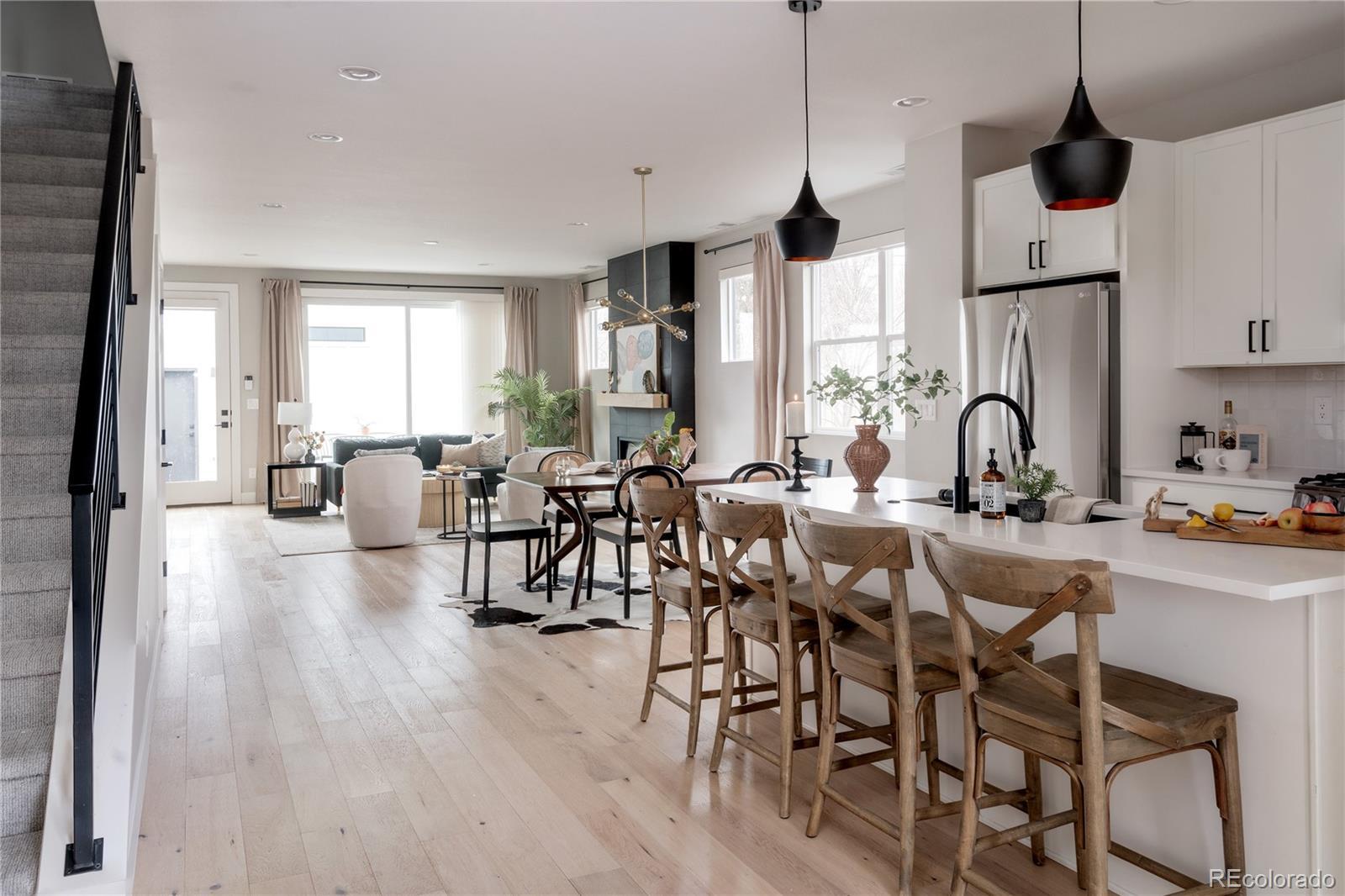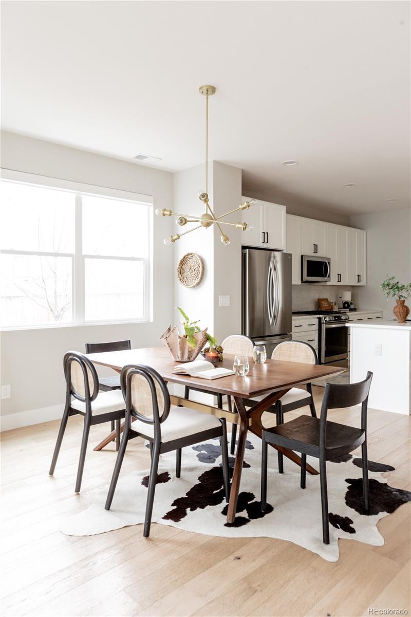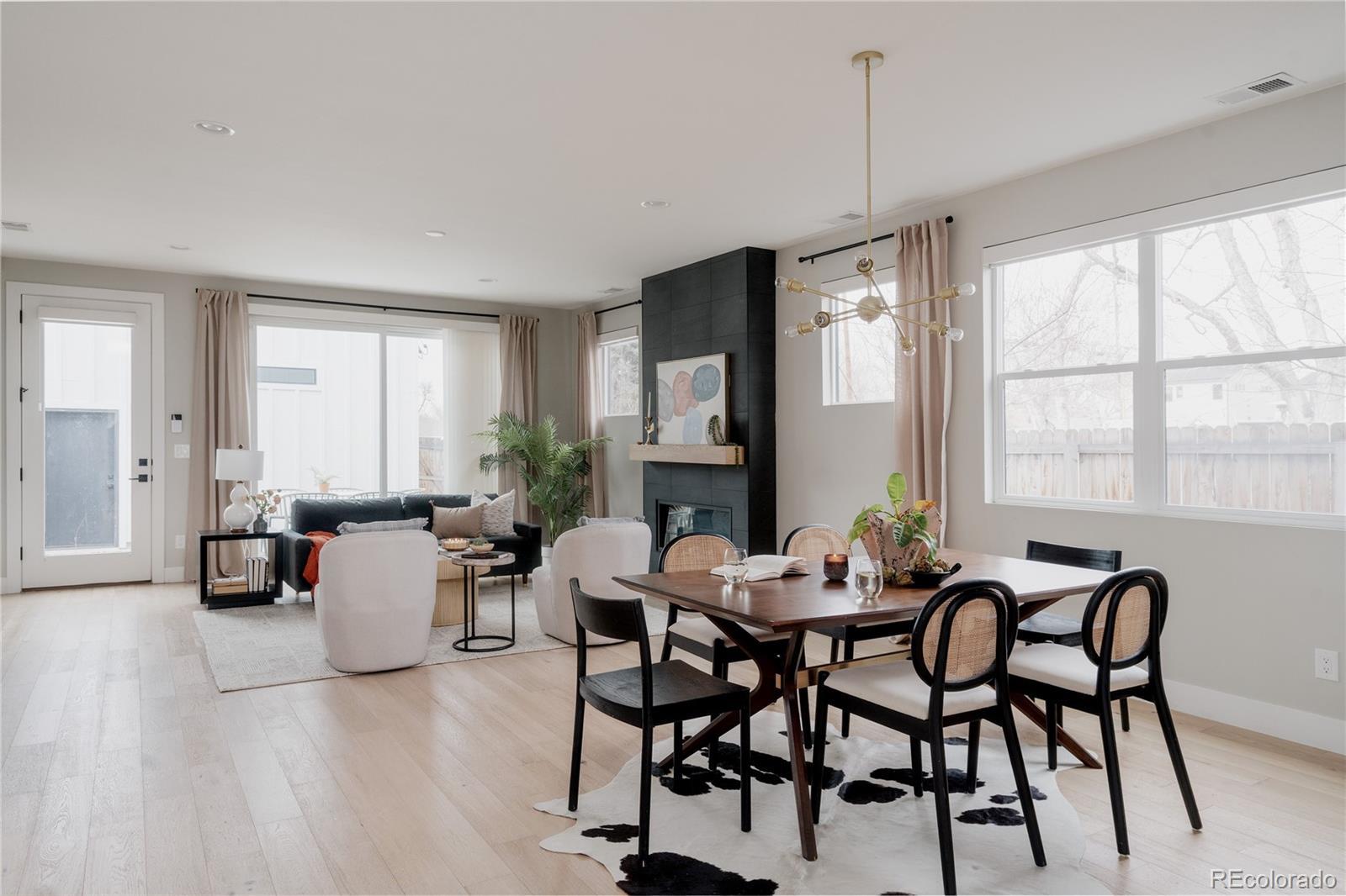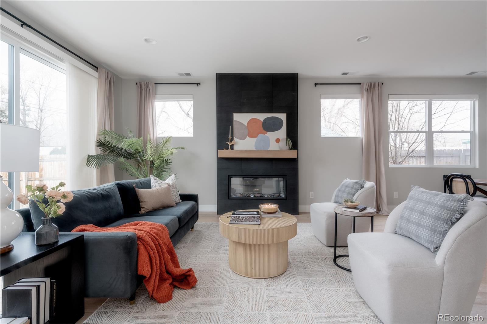 Light, bright, and airy, this south Englewood home offers clean modern style and a layout that truly works for everyday living. The open main level is filled with natural light from oversized windows, with high ceilings and solid wood floors that create a warm, cohesive feel throughout the great room, dining area, and kitchen. A fireplace anchors the living space and adds just the right amount of comfort and character. The kitchen is crisp and contemporary with white quartz countertops, LG stainless steel appliances, and generous prep space, all flowing easily into the main gathering areas for simple entertaining and daily life. One of the standout features is the upper level, with three generous bedrooms on the same floor. The primary suite includes a large walk-in closet by California Closets and a spacious, spa-inspired bath with custom tile and a glass block door. Two additional large bedrooms, a full bath, and upstairs laundry make the layout especially functional and convenient. The fenced backyard offers room for a fire pit, pets, and outdoor dining, with sprinkler systems in both the front and back for easy maintenance. A detached two-car garage with extra-high ceilings provides excellent storage potential. Located near South Broadway, you are moments from local dining, coffee shops, and some of the city’s most fun neighborhood spots, making it easy to enjoy both quiet residential living and Denver’s best urban experiences. Welcome home