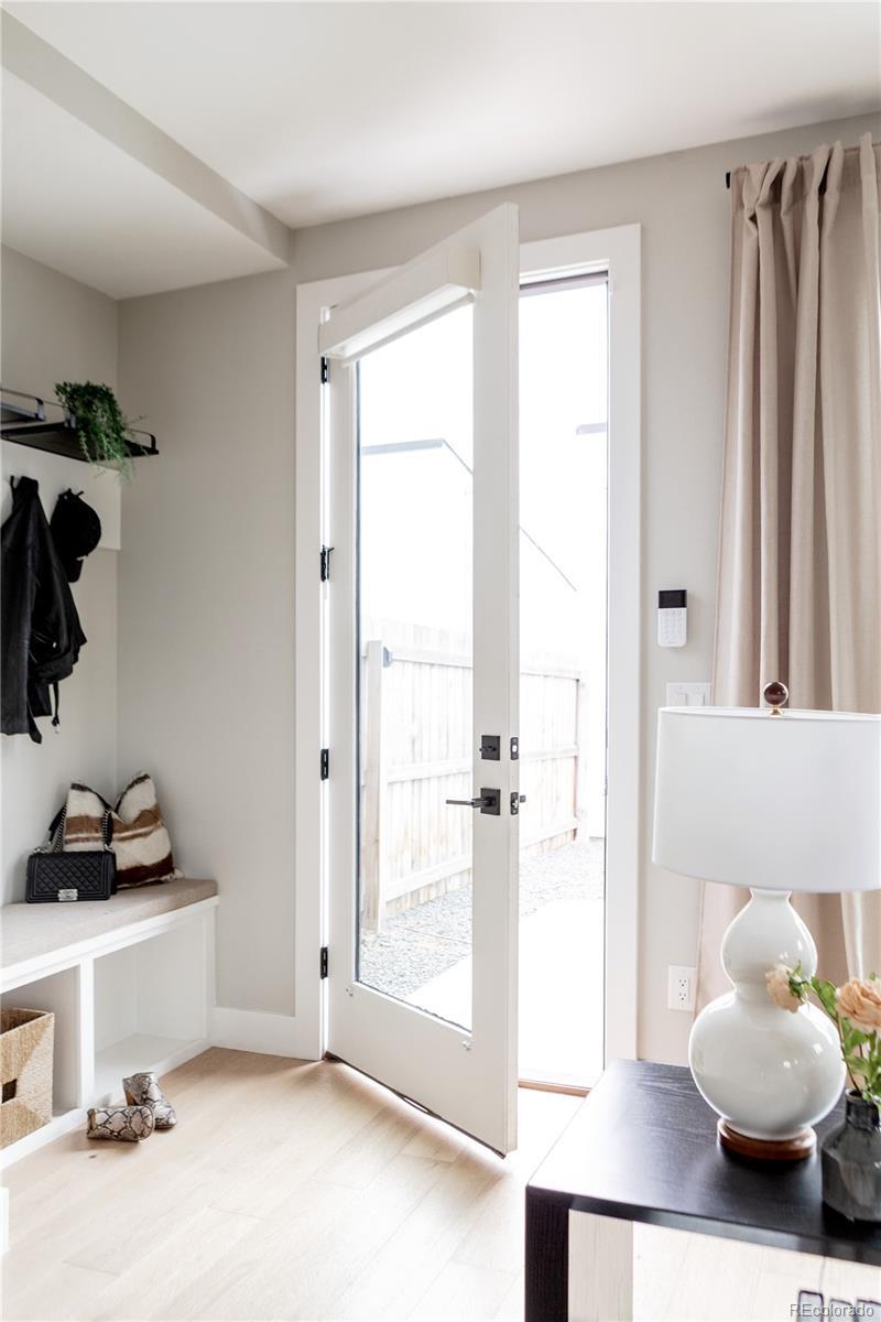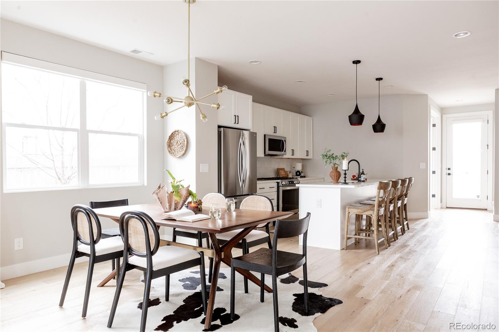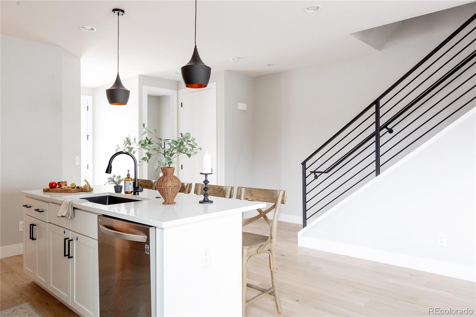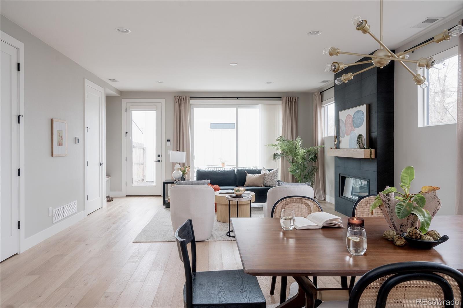 Light, bright, and airy, this south Englewood home offers clean modern style and a layout that truly works for everyday living. The open main level is filled with natural light from oversized windows, with high ceilings and solid wood floors that create a warm, cohesive feel throughout the great room, dining area, and kitchen. A fireplace anchors the living space and adds just the right amount of comfort and character. The kitchen is crisp and contemporary with white quartz countertops, LG stainless steel appliances, and generous prep space, all flowing easily into the main gathering areas for simple entertaining and daily life. One of the standout features is the upper level, with three generous bedrooms on the same floor. The primary suite includes a large walk-in closet by California Closets and a spacious, spa-inspired bath with custom tile and a glass block door. Two additional large bedrooms, a full bath, and upstairs laundry make the layout especially functional and convenient. The fenced backyard offers room for a fire pit, pets, and outdoor dining, with sprinkler systems in both the front and back for easy maintenance. A detached two-car garage with extra-high ceilings provides excellent storage potential. Located near South Broadway, you are moments from local dining, coffee shops, and some of the city’s most fun neighborhood spots, making it easy to enjoy both quiet residential living and Denver’s best urban experiences. Welcome home