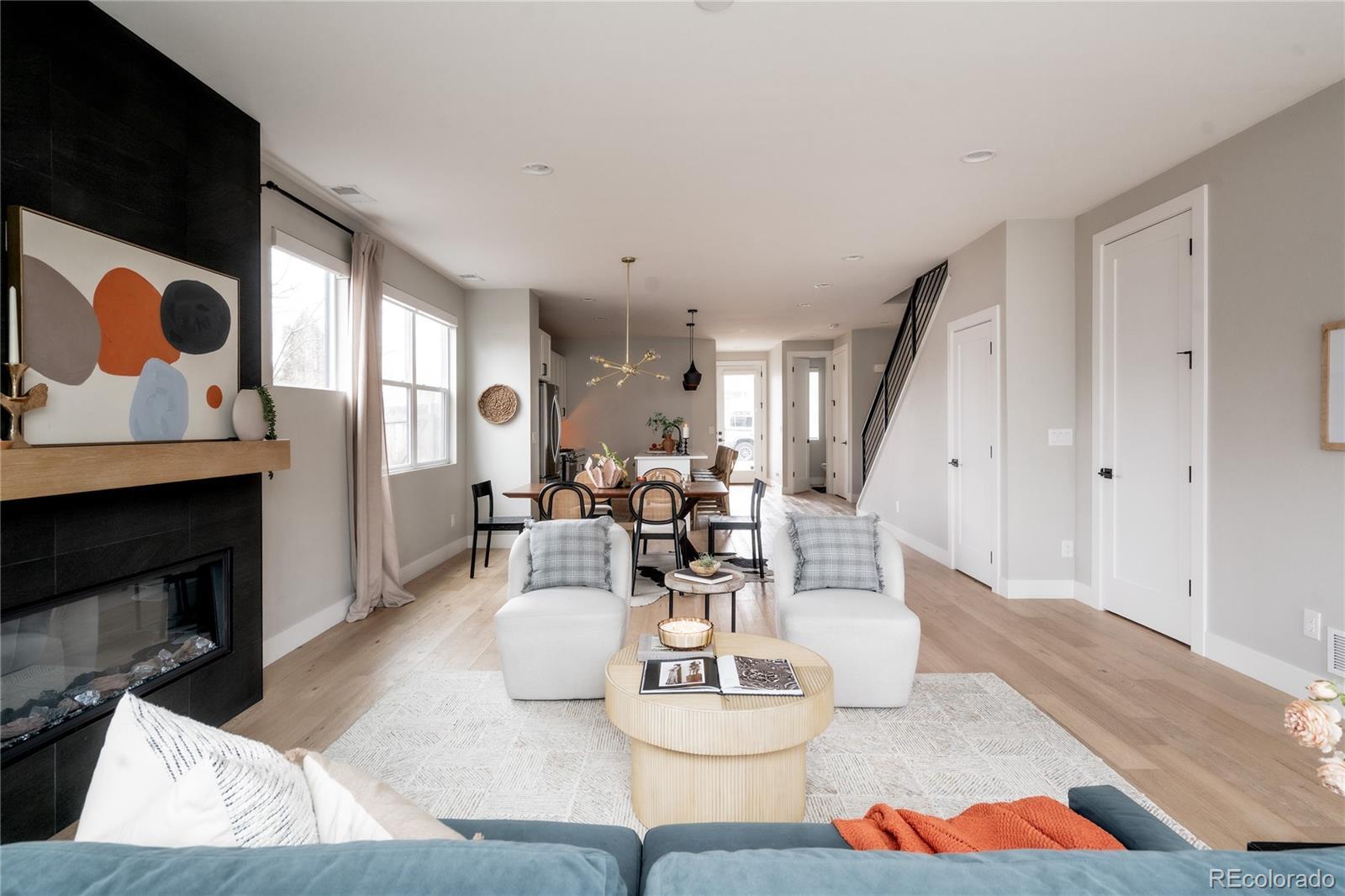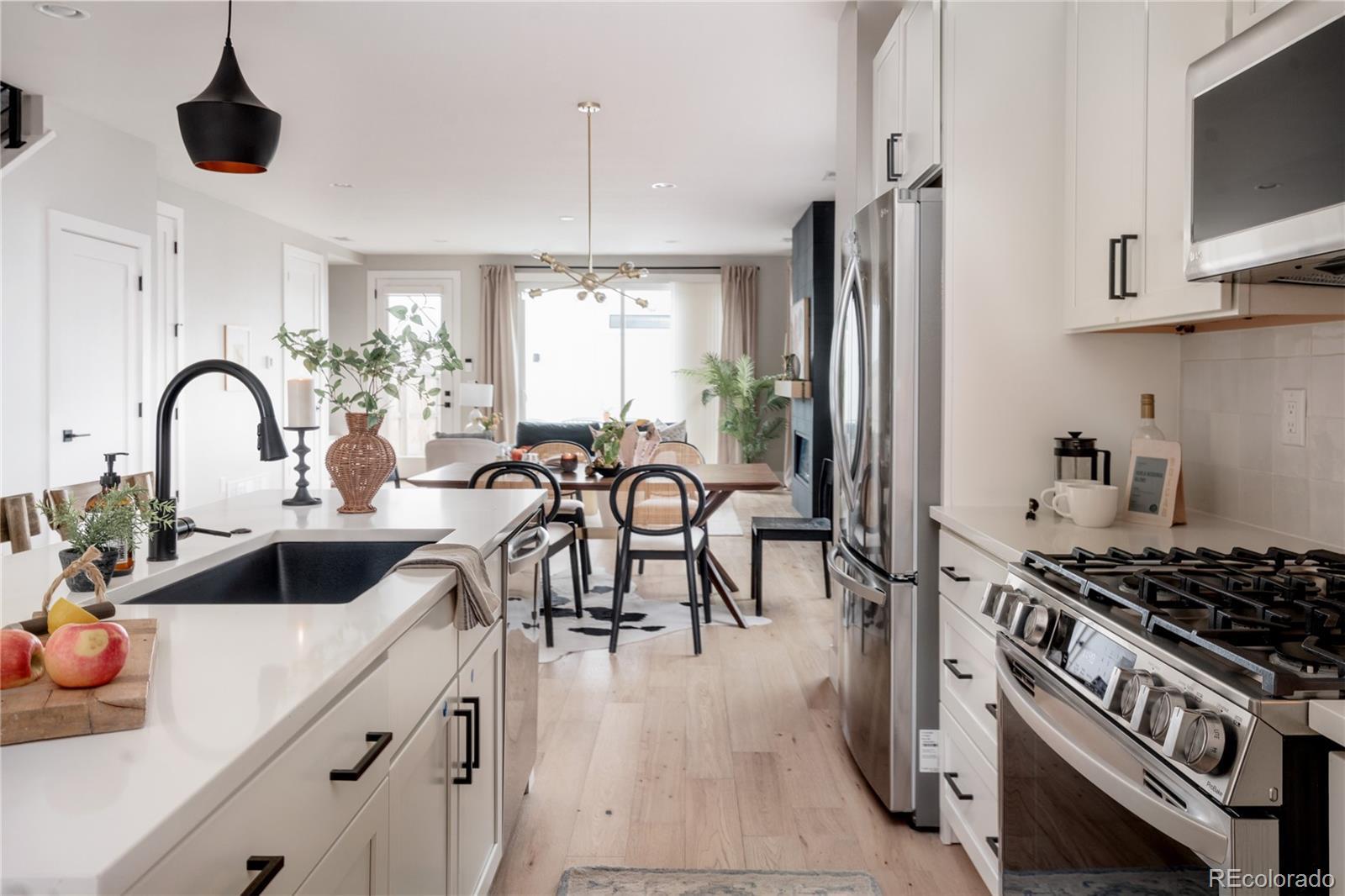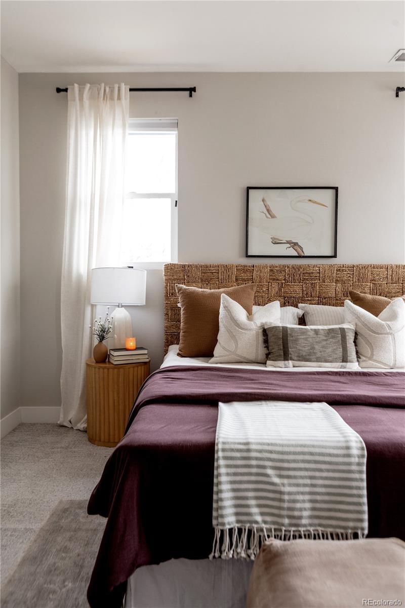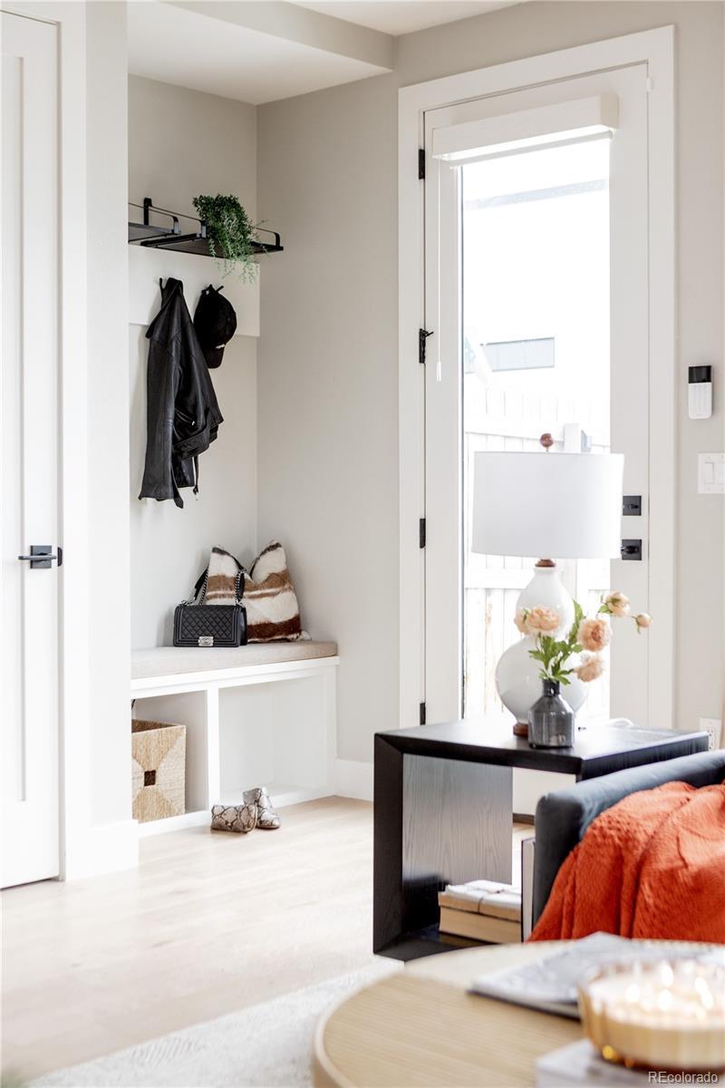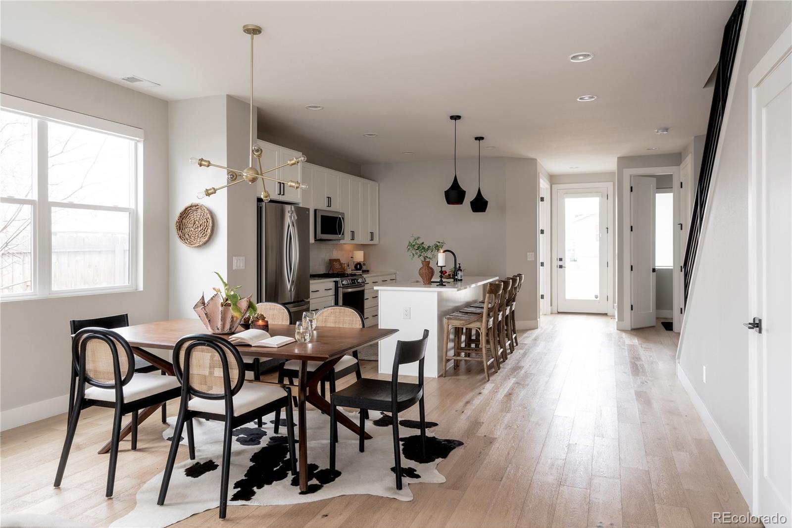 Light, bright, and airy, this south Englewood home offers clean modern style and a layout that truly works for everyday living. The open main level is filled with natural light from oversized windows, with high ceilings and solid wood floors that create a warm, cohesive feel throughout the great room, dining area, and kitchen. A fireplace anchors the living space and adds just the right amount of comfort and character. The kitchen is crisp and contemporary with white quartz countertops, LG stainless steel appliances, and generous prep space, all flowing easily into the main gathering areas for simple entertaining and daily life. One of the standout features is the upper level, with three generous bedrooms on the same floor. The primary suite includes a large walk-in closet by California Closets and a spacious, spa-inspired bath with custom tile and a glass block door. Two additional large bedrooms, a full bath, and upstairs laundry make the layout especially functional and convenient. The fenced backyard offers room for a fire pit, pets, and outdoor dining, with sprinkler systems in both the front and back for easy maintenance. A detached two-car garage with extra-high ceilings provides excellent storage potential. Located near South Broadway, you are moments from local dining, coffee shops, and some of the city’s most fun neighborhood spots, making it easy to enjoy both quiet residential living and Denver’s best urban experiences. Welcome home