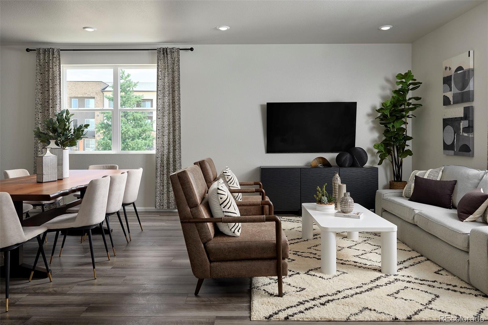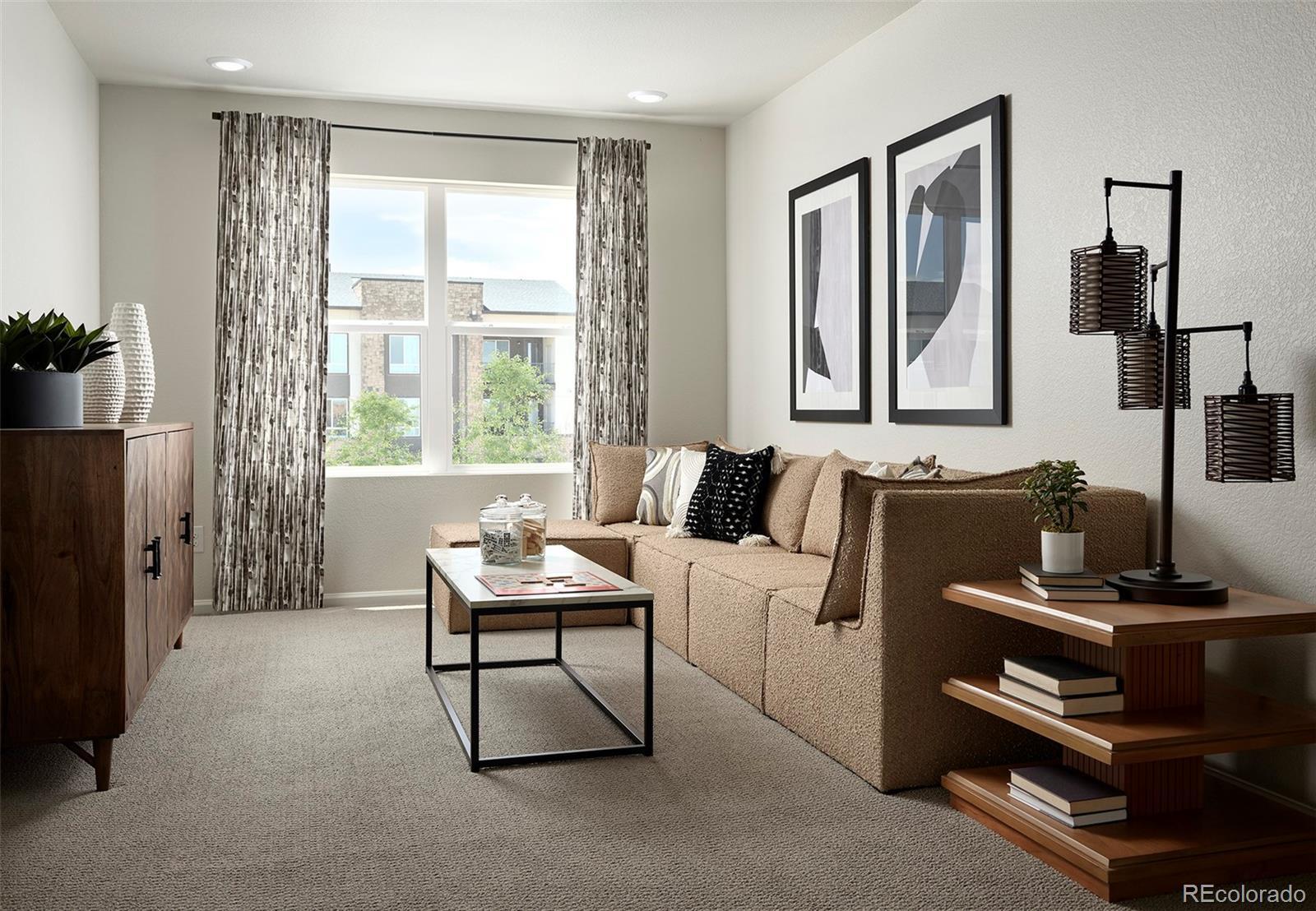 Open concept kitchen with quartz countertops and white cabinets! The Woodland is a stylish end-unit townhome featuring an open-concept main floor and a welcoming covered front porch. Upstairs offers a private primary suite with walk-in closet, plus two additional bedrooms and a versatile landing space. With 2.5 baths and a two-bay garage, this design blends comfort and functionality. The Meritage Home difference includes spray-foam insulation, advanced air filtration for year-round comfort and healthier air, and durable cementitious siding known for its strength, fire-resistance, and long-lasting performance. A Whirlpool appliance package, and full home blinds are also included for move-in convenience. Welcome home where every detail is built for comfort, efficiency, and LIFE. BUILT. BETTER. Horizon Uptown is a walkable, master-planned community in Aurora featuring parks, a dog park, and tennis courts. Located at I-70 and E-470, it offers quick access to Denver International Airport, downtown Denver, the Fitzsimons Innovation Community, the Denver Tech Center, and major entertainment destinations. *This home qualifies for special incentives through builder preferred lender for a limited time. Terms and conditions apply. See sales counselor for details! *This was a model home; any furniture is not included.