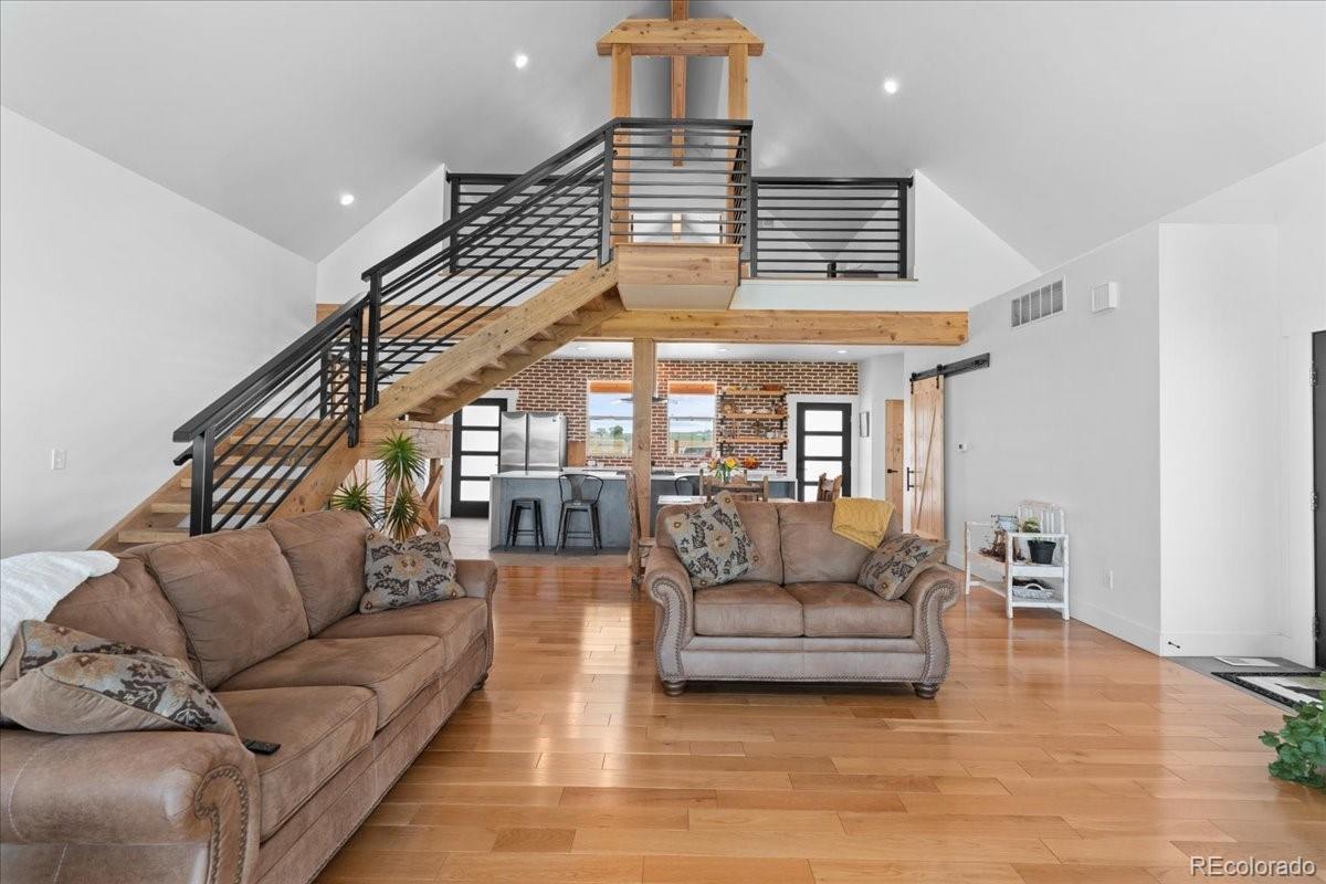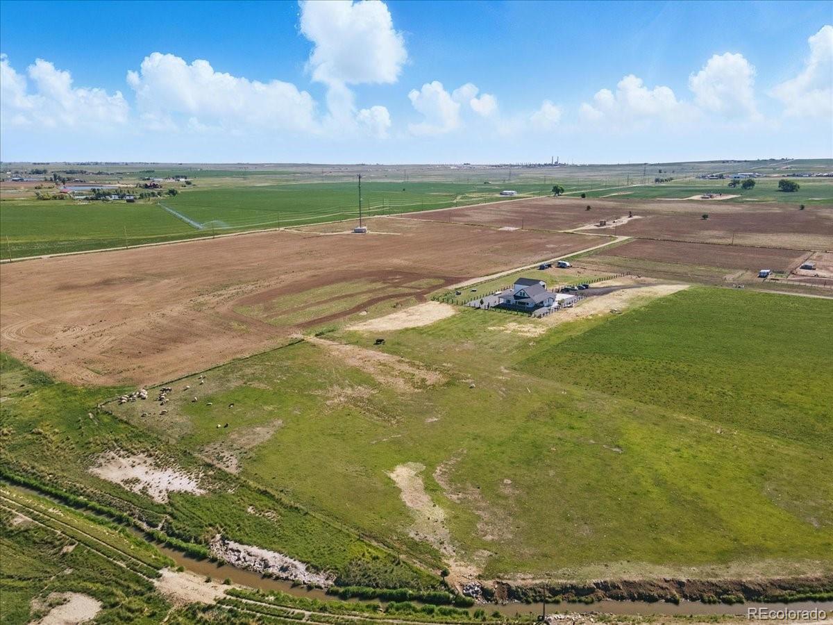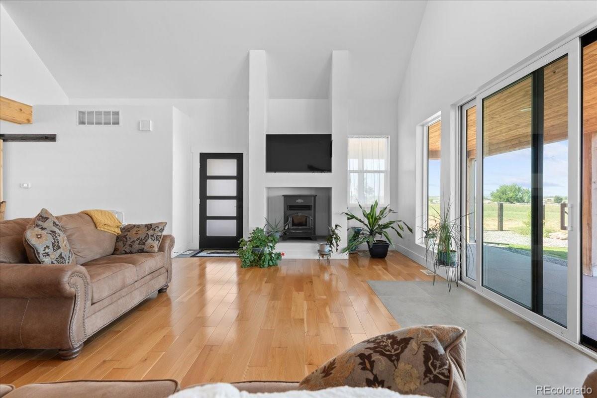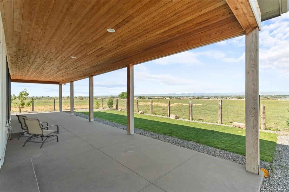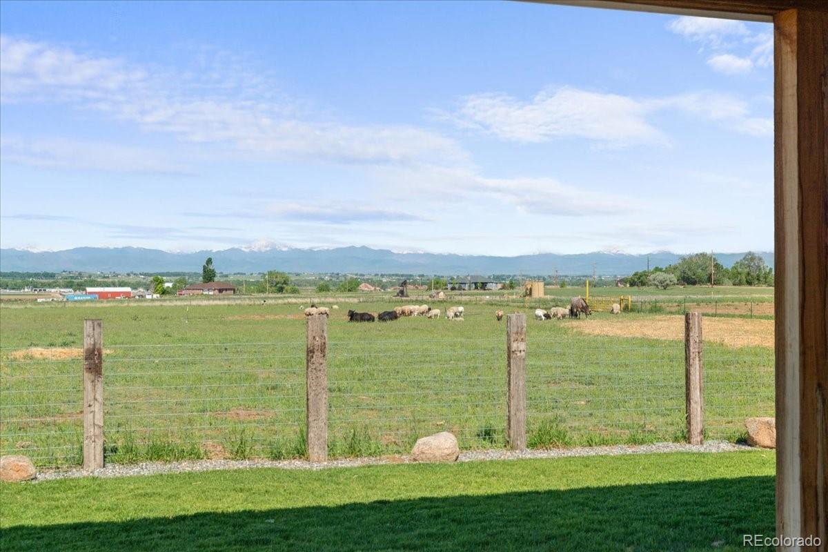 Tucked away behind a private gate, on 6.15 serene acres zoned Agricultural/Residential, this custom home offers the rare blend of rural privacy and refined living-framed by spectacular Rocky Mountain views. The exterior welcomes you with custom railroad tie and hog wire fencing, two expansive covered front patios with warm tongue-and-groove pine ceilings, and a massive backyard covered patio with sand-coated concrete. A well pump and water hydrant sit conveniently on the north side, supported by a full sprinkler and drip system. Step inside to a spacious foyer with tile flooring, coat closet, and rich 3-panel Alder doors with brushed bronze accents. The home's hypoallergenic design features solid hardwood floors and tile throughout, illuminated by double-pane energy-efficient windows. The open kitchen, ideal for both daily living and entertaining, boasts quartz countertops, a waterfall-edged center island, dual barn-doored pantries, soft-close drawers, stainless appliances-including a gas range with flat grill-and direct front patio access. The family room's vaulted ceilings and King pellet stove set the stage for mountain-view relaxation. The primary suite offers backyard access, dual walk-in closets, and a spa-inspired bath with quartz, overhead and wand shower, and dual lifted vanities. Additional main-level highlights include two hardwood-floored bedrooms (one with stunning views), a Jack-and-Jill bath, a corner office, guest half bath, and spacious laundry with washer/dryer included. A grand iron-railed staircase leads to a vaulted loft, 3/4 bath, and private guest bedroom with French doors. Mechanical excellence includes a Navien tankless water heater, Rheem water softener/filtration, Goodman A/C, and a 1,000-gallon owned propane tank. The oversized 1,094-sq-ft garage features a standard double door and a 12' RV door-ready for all your Colorado adventures.E-mail brokers for additional information or to schedule a showing.