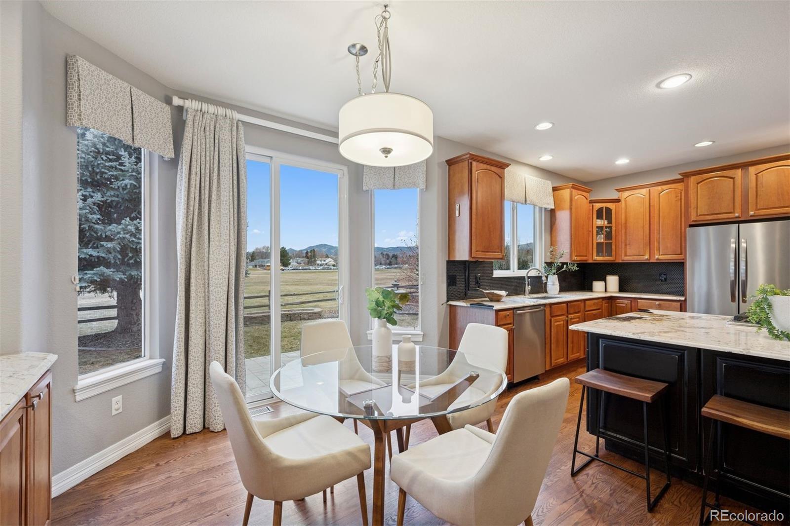 Welcome to 7079 S Garrison St, a stunning 5-bedroom, 4.5-bath sanctuary in desirable Hillside at Stony Creek, in southwest Littleton. Modern elegance meets eco-conscious living in this 4,361 sq ft gem that boasts breathtaking mountain views from large picture windows, an expansive 3-car garage, two private home offices, a large, finished basement, and more. The open-concept main floor layout shines with the first home office space, an elegant dining area, cozy living room featuring a stone gas fireplace, and the heart of the home; the gourmet kitchen with warm wood cabinets, a gas cooktop island, and casual dining area overlooking the private back yard. Upstairs, a massive primary suite is an ideal retreat with soaring mountain views and large five-piece bath with dual vanities. Down the hall two large bedrooms and another bath, while a fourth upper floor bedroom has an en-suite bath. The second private home office (or playroom, library, den) completes the upper floor. The large, finished basement is ideal for entertaining, with built-in bar-height seating and a thoughtfully designed wine room, plus a fifth bedroom and bathroom. A large solar panel system covers nearly all electrical needs, slashing utility bills, and the stamped concrete patio and included hot tub invite outdoor relaxation amid the foothills. Backing to Deer Creek Middle School, the property enjoys wide open spaces just beyond the private backyard, ensuring a sense of privacy with no immediate neighbors to the rear. Located just 1.5 miles (5 min) from Southwest Plaza for premier shopping and dining, 5 miles (10 min) from Aspen Grove Shopping Center's boutique stores, and blocks to Wingate South Park's trails and playgrounds (0.5 miles). Adventure awaits at Deer Creek Canyon Park (6 miles, 15 min) for hiking, and Chatfield Reservoir in Chatfield State Park (4.5 miles, 10 min) for boating and open spaces. Close to Colorado mountain skiing (60 miles, 1 hour). Don’t miss out on this amazing home!