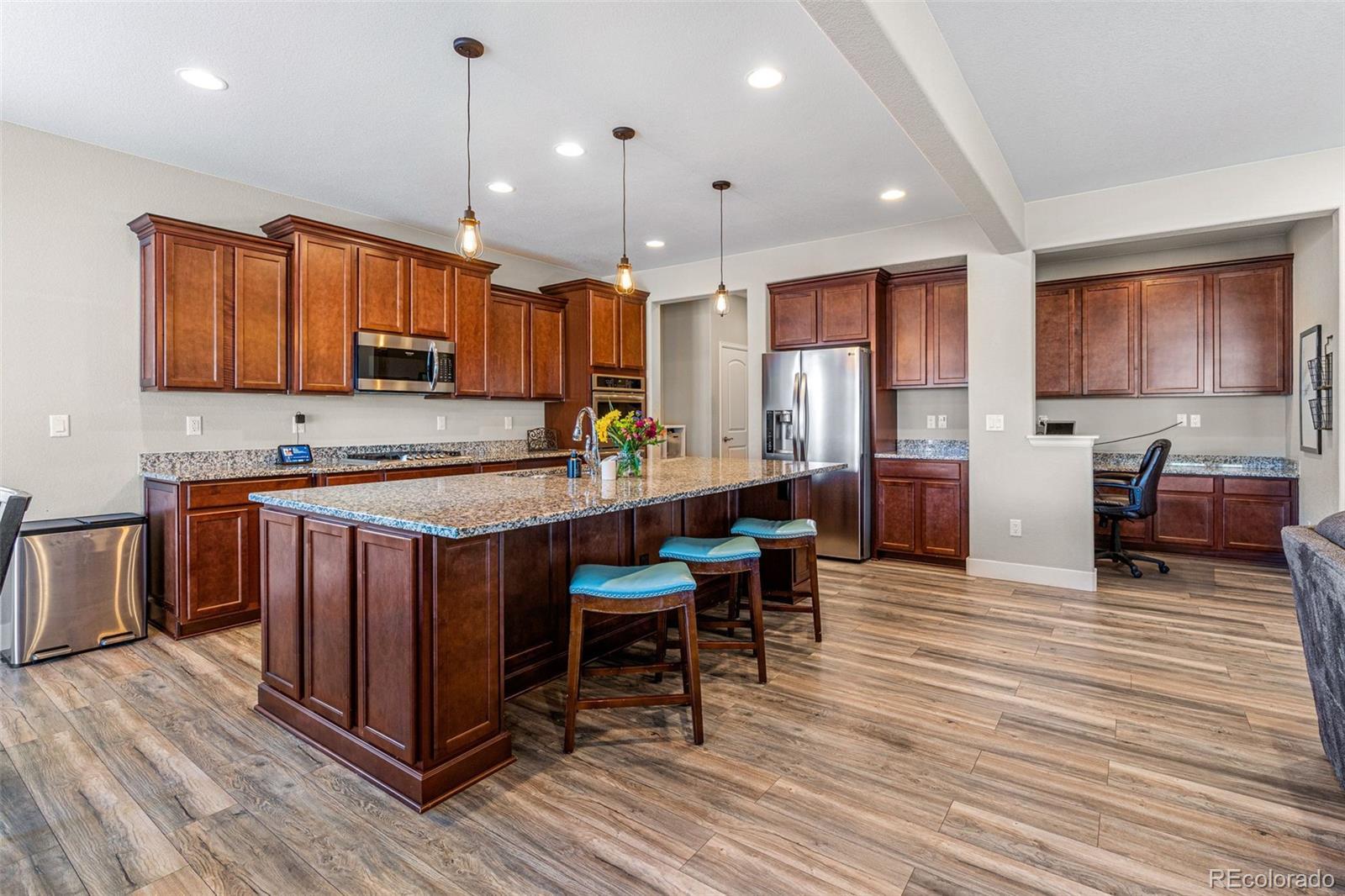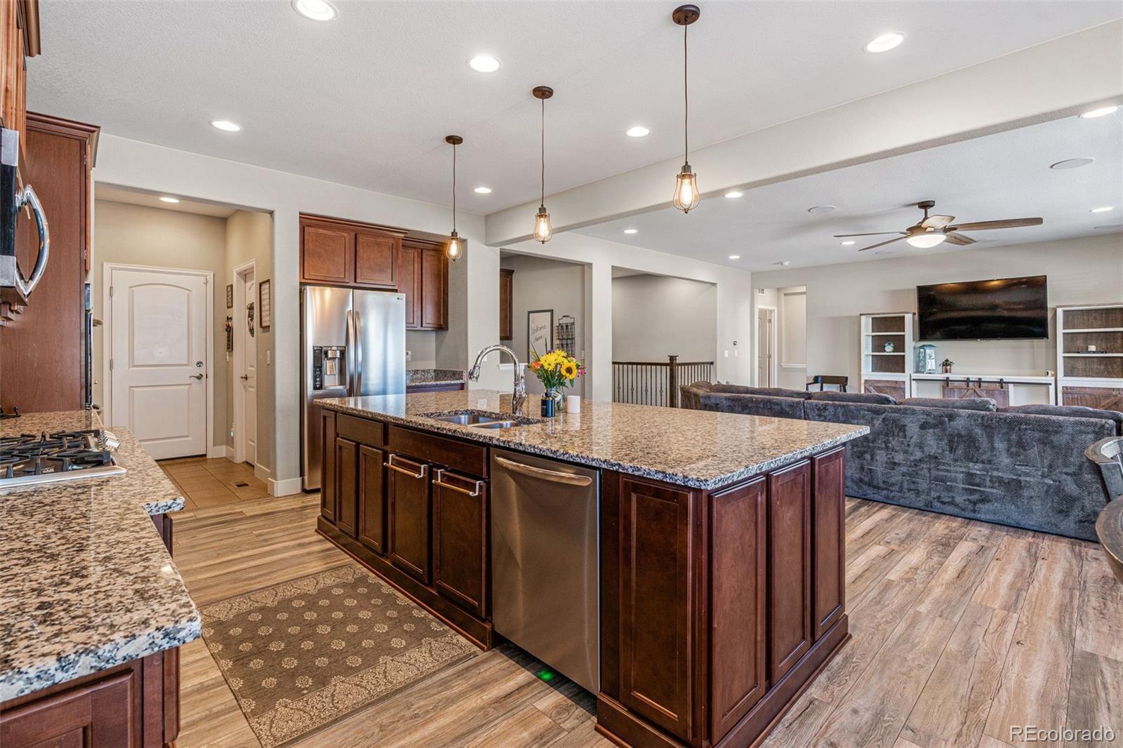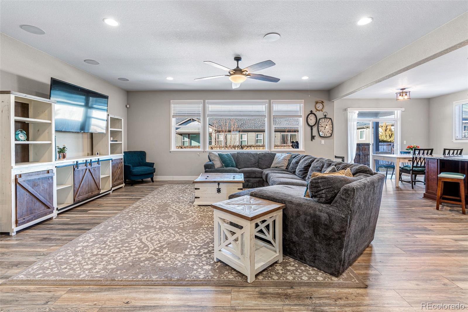 Price improved and a $13,500 homebuyer credit! Seller is offering $13,500 toward closing costs or interest rate buy-down, an excellent opportunity to reduce your monthly payment or out-of-pocket costs. This well-designed, ranch-style home is perfectly suited for those seeking newer, spacious and versatile living spaces. Delight in a rarely offered, main-floor primary suite, and a finished basement featuring a basement suite complete with a fully functional kitchen, bedroom, and bathroom. When you enter the home you are greeted by a foyer that leads into the open floor plan, including a gourmet kitchen, equipped with double ovens for culinary enthusiasts. Entertain effortlessly with prewired speakers for surround sound in the living room and an extended covered back patio for outdoor gatherings. The basement impresses with its versatility, creating a great space for entertaining guests or offering the option of combined family/multigenerational living. In addition, the basement offers ample storage and additional unfinished space to add more bedrooms, a gym, or any other flex space you can think of. Southwest-facing, this property offers natural light throughout, great snow melt in the winter, and picturesque mountain views from both the kitchen and the back patio. A great home in a great location with a 3 car garage! Only 15 minutes to DIA, 20 minutes to Downtown Denver, and within the Villages at Buffalo Run, a premier golf course community. Call listing agent, Amanda Sheppard, to ask how this $13,500 Seller credit may be used to lower your monthly payment!