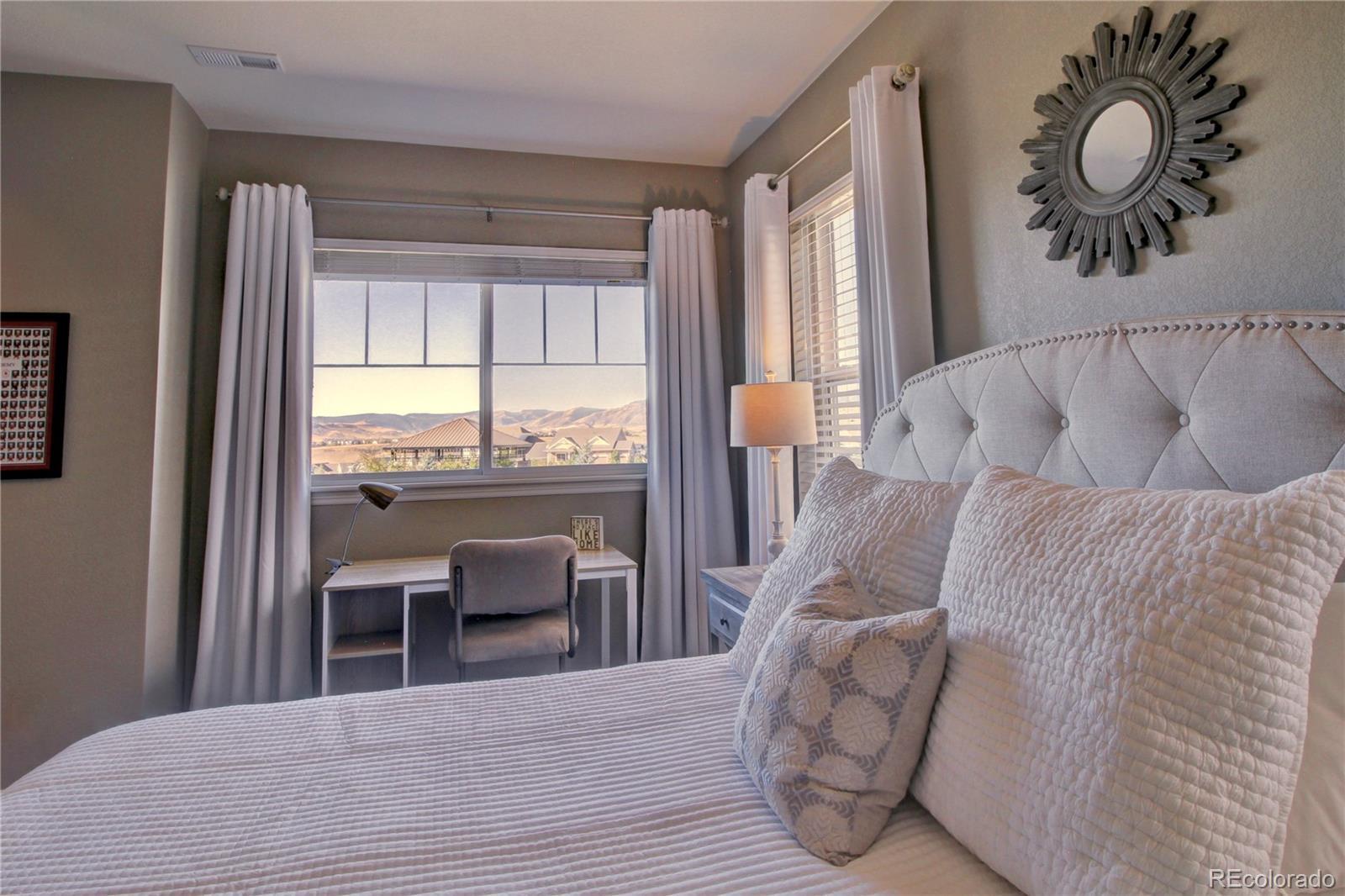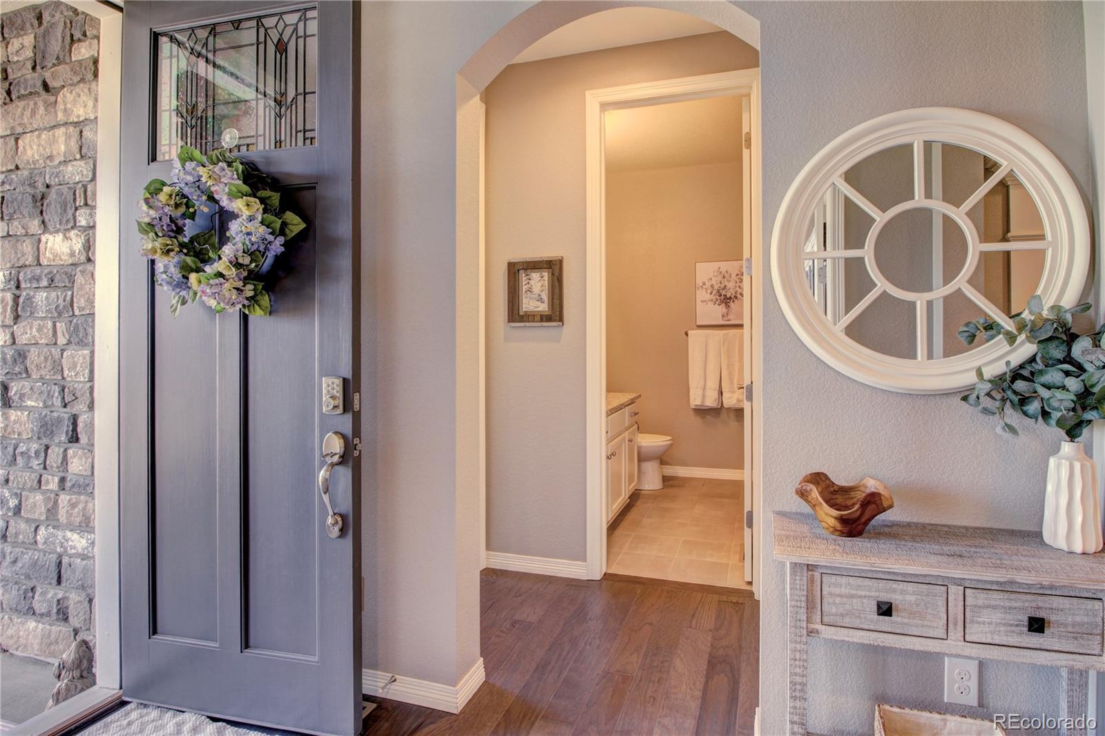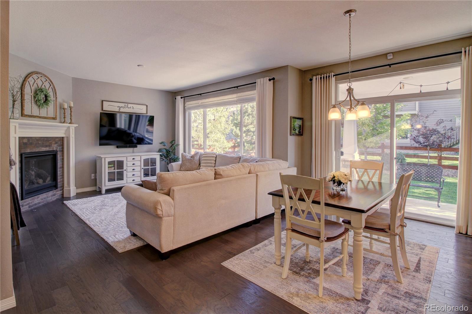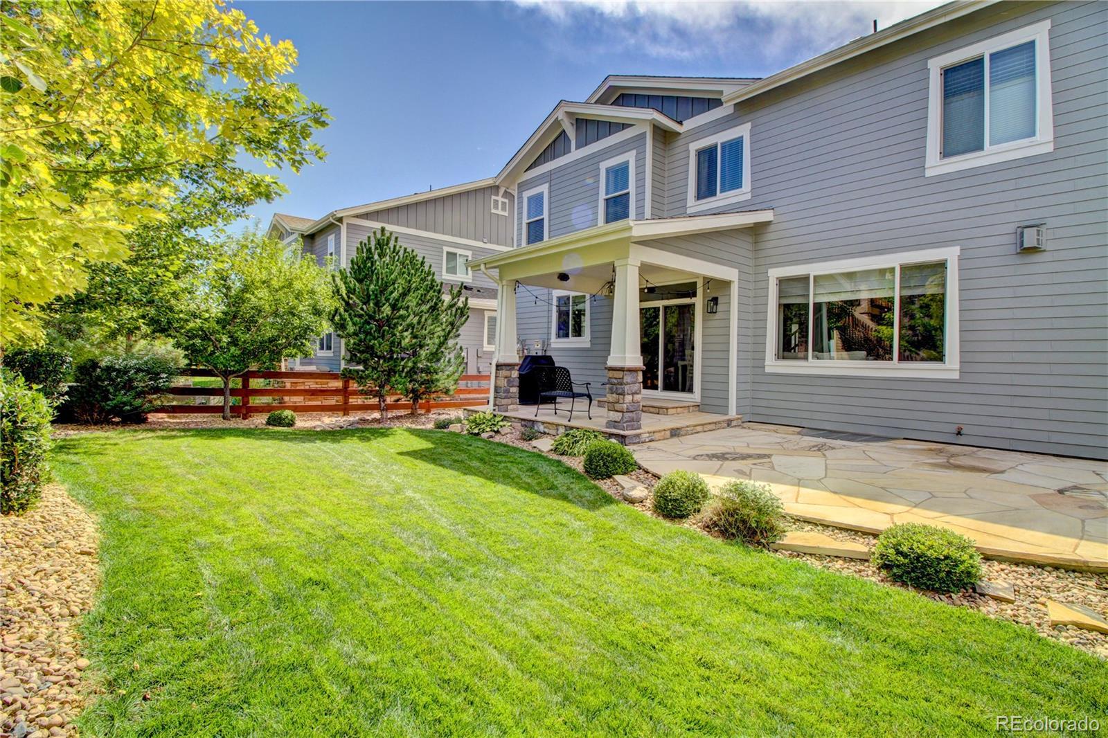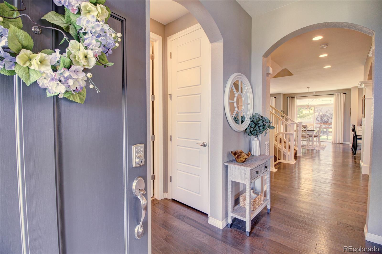 Welcome to this premier 2-story DR Horton home, perfectly situated in one of Arvada’s most sought-after neighborhoods, Leyden Rock! With a prime location directly across from Daybreak Park & stunning mtn. views, this home combines beauty, comfort & convenience. Step inside to rich dark hardwood flooring & the inviting warmth of a gas stone fireplace, setting the tone for relaxation. The main level features a guest bdrm and an office/den, along w/ upgraded finishes throughout, including 8-ft entry & interior doors. The chef’s kitchen impresses w/ upgraded tall cabinetry featuring soft-close doors & drawers, crown molding, under-cabinet lighting, a gas cooktop, pot filler, dual ovens, coffee bar, abundant counter space; perfect for cooking & gatherings. Upstairs, a spacious family/loft room offers addt'l living space for relaxation or play. The primary suite is a serene retreat complete w/ a generous sitting room & 2 large closets & ample storage. Second floor formal & finished laundry room w/ cabinet & shelf space, plus two additional bdrms connected by a Jack-n-Jill bath. Lrg. unfin. basement provides room to grow, plumbed for a future bath and ready for your customization. The 3-car tandem garage ensures ample parking & storage options. Enjoy breathtaking Colorado views from your cozy, S facing front porch, perfect for soaking up sunshine. The fenced backyard features an expanded flagstone patio with plenty of room for a firepit or hot tub, along with mature trees for added privacy. Garage is finished w/ insulation & drywall & epoxy floor. The paid-off solar panels keep electric bills to a minimum. Located in an amenity-rich community, you’ll enjoy access to 3 parks within walking or biking distance, 17 miles of hiking & biking trails, a community pool and clubhouse. The HOA hosts regular social events including food trucks, holiday gatherings, & movies in the park; something for all ages to enjoy. All of this is complemented by a highly rated school district.
