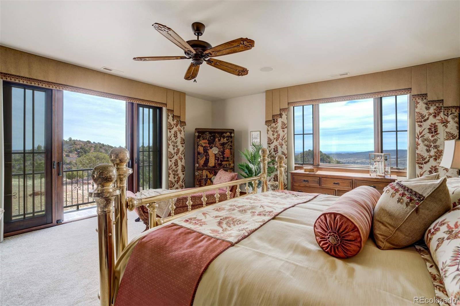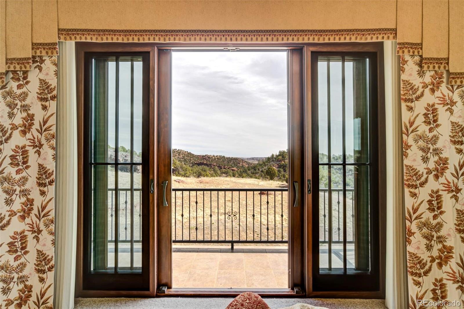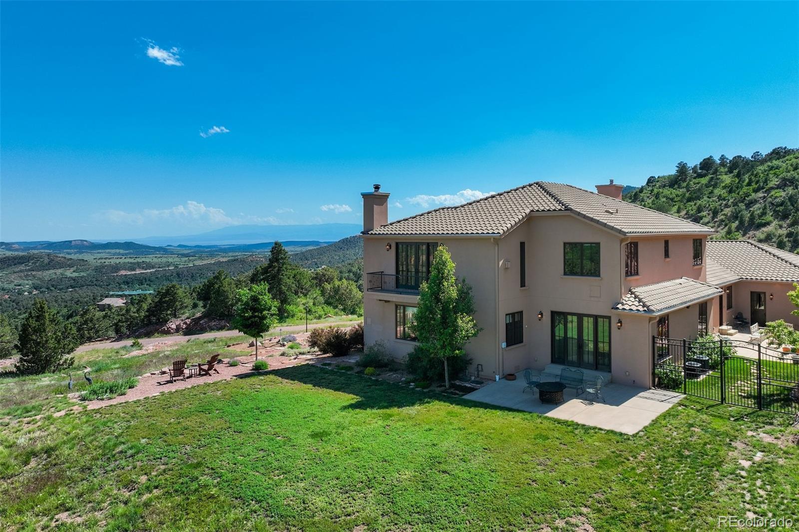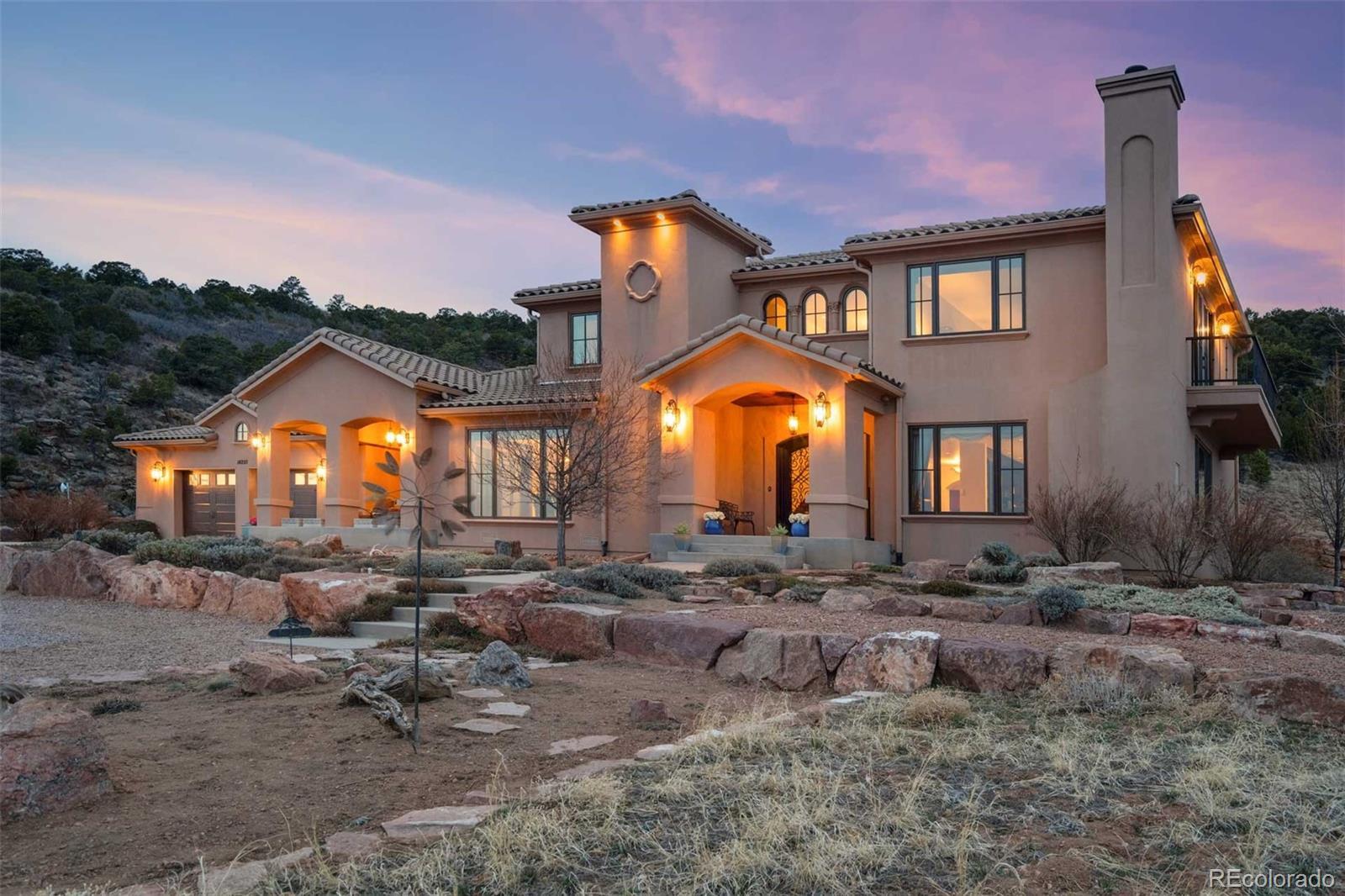 This exquisite Spanish Colonial Revival gem on 36 acres in the exclusive gated community of Turkey Canon Ranch Estates is tucked in the foothills of Colorado’s Front Range. Flanked on two sides by Aiken Canyon Nature Preserve, a Nature Conservancy Property, this home is in a landscape of shrublands, grass prairie, pinon, juniper, red rock formations, & mixed conifer forest. Subtle & elegant, this Spanish Colonial Revival home features Spanish-style arches, and wrought iron elements including a custom wrought iron double entry front door, railings, & ornate wrought iron patio gate, period light fixtures, hand-painted murals in the kitchen & each dining area, custom arched windows, hand-trowel wall finish throughout & a raised quatrefoil detail on the exterior accentuating the Spanish Colonial charm. A chef’s kitchen features a Stanley Waterford wood cook stove made in Ireland, a 6-burner gas range top, double oven, a warming drawer, quartz countertops, kitchen island w/cabinets on 2 sides & seating, baking height counter, Sub-Zero fridge, vegetable sink, walk-in pantry, breakfast area, & door to covered front veranda. The living room features a wood stove w/granite surround & a library w/floor-to-ceiling cherry built-in cabinets, cherry paneling, cozy window seat, & space for game table. The family room walks out to a second patio & is open to the formal dining room. The main patio area features a natural red rock wall & fabulous gas fireplace. The laundry/mud room, 2 baths, and a bedroom/office are all on the main level. Access to the second floor is provided by either elevator or stairs. The primary bedroom features a gas fireplace w/granite surround, a private balcony, ensuite bath w/steam shower, jetted tub, floor to ceiling marble, double sinks & walk-in closet. The home has radiant heat, AC, 9' ceilings, 8' doors, Pella windows, and has panoramic views of the Spanish Peaks & Wet Mountains. The HOA dues provide access to BLM at the back of Turkey Canon Ranch.