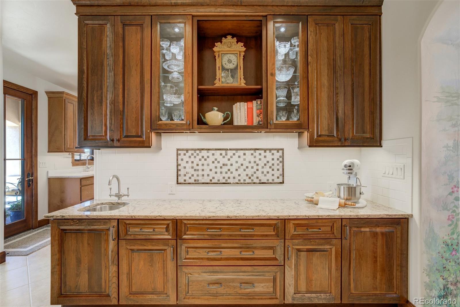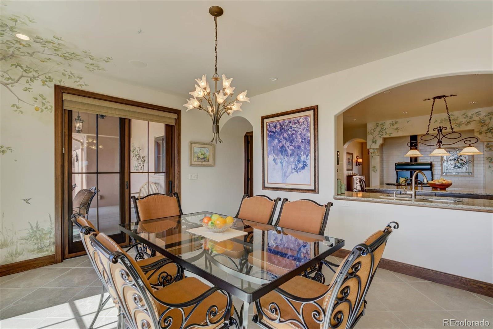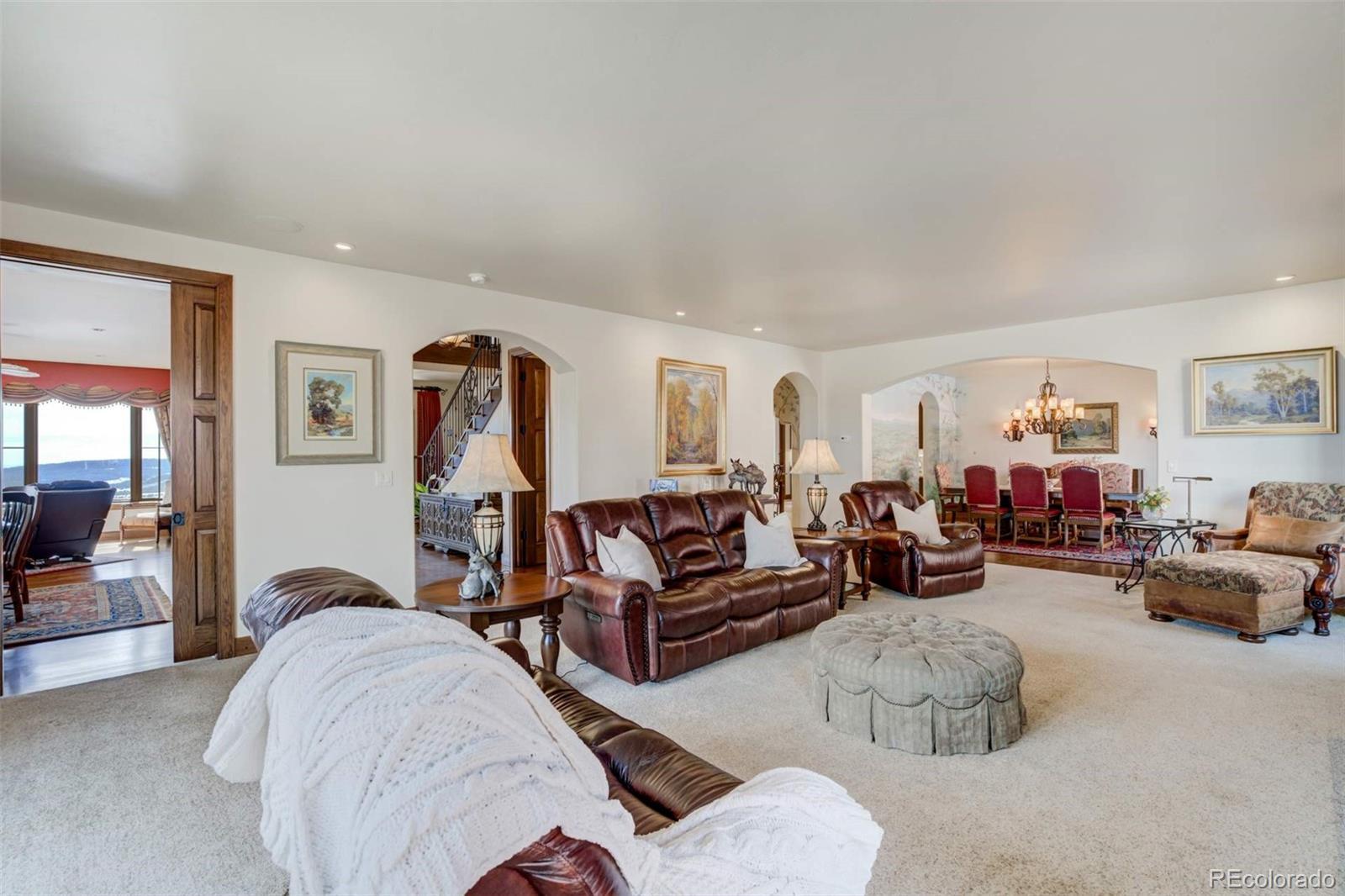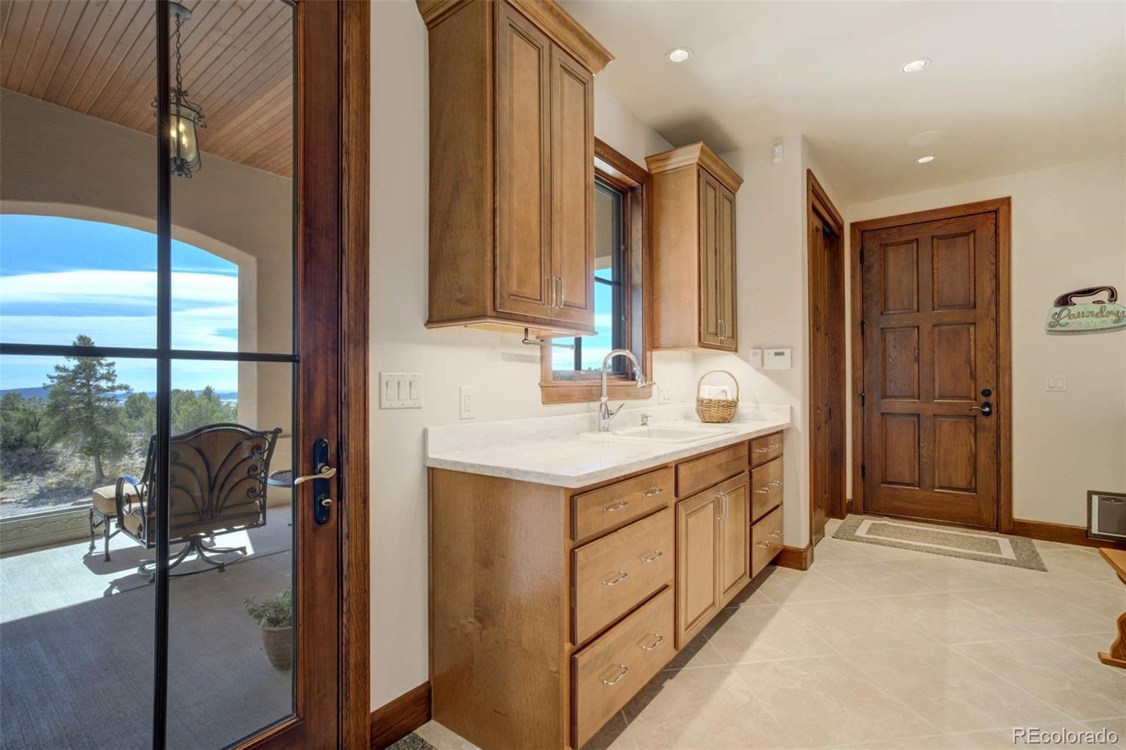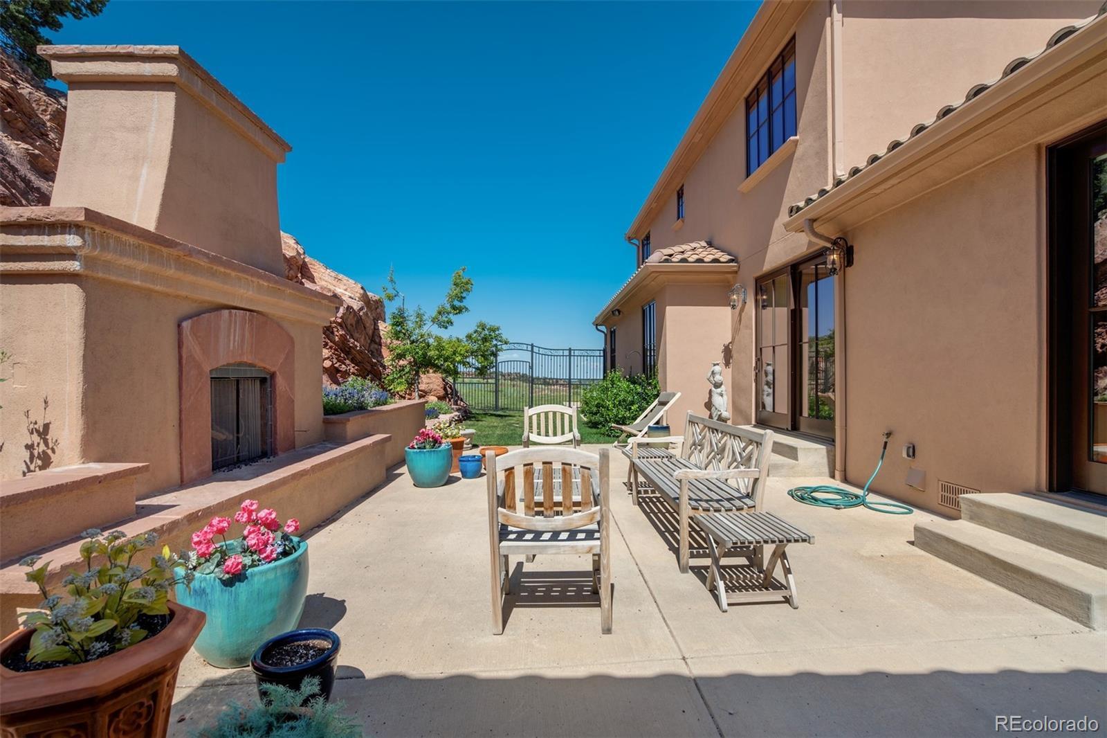 This exquisite Spanish Colonial Revival gem on 36 acres in the exclusive gated community of Turkey Canon Ranch Estates is tucked in the foothills of Colorado’s Front Range. Flanked on two sides by Aiken Canyon Nature Preserve, a Nature Conservancy Property, this home is in a landscape of shrublands, grass prairie, pinon, juniper, red rock formations, & mixed conifer forest. Subtle & elegant, this Spanish Colonial Revival home features Spanish-style arches, and wrought iron elements including a custom wrought iron double entry front door, railings, & ornate wrought iron patio gate, period light fixtures, hand-painted murals in the kitchen & each dining area, custom arched windows, hand-trowel wall finish throughout & a raised quatrefoil detail on the exterior accentuating the Spanish Colonial charm. A chef’s kitchen features a Stanley Waterford wood cook stove made in Ireland, a 6-burner gas range top, double oven, a warming drawer, quartz countertops, kitchen island w/cabinets on 2 sides & seating, baking height counter, Sub-Zero fridge, vegetable sink, walk-in pantry, breakfast area, & door to covered front veranda. The living room features a wood stove w/granite surround & a library w/floor-to-ceiling cherry built-in cabinets, cherry paneling, cozy window seat, & space for game table. The family room walks out to a second patio & is open to the formal dining room. The main patio area features a natural red rock wall & fabulous gas fireplace. The laundry/mud room, 2 baths, and a bedroom/office are all on the main level. Access to the second floor is provided by either elevator or stairs. The primary bedroom features a gas fireplace w/granite surround, a private balcony, ensuite bath w/steam shower, jetted tub, floor to ceiling marble, double sinks & walk-in closet. The home has radiant heat, AC, 9' ceilings, 8' doors, Pella windows, and has panoramic views of the Spanish Peaks & Wet Mountains. The HOA dues provide access to BLM at the back of Turkey Canon Ranch.