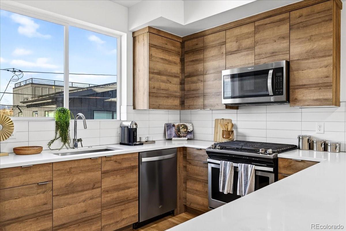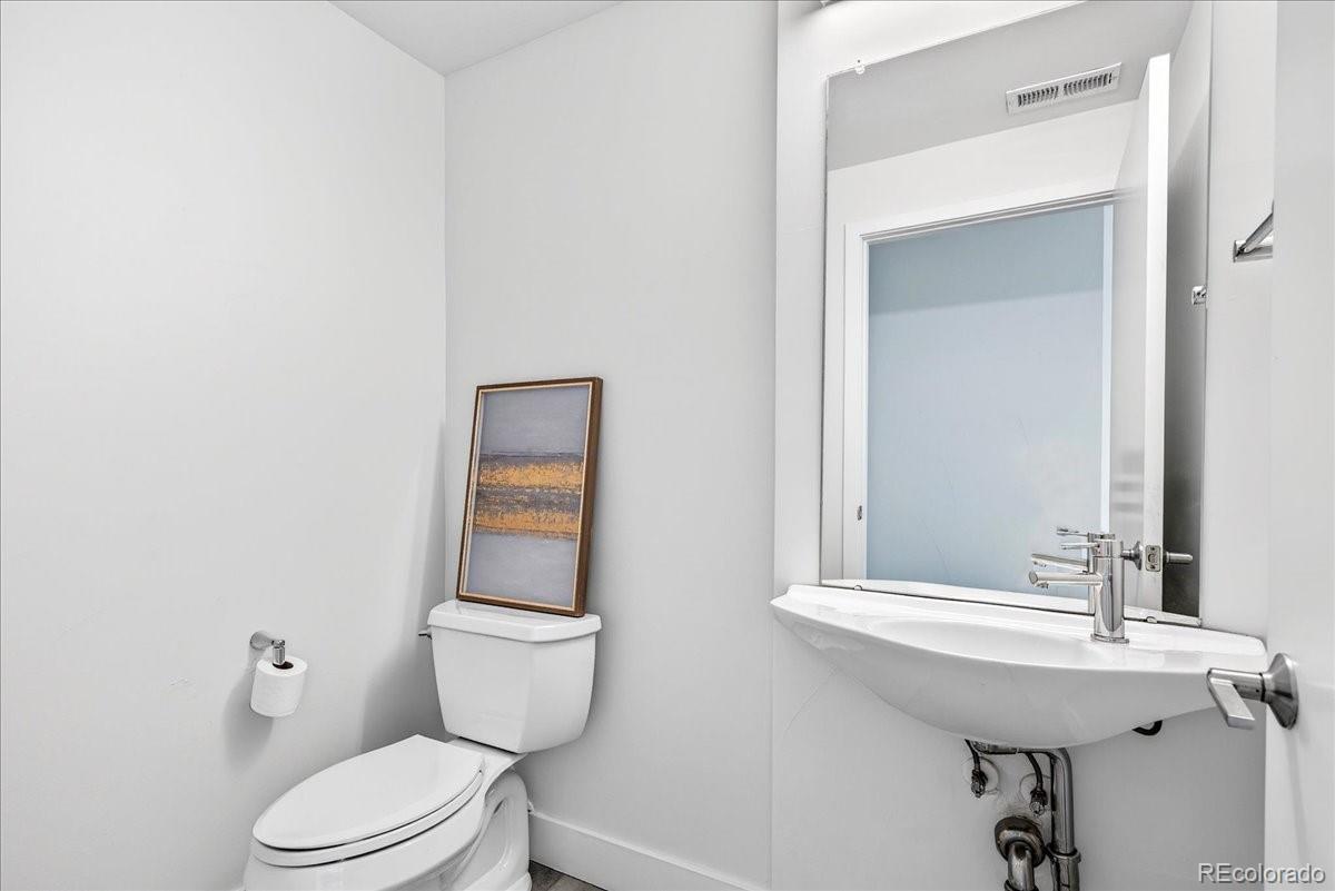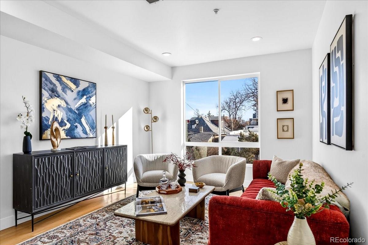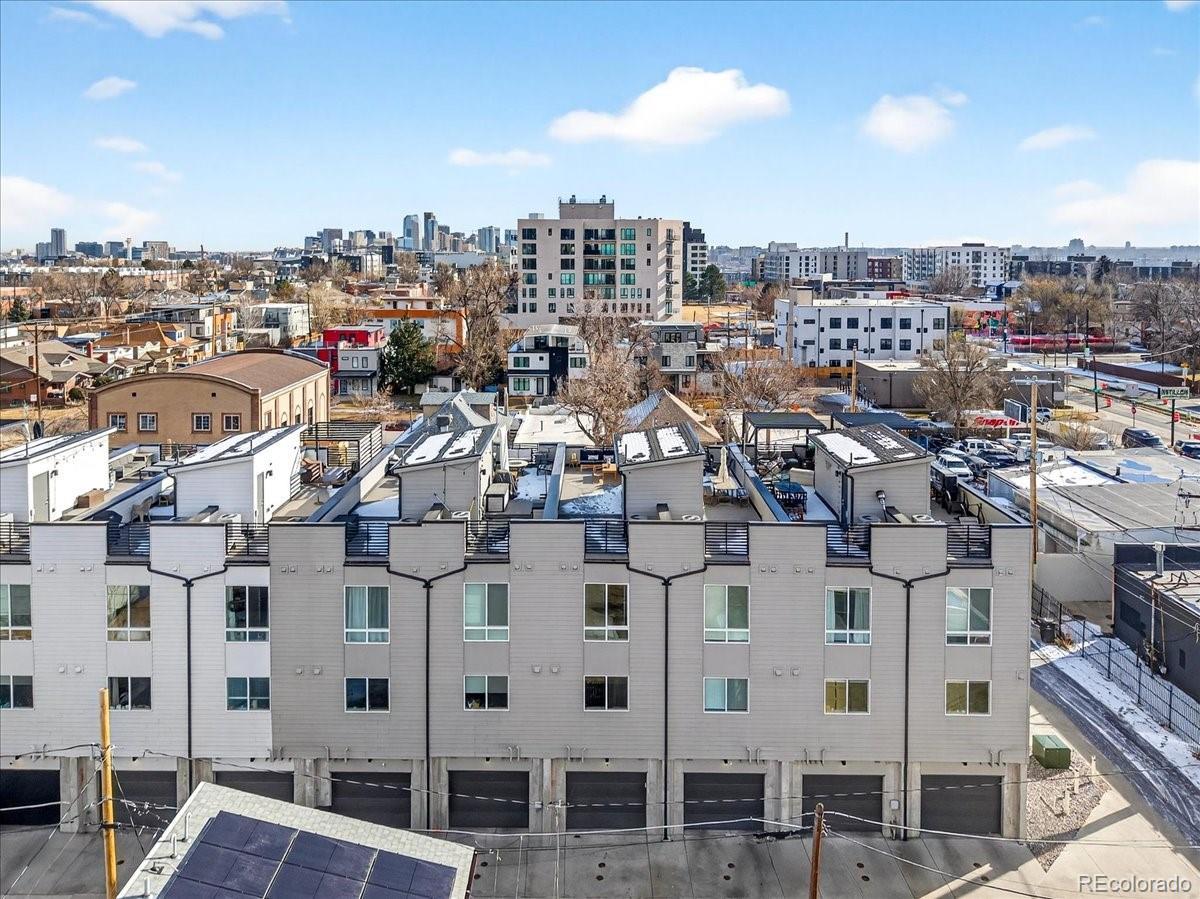 Welcome to this modern Sloan’s Lake townhouse, built in 2018 and thoughtfully designed across three stylish levels. East-facing and filled with natural light, this 2-bedroom, 3-bath home offers an ideal blend of contemporary finishes and unbeatable location. The ground floor welcomes you into an office or bonus room, plus a powder room, as well as access to the attached one-car garage, which adds the convenience of secure parking. Upstairs, the main floor features an open-concept living and dining area anchored by a sleek kitchen with a large quartz island, modern countertops and backsplash, and stainless steel appliances—perfect for everyday living and entertaining. Upstairs, you’ll find two spacious bedrooms, each with large closets. The primary suite is a true retreat, complete with a generous private balcony showcasing city views and an en-suite bath. A full bath compliments the second bedroom which delights with sweeping mountain views, and a conveniently located laundry closet in the hallway adds ease and comfort. The top floor is the showstopper: an expansive rooftop deck ready for a fire pit and gatherings, offering incredible panoramic mountain and city views—your personal outdoor oasis. Located in the highly desirable Sloan’s Lake neighborhood, this home is minutes from the lake, Paco Sánchez Park, Mile High Stadium, local breweries, and some of Denver’s favorite restaurants. A rare opportunity to enjoy modern living in one of the city’s most vibrant areas.