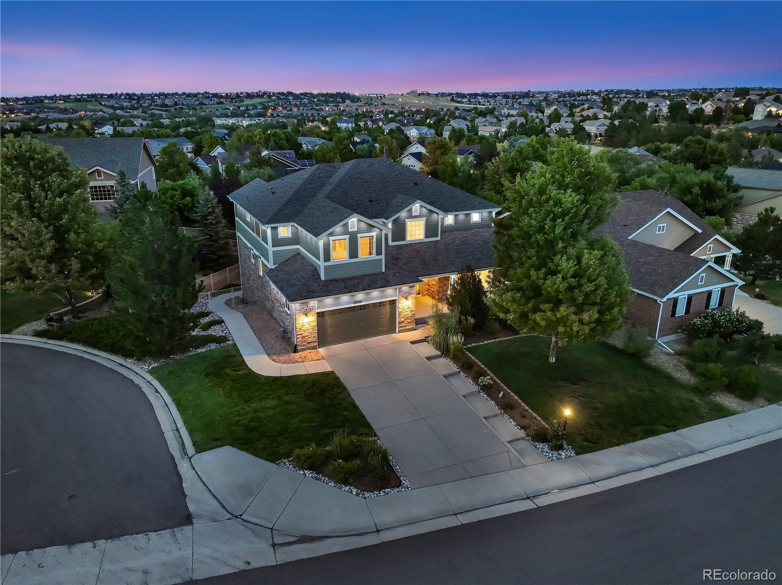 NEW CARPET, NEW PAINT, NEW ROOF, NEW PRICE!! Located in the highly sought after Saddle Rock South community and within the award-winning Cherry Creek School District, this former model home lives large at nearly 5,700 square feet. Featuring 5 bedrooms, 4 full bathrooms, two living rooms and a spacious loft, there’s just shy of 4,000 square feet of finished living space across the upper two levels. The primary suite, spanning nearly half of the upper floor, lives like its own private retreat complete with a 5-piece bath and a generous walk-in closet. On the main level, the open floor plan is an entertainer’s dream with formal and informal dining areas, a chef’s kitchen with double ovens and an oversized island, and a living room centered around a cozy gas fireplace. Downstairs you’ll find a substantial walk-out basement that’s pre-plumbed for a fifth bathroom and primed for another 1,800 square feet of expansion. The owners have invested well over six figures in recent improvements before you even step through the front door. Highlights include a brand-new roof with Class 4 shingles (great for insurance discounts!), professionally installed Jellyfish exterior lighting (display custom colors for holidays or elegant white for everyday curb appeal and security), and many of the windows have been upgraded to designer Andersen models with lifetime warranties. The nearly quarter-acre lot is anchored by the professionally-installed backyard oasis complete with a built-in fire pit, custom water feature, mature landscaping, dedicated gas line for grilling and wiring for a hot tub. Additional upgrades include an electric vehicle charger, whole-house surge protector, tankless water heater, water softener and newer finishes throughout including the front door, blinds, and garage door opener. Beyond the home itself, you’ll also have access to community amenities including pools, tennis courts, trails and parks. Don’t miss the video tour- welcome home!