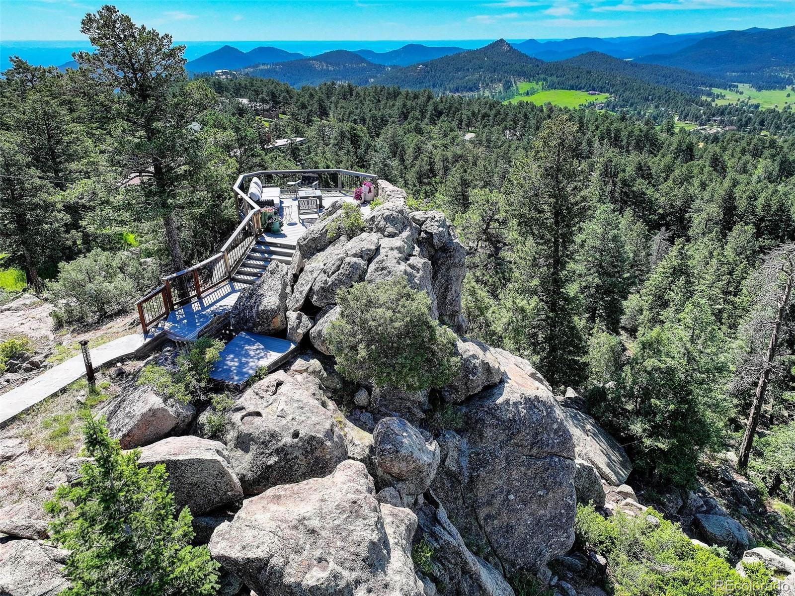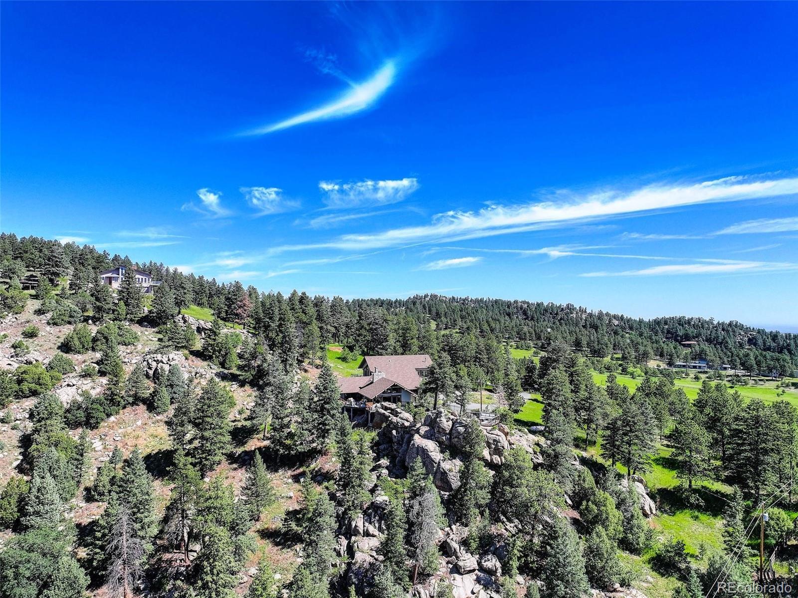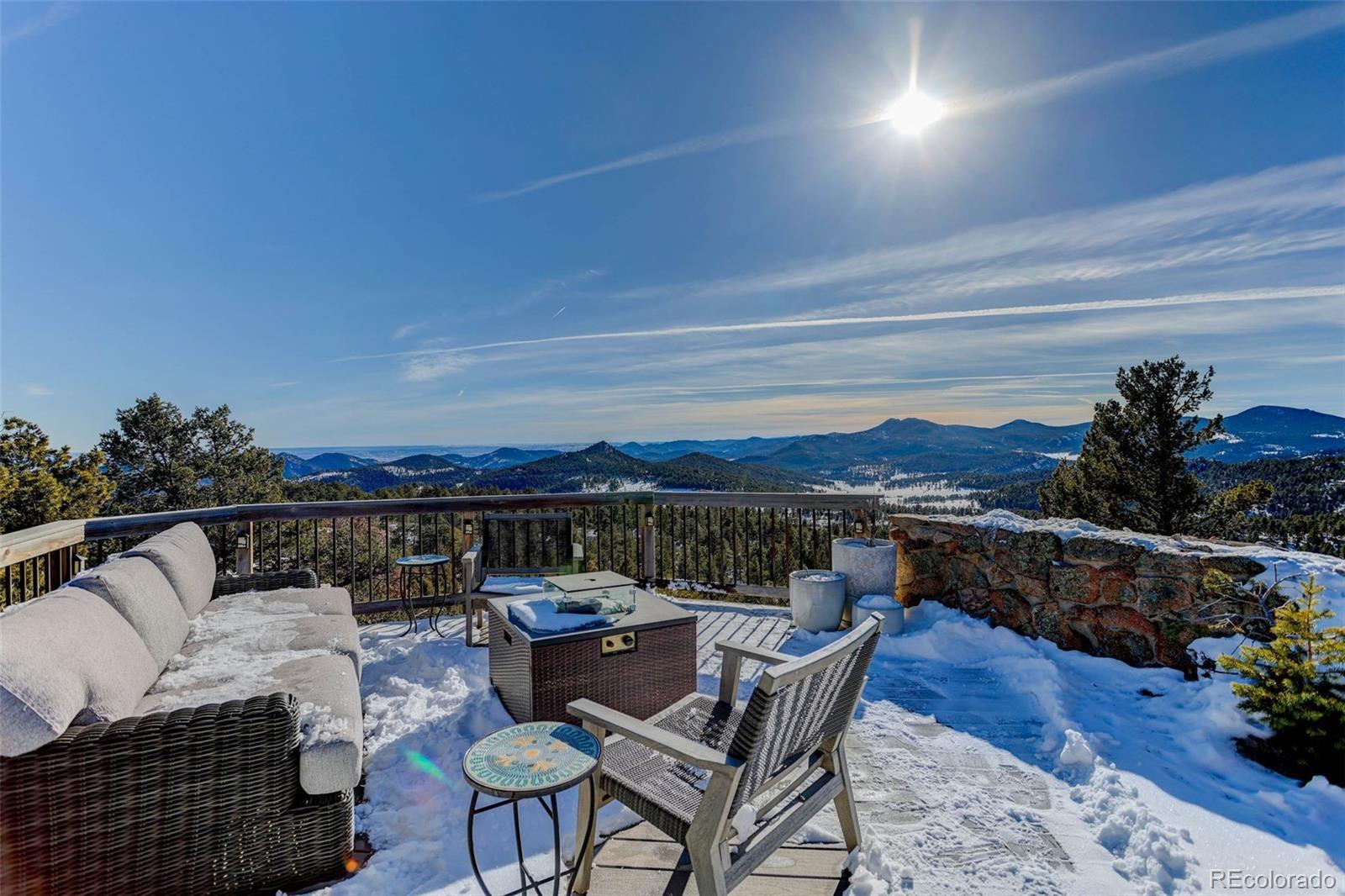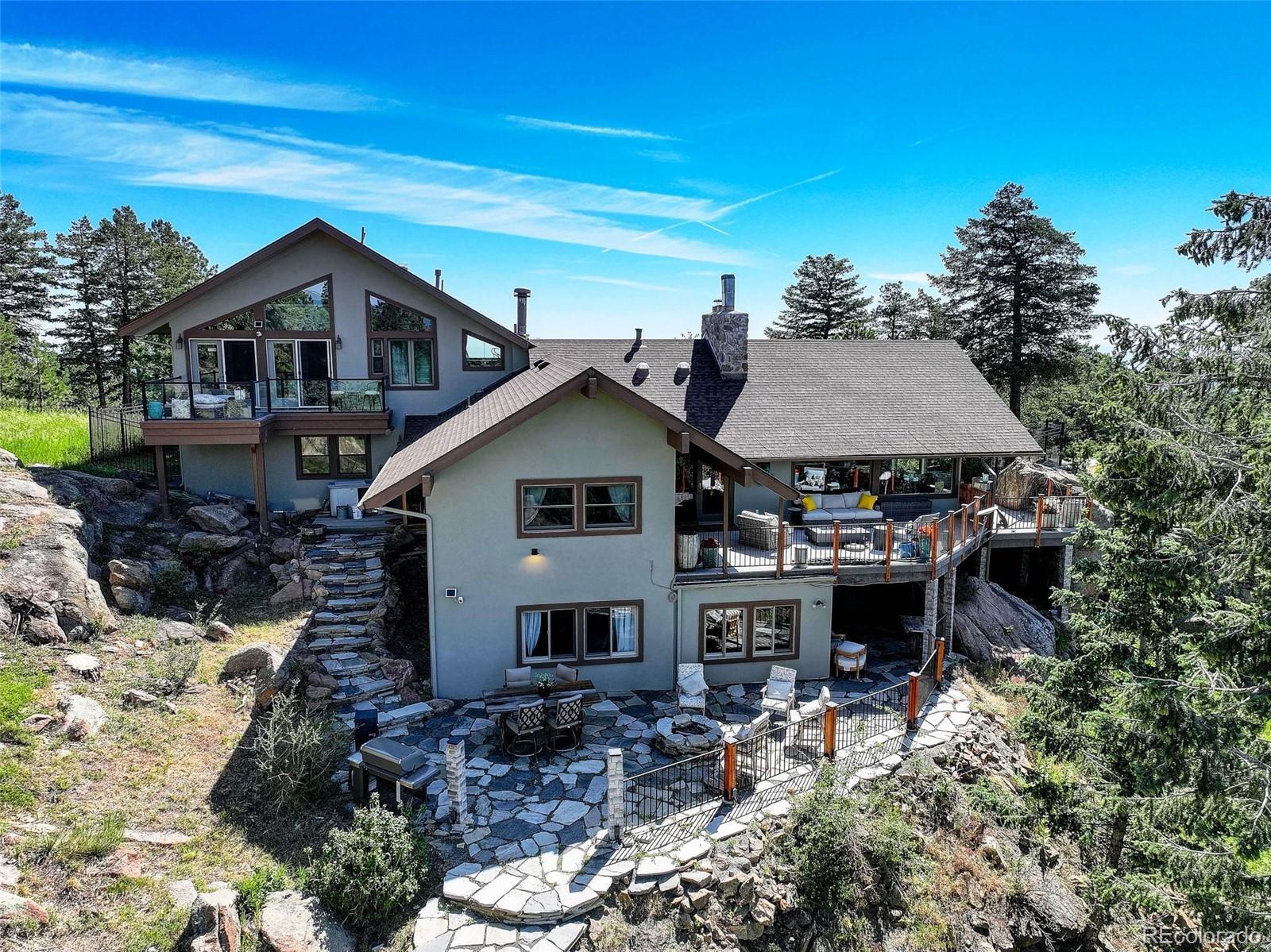 Welcome to 5237 Bear Mountain Dr, a breathtaking 5-bedroom, 5-bathroom sanctuary nestled on 3.91 private acres in Evergreen, Colorado. This luxurious 4,771-sqft estate offers unparalleled views of the city skyline & the majestic Mt Blue Sky, all framed by stunning rock outcroppings & the rugged natural beauty of the surrounding landscape. Don’t miss the upper deck perch, which provides far-reaching 360-degree views of both- a breathtaking vantage point for sunrises & sunsets. A security gate provides both privacy & peace of mind, setting the tone for the exclusivity that awaits within. The main level boasts a grand great room with vaulted ceilings & a wood-burning, double-sided fireplace that adds warmth and ambiance to both the living area & the adjacent spaces. A formal dining room showcases spectacular city views, creating the perfect setting for dinner gatherings. The kitchen is a chef’s dream, equipped with Viking appliances, granite countertops, & a spacious walk-in pantry. This level also includes a bedroom with an attached 5-piece bathroom, a laundry room, & a convenient 1/2 bath. The heart of this home is its expansive primary suite on the upper level, a true retreat that includes a private library with floor-to-ceiling windows, perfect for quiet contemplation or inspired work. With two beautifully appointed bathrooms, a convenient kitchenette, & a wrap-around deck, the primary suite offers a blend of comfort & elegance that is hard to match. On the lower level, a fully finished basement with walk-out access boasts 3 additional bedrooms & a bathroom, making it ideal for guests or extended family. The property is designed for entertaining & practical living, featuring a 4-car heated garage attached to the main residence. Every inch of 5237 Bear Mountain Drive has been crafted to offer a harmonious blend of luxurious comfort & natural splendor, making this Evergreen property a true mountain masterpiece that combines exclusivity with warm, welcoming charm.