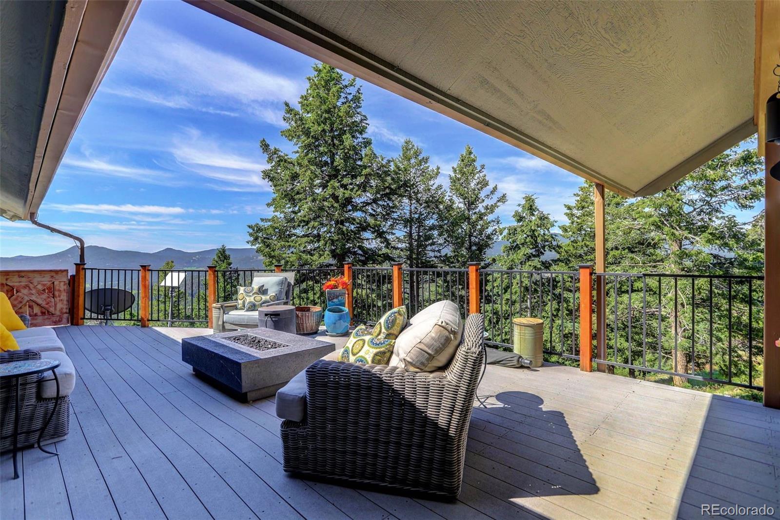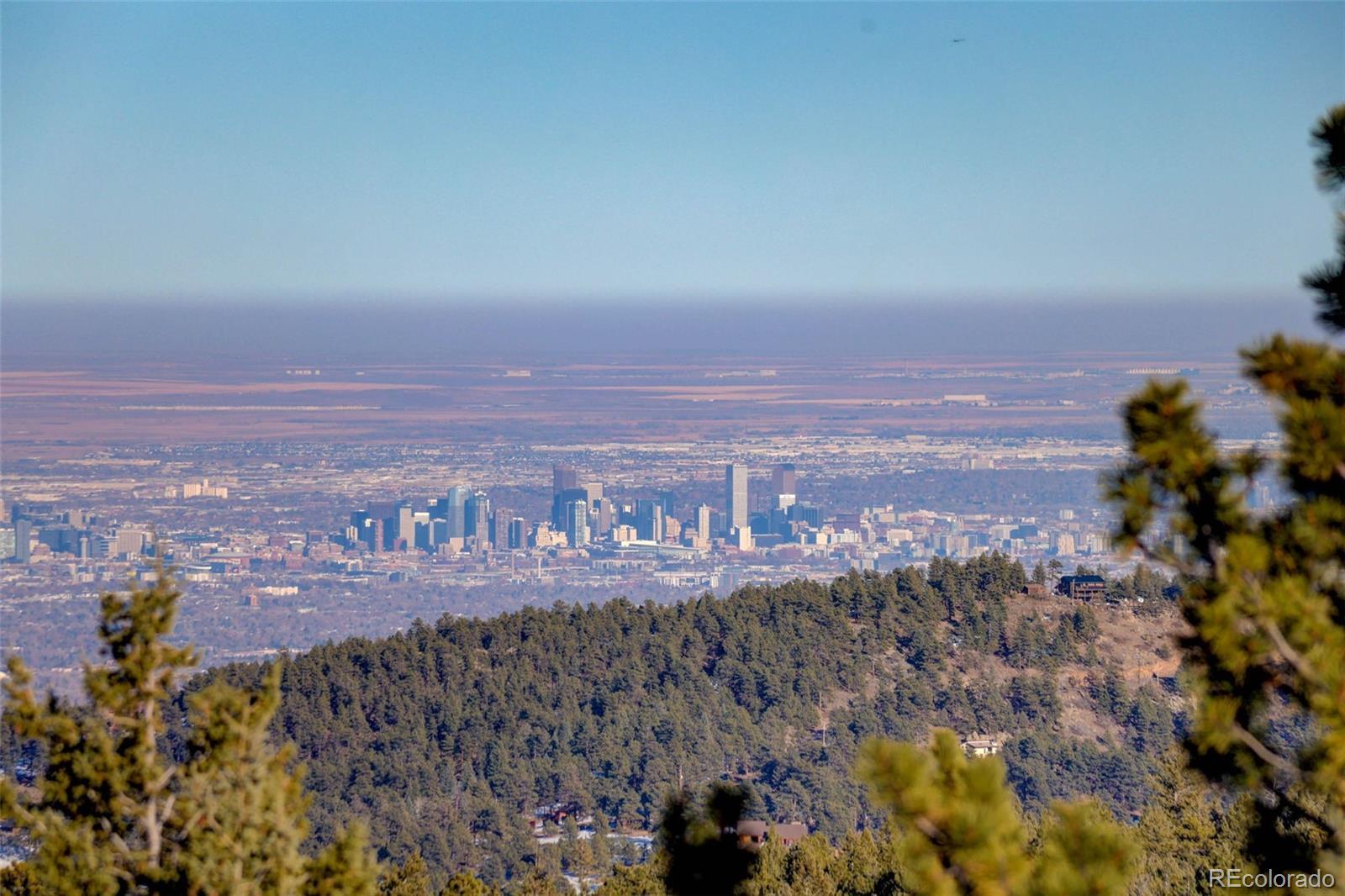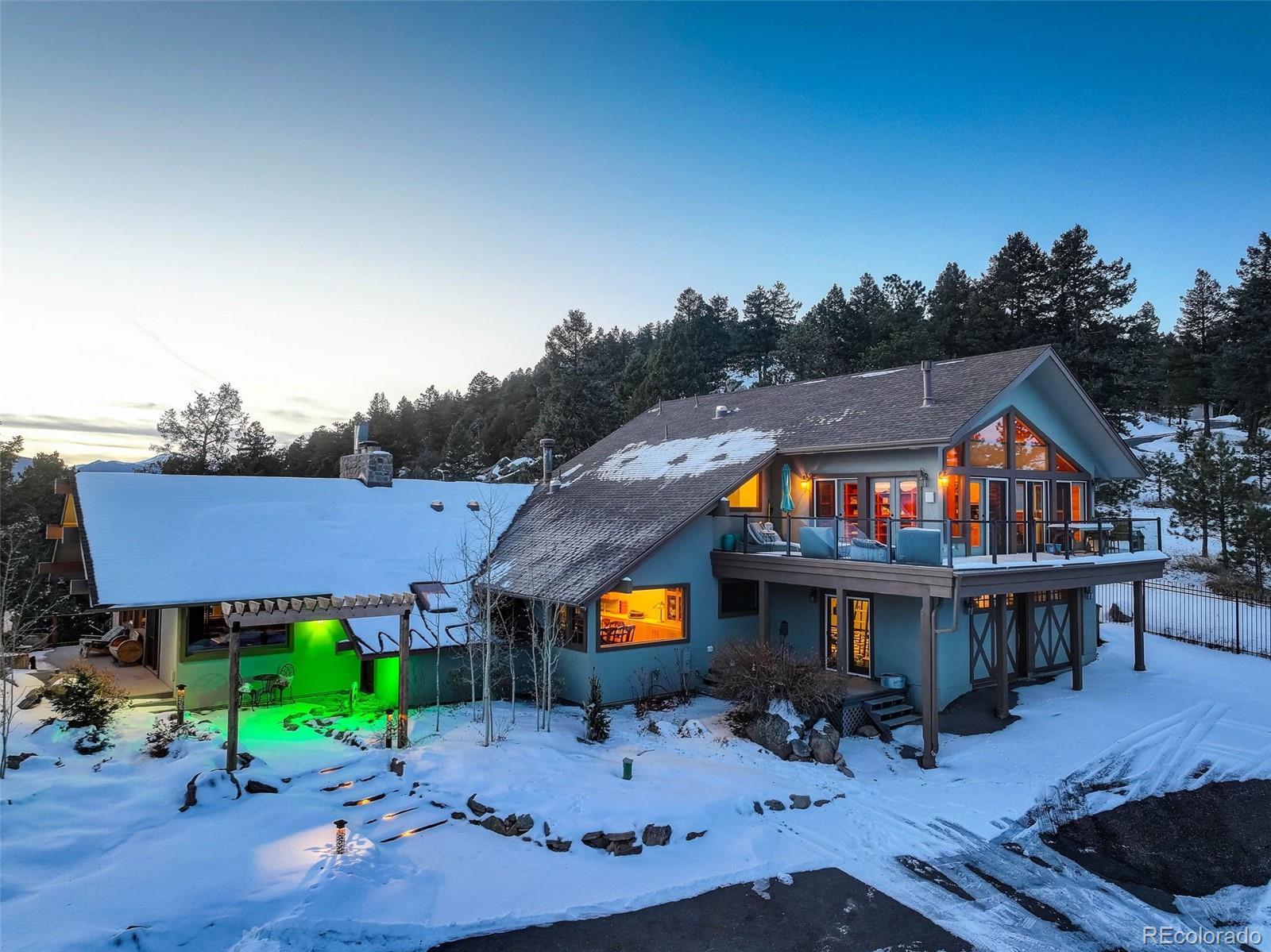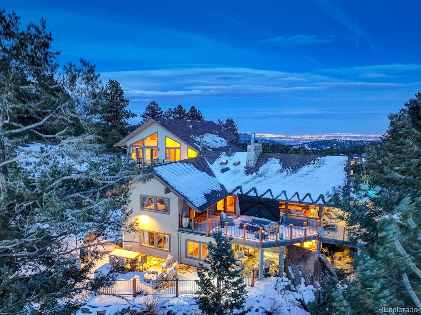 Welcome to 5237 Bear Mountain Dr, a breathtaking 5-bedroom, 5-bathroom sanctuary nestled on 3.91 private acres in Evergreen, Colorado. This luxurious 4,771-sqft estate offers unparalleled views of the city skyline & the majestic Mt Blue Sky, all framed by stunning rock outcroppings & the rugged natural beauty of the surrounding landscape. Don’t miss the upper deck perch, which provides far-reaching 360-degree views of both- a breathtaking vantage point for sunrises & sunsets. A security gate provides both privacy & peace of mind, setting the tone for the exclusivity that awaits within. The main level boasts a grand great room with vaulted ceilings & a wood-burning, double-sided fireplace that adds warmth and ambiance to both the living area & the adjacent spaces. A formal dining room showcases spectacular city views, creating the perfect setting for dinner gatherings. The kitchen is a chef’s dream, equipped with Viking appliances, granite countertops, & a spacious walk-in pantry. This level also includes a bedroom with an attached 5-piece bathroom, a laundry room, & a convenient 1/2 bath. The heart of this home is its expansive primary suite on the upper level, a true retreat that includes a private library with floor-to-ceiling windows, perfect for quiet contemplation or inspired work. With two beautifully appointed bathrooms, a convenient kitchenette, & a wrap-around deck, the primary suite offers a blend of comfort & elegance that is hard to match. On the lower level, a fully finished basement with walk-out access boasts 3 additional bedrooms & a bathroom, making it ideal for guests or extended family. The property is designed for entertaining & practical living, featuring a 4-car heated garage attached to the main residence. Every inch of 5237 Bear Mountain Drive has been crafted to offer a harmonious blend of luxurious comfort & natural splendor, making this Evergreen property a true mountain masterpiece that combines exclusivity with warm, welcoming charm.
