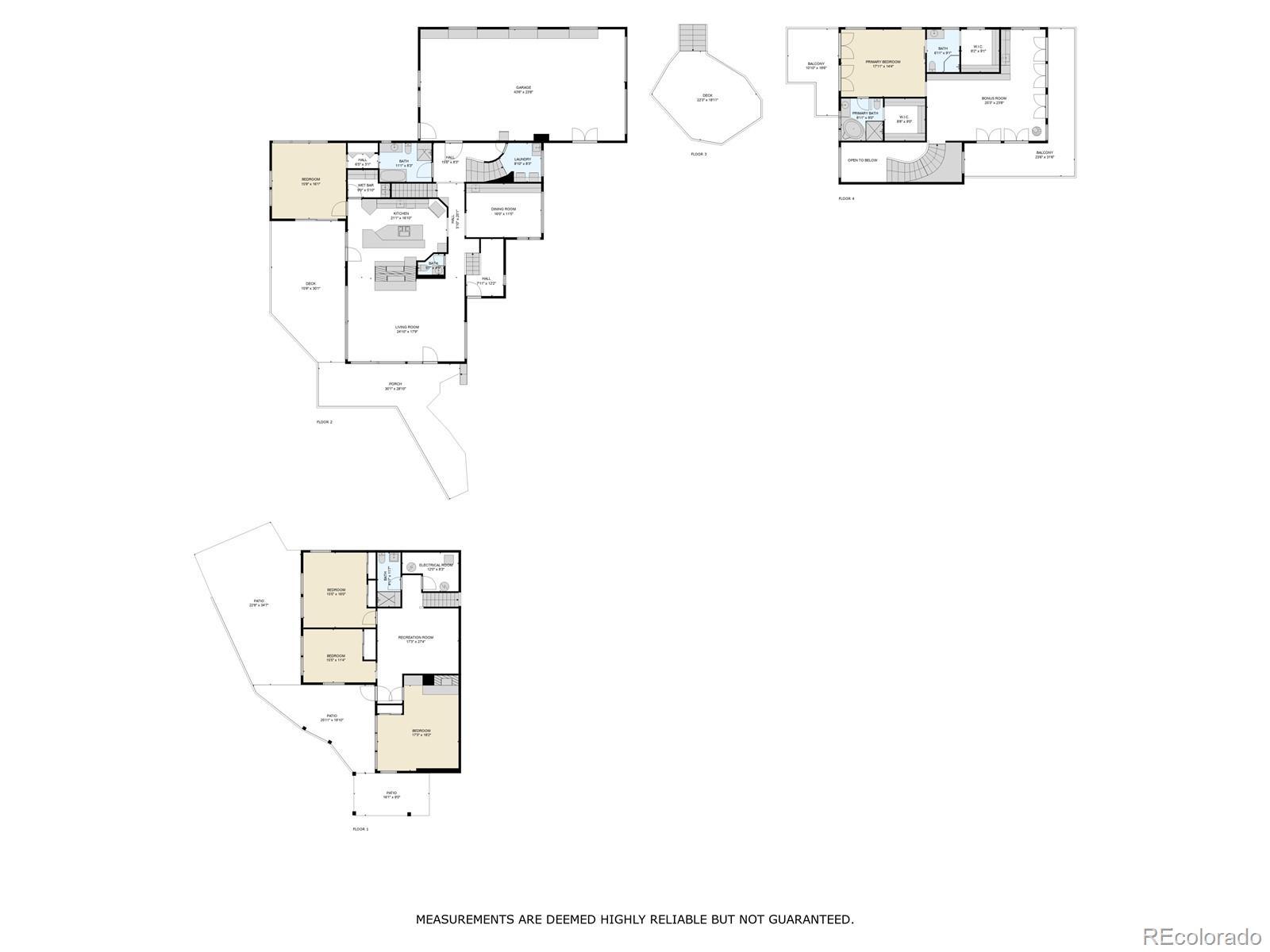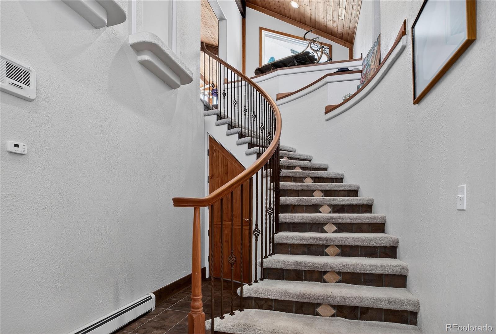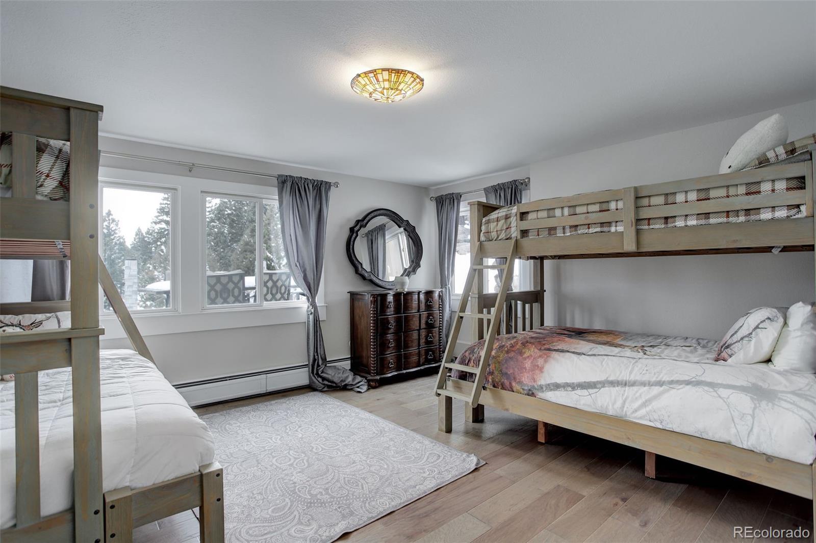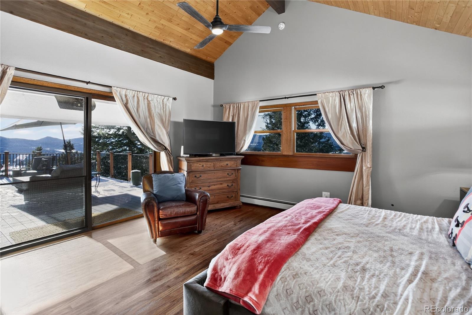Welcome to 5237 Bear Mountain Dr, a breathtaking 5-bedroom, 5-bathroom sanctuary nestled on 3.91 private acres in Evergreen, Colorado. This luxurious 4,771-sqft estate offers unparalleled views of the city skyline & the majestic Mt Blue Sky, all framed by stunning rock outcroppings & the rugged natural beauty of the surrounding landscape. Don’t miss the upper deck perch, which provides far-reaching 360-degree views of both- a breathtaking vantage point for sunrises & sunsets. A security gate provides both privacy & peace of mind, setting the tone for the exclusivity that awaits within. The main level boasts a grand great room with vaulted ceilings & a wood-burning, double-sided fireplace that adds warmth and ambiance to both the living area & the adjacent spaces. A formal dining room showcases spectacular city views, creating the perfect setting for dinner gatherings. The kitchen is a chef’s dream, equipped with Viking appliances, granite countertops, & a spacious walk-in pantry. This level also includes a bedroom with an attached 5-piece bathroom, a laundry room, & a convenient 1/2 bath. The heart of this home is its expansive primary suite on the upper level, a true retreat that includes a private library with floor-to-ceiling windows, perfect for quiet contemplation or inspired work. With two beautifully appointed bathrooms, a convenient kitchenette, & a wrap-around deck, the primary suite offers a blend of comfort & elegance that is hard to match. On the lower level, a fully finished basement with walk-out access boasts 3 additional bedrooms & a bathroom, making it ideal for guests or extended family. The property is designed for entertaining & practical living, featuring a 4-car heated garage attached to the main residence. Every inch of 5237 Bear Mountain Drive has been crafted to offer a harmonious blend of luxurious comfort & natural splendor, making this Evergreen property a true mountain masterpiece that combines exclusivity with warm, welcoming charm.