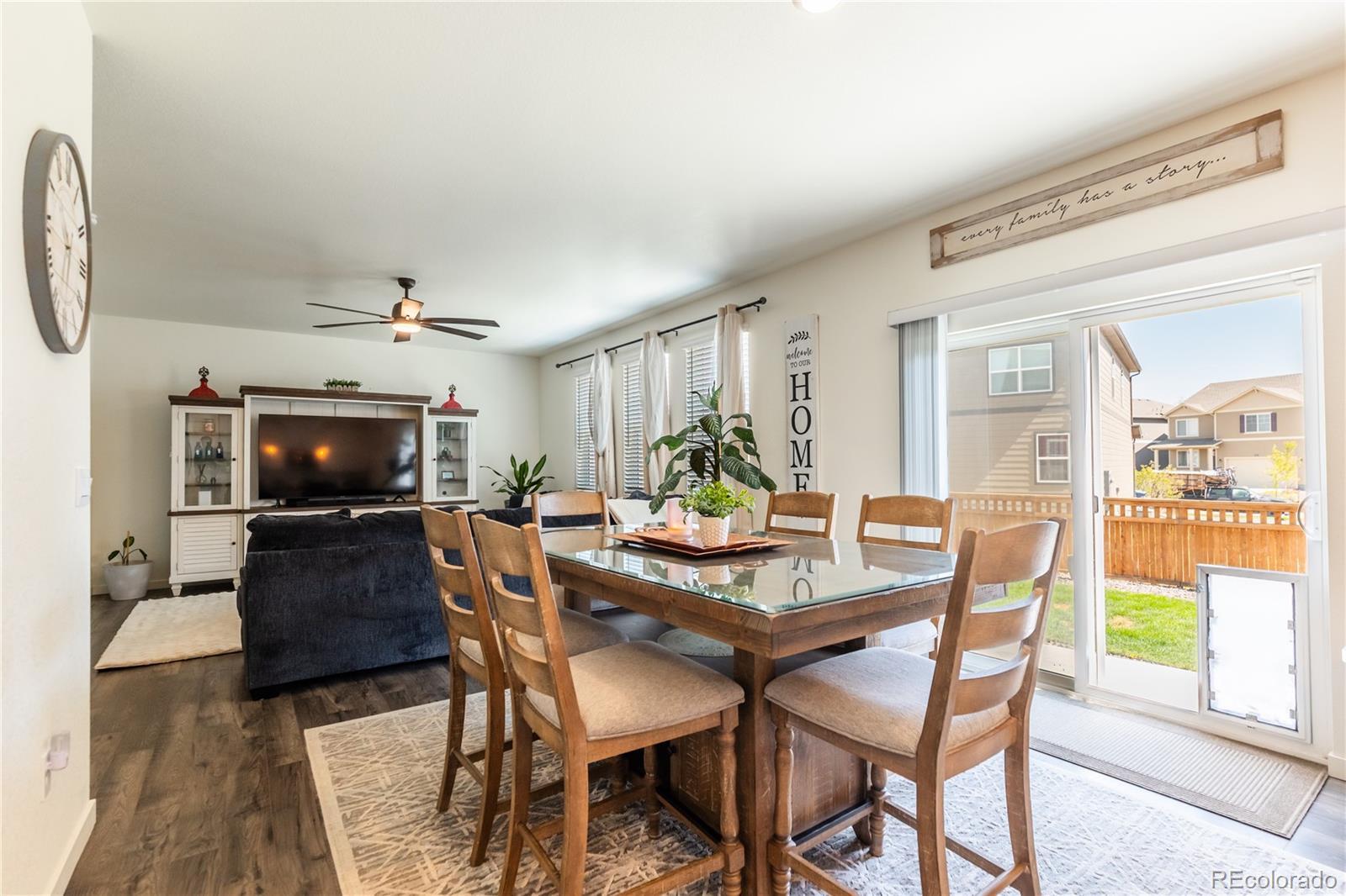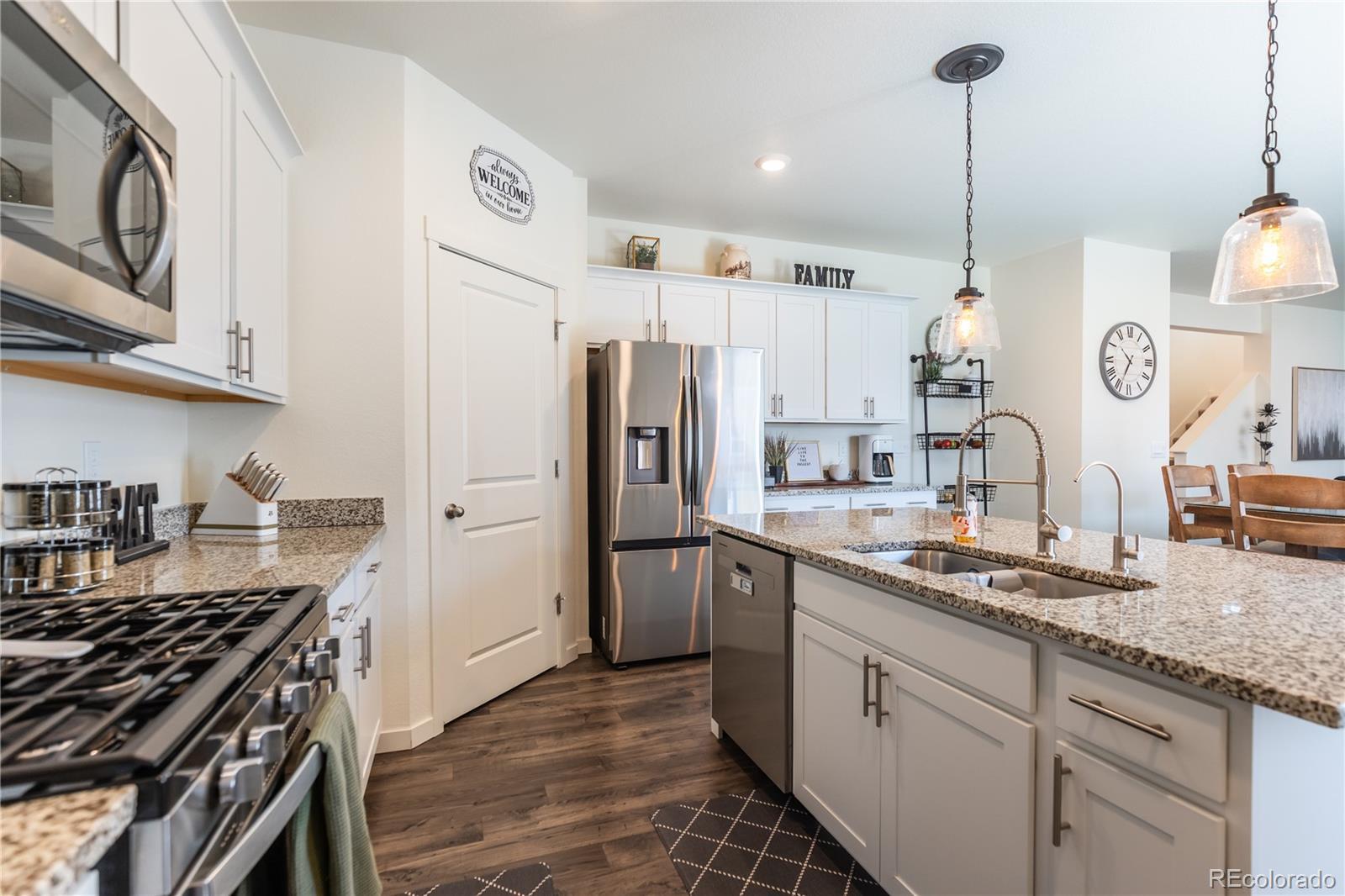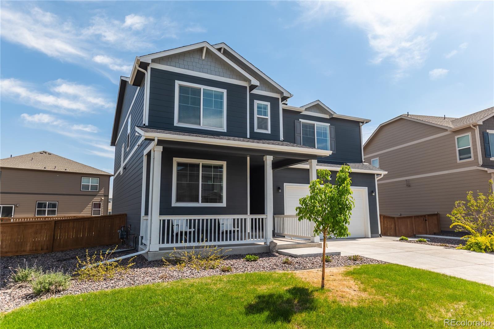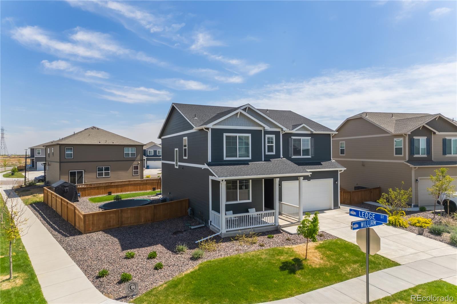Step into this stunning corner-lot DR Horton home in the highly sought-after Silver Peaks community of Lochbuie. Built in 2022 and lovingly maintained by its original owner, this residence blends modern comfort with thoughtful design. The main floor welcomes you with abundant natural light, soaring 9-foot ceilings, and an open-concept layout that seamlessly connects the living, dining, and kitchen areas. The stylish kitchen features crisp white cabinetry, stainless-steel appliances, and a granite island offering additional seating and storage. A convenient main-floor bedroom and nearby full bath provide an ideal setup for guests or multi-generational living. Upstairs, the spacious primary suite includes a full bathroom and an expansive walk-in closet. Three additional bedrooms—each with generously sized closets—share a well-appointed 3/4 bath. A versatile loft adds even more flexibility, perfect for a playroom, home office, family room, or workout space. Situated on a premium corner lot of over 10,000 square feet, the home boasts an expansive, fully fenced backyard with a concrete patio—an ideal setting for gatherings, relaxation, and outdoor entertaining. Additional upgrades include a tankless water heater and a Rainsoft water softener system for enhanced efficiency and comfort. The two-car garage features high ceilings, offering excellent potential for extra storage. Enjoy the convenience of nearby shopping, dining, and entertainment options, along with quick access to Highway 76. Experience small-town living with the benefit of being just 30 minutes from Denver’s vibrant attractions and only 25 minutes from DIA.
