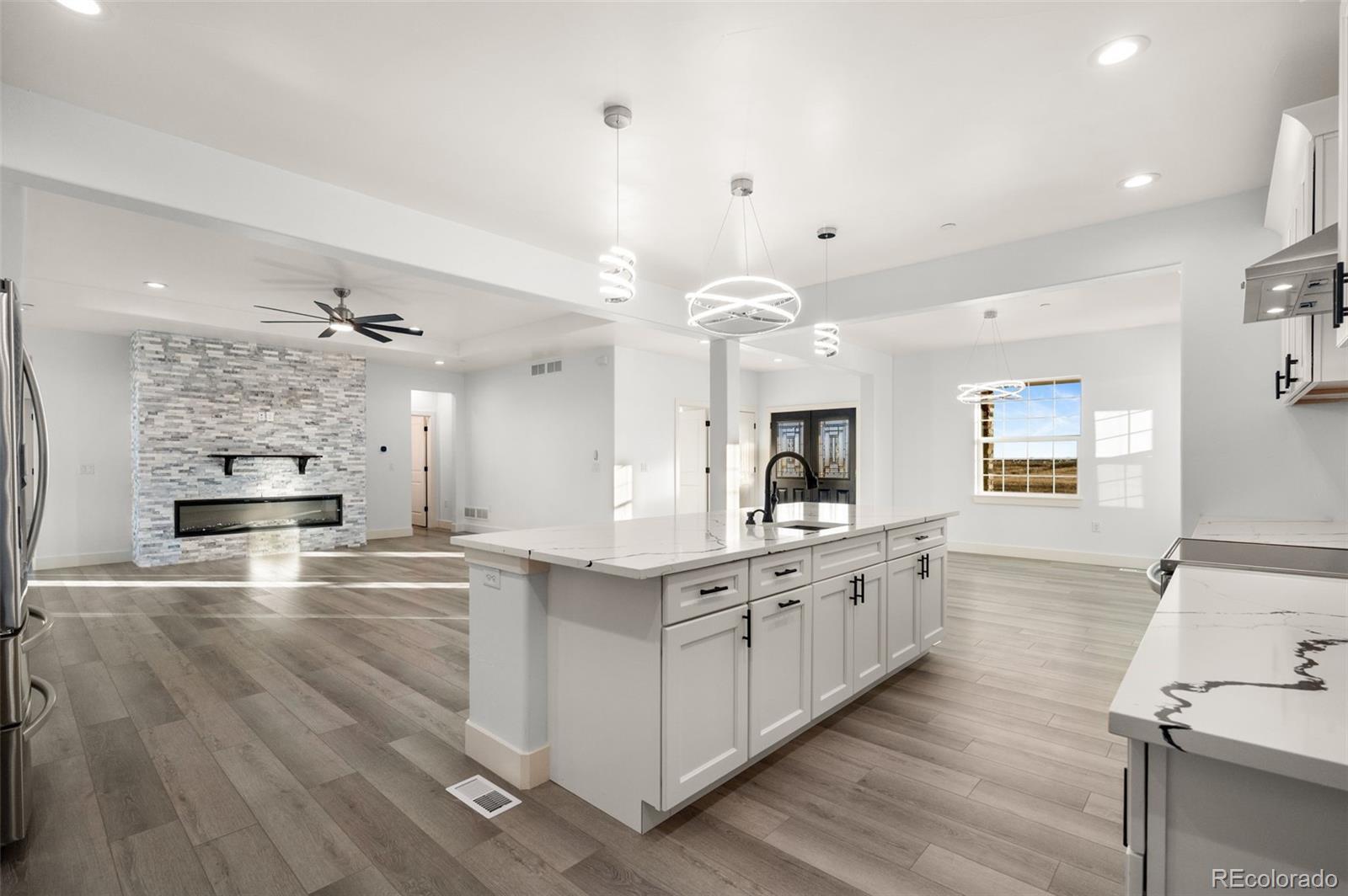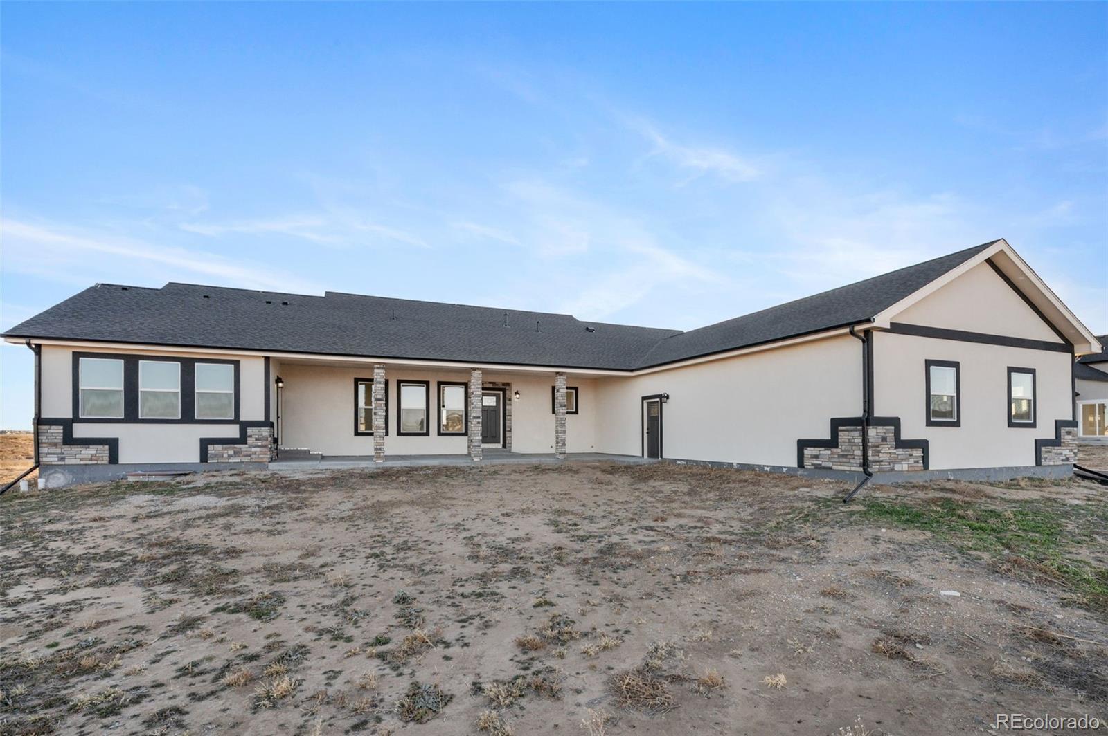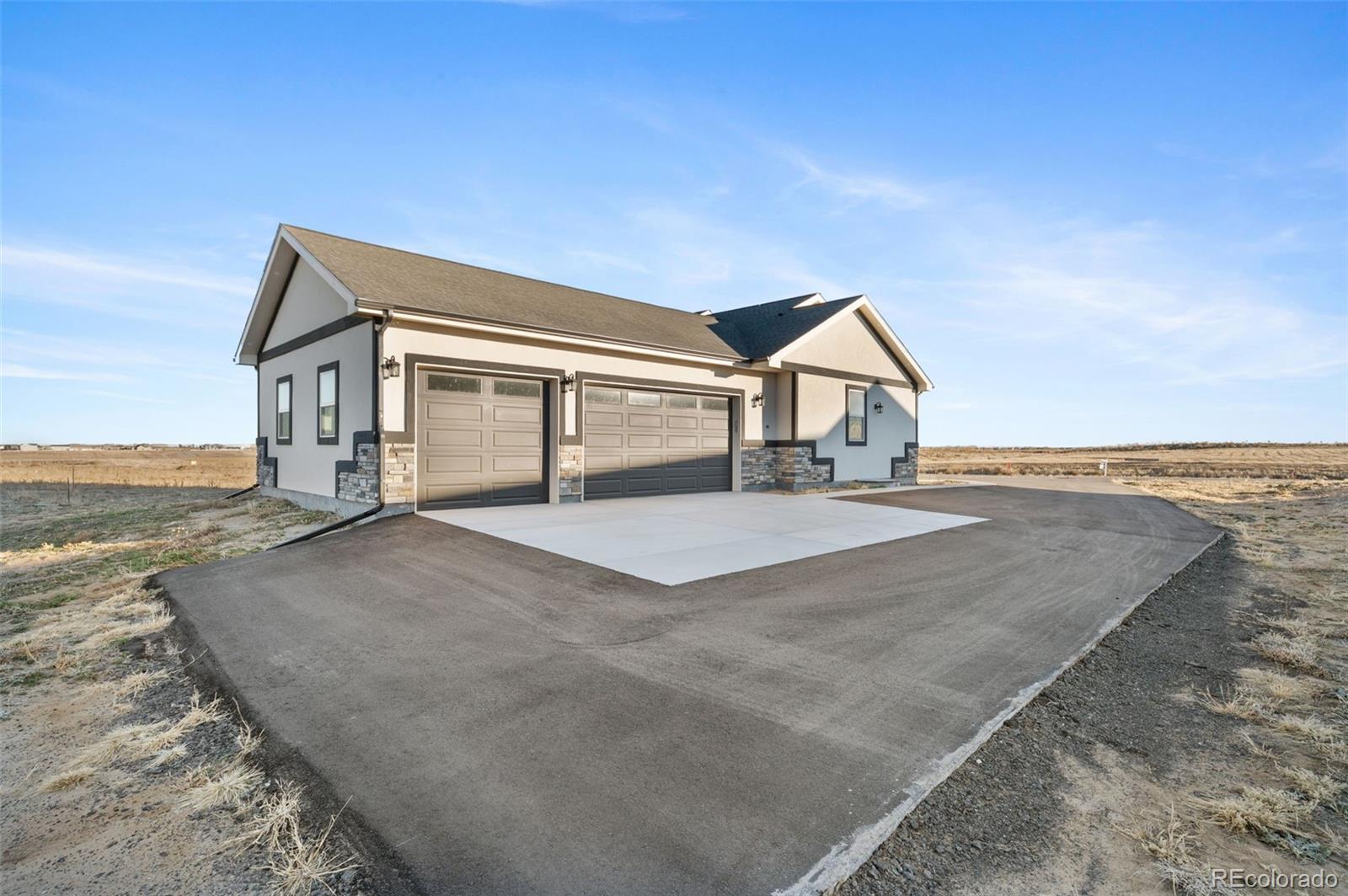 New Build – Move-In Ready! This beautiful home sits on 1.6 acres just minutes east of Brighton in a high-end acreage community offering space, privacy, and flexibility. The thoughtfully designed open-concept floor plan features a spacious great room, kitchen, and dining area—ideal for entertaining. The gourmet kitchen includes quartz countertops and backsplash, an oversized island, stainless steel appliances, vent hood, double sinks, and a large walk-in pantry with an additional coffee/wine room. The inviting great room offers a cozy electric fireplace with a full stone surround. The primary suite features private access to the covered back patio and a luxurious ensuite bathroom with an oversized vanity, spacious shower, and walk-in closet. Bedrooms are split for added privacy, with the primary suite separated from two secondary bedrooms on opposite sides of the home. A front bedroom provides flexibility and can easily serve as a home office. Designed for true Colorado acreage living, the property allows animals up to two horses, two goats, and chickens