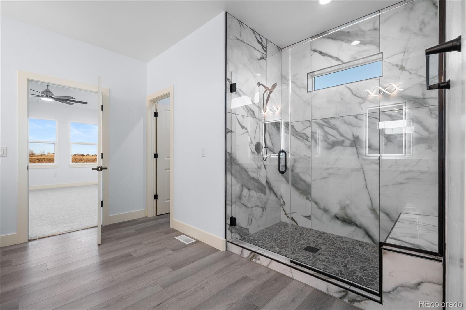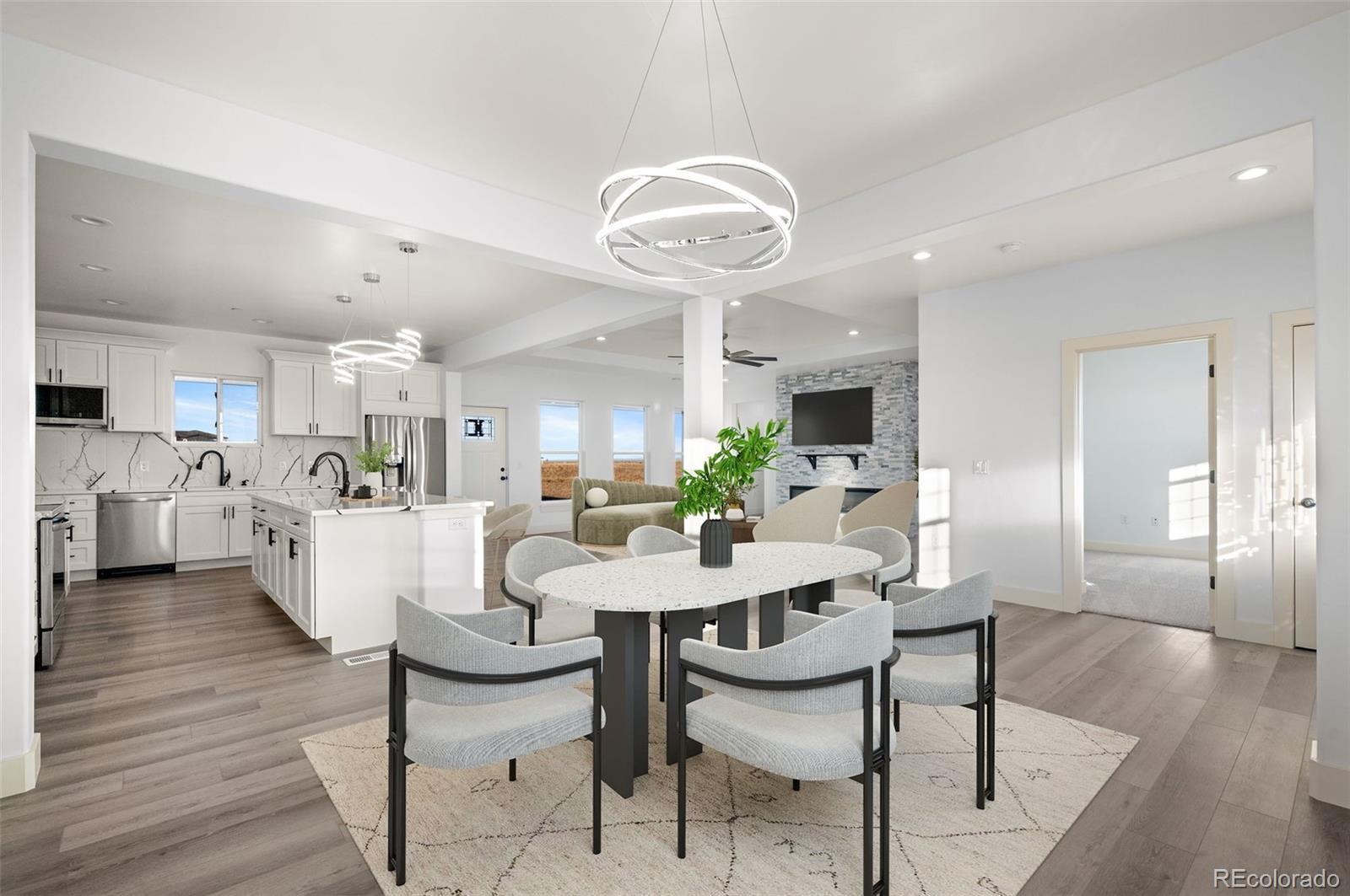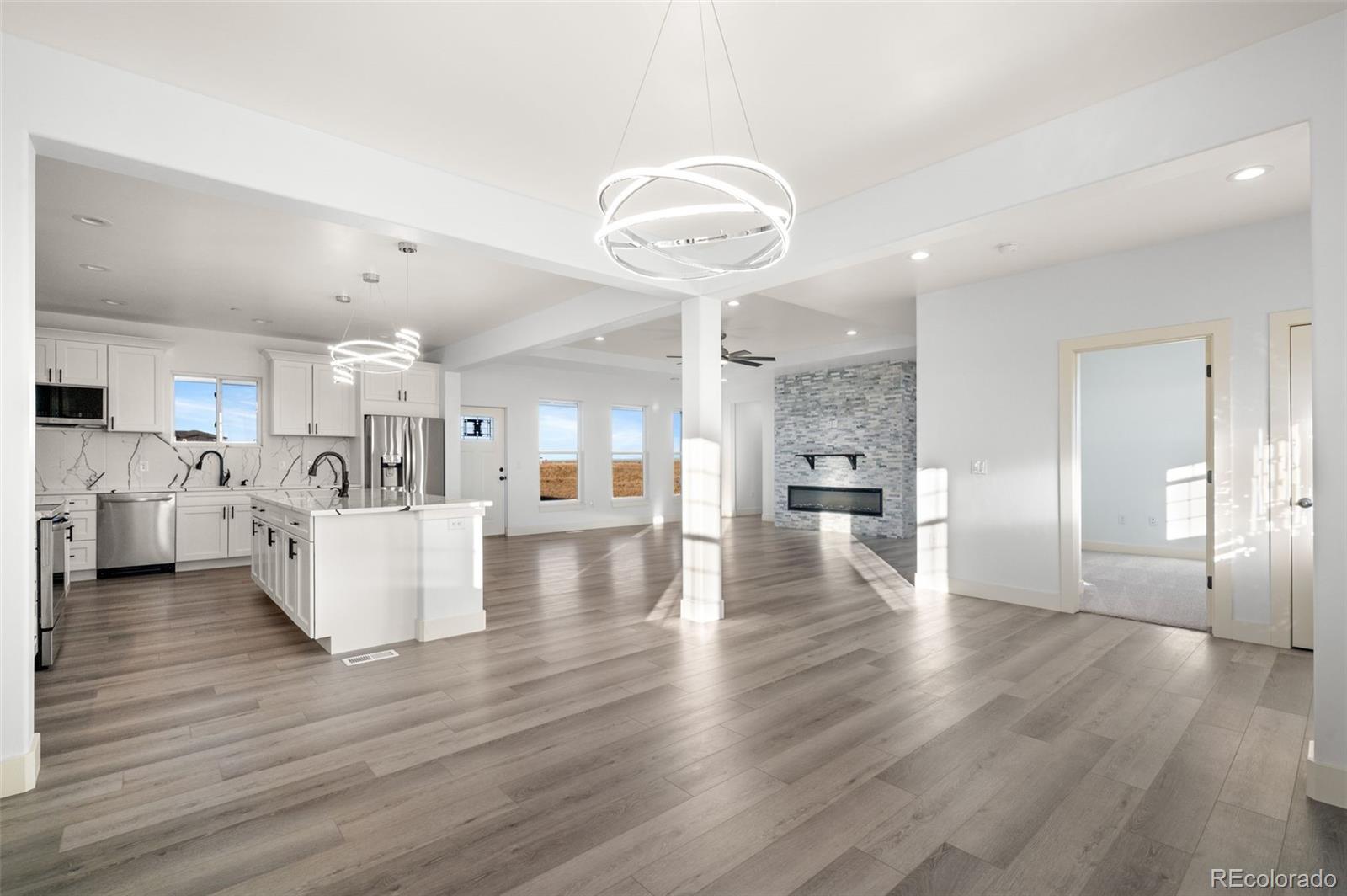 New Build – Move-In Ready! This beautiful home sits on 1.6 acres just minutes east of Brighton in a high-end acreage community offering space, privacy, and flexibility. The thoughtfully designed open-concept floor plan features a spacious great room, kitchen, and dining area—ideal for entertaining. The gourmet kitchen includes quartz countertops and backsplash, an oversized island, stainless steel appliances, vent hood, double sinks, and a large walk-in pantry with an additional coffee/wine room. The inviting great room offers a cozy electric fireplace with a full stone surround. The primary suite features private access to the covered back patio and a luxurious ensuite bathroom with an oversized vanity, spacious shower, and walk-in closet. Bedrooms are split for added privacy, with the primary suite separated from two secondary bedrooms on opposite sides of the home. A front bedroom provides flexibility and can easily serve as a home office. Designed for true Colorado acreage living, the property allows animals up to two horses, two goats, and chickens