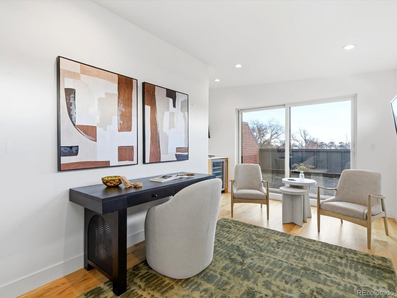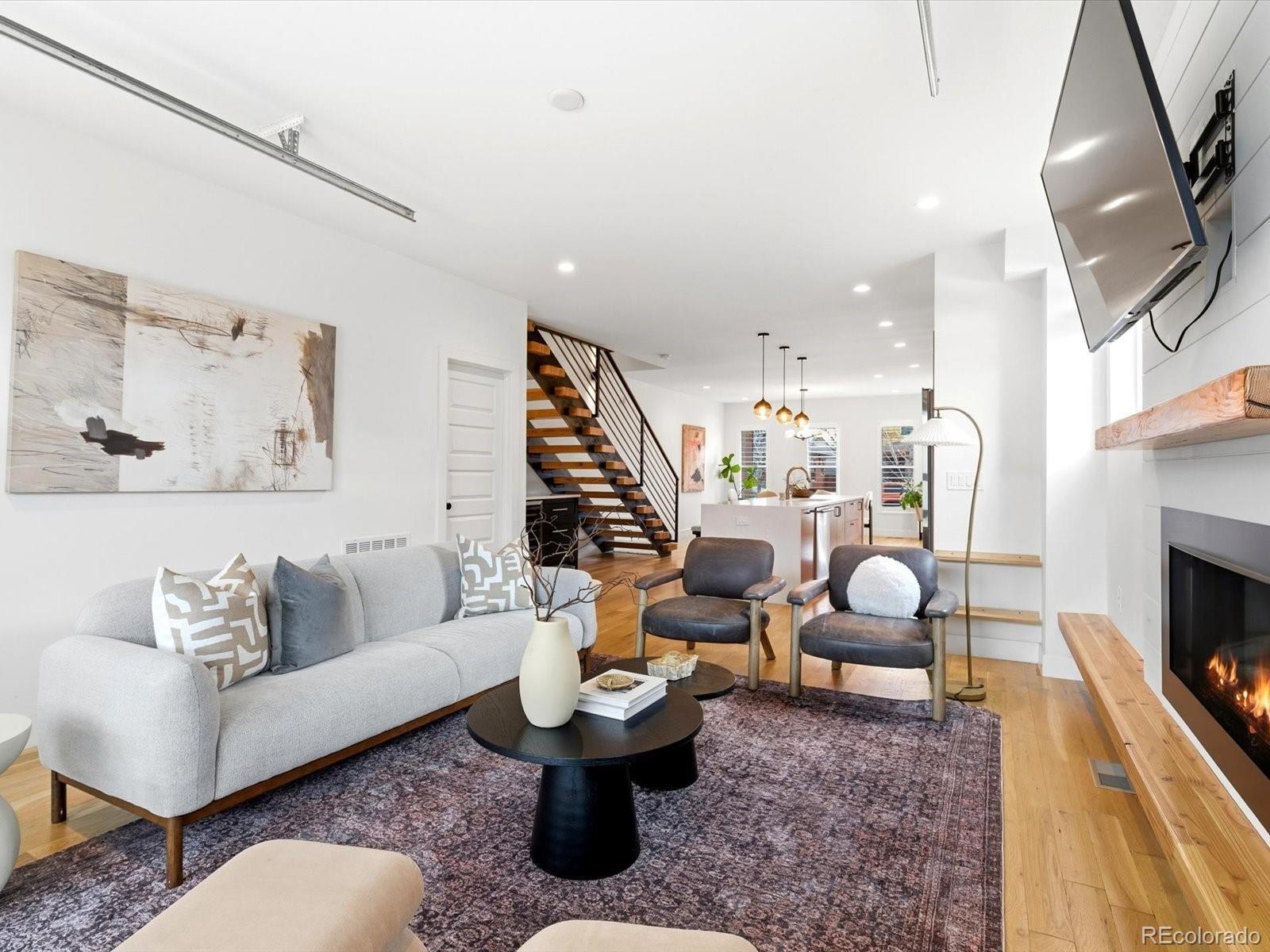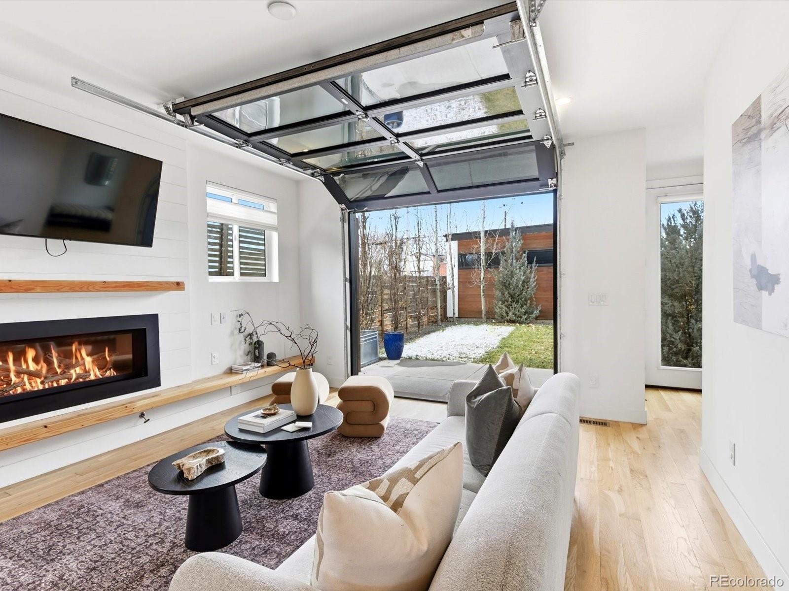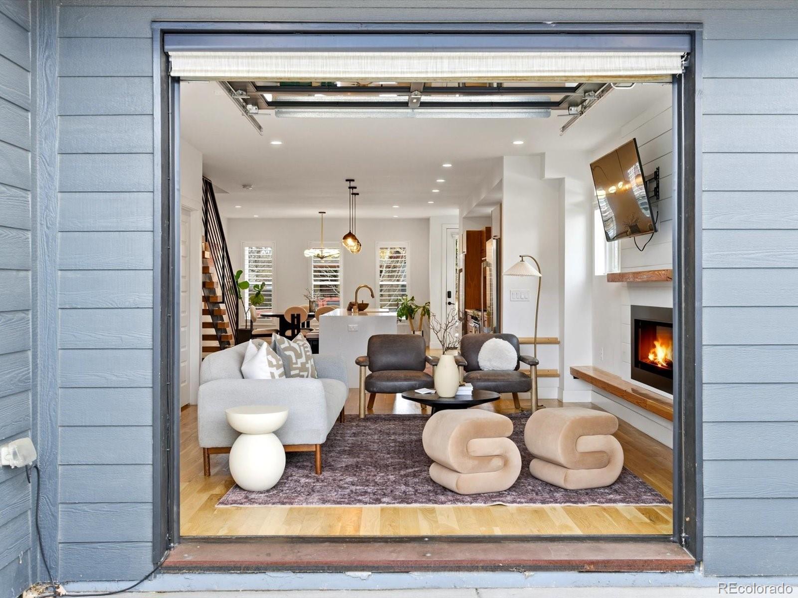 Modern Sunnyside living at its best. Three bedrooms plus an office! Built in 2018 by Work Shop, this nearly new half-duplex delivers standout design, smart layout, and true indoor-outdoor living. Skip the wait on new construction and move right into a home built for entertaining and everyday comfort. The main level features an open concept layout with custom finishes throughout. The kitchen flows effortlessly into the dining and living spaces and is anchored by quartz countertops, a large waterfall island, custom cabinetry, and a premium stainless appliance package with gas range and separate refrigerator and freezer. The great room is highlighted by a gas fireplace and dramatic glass overhead door that opens directly to the covered patio, creating a seamless connection between indoor and outdoor living spaces. Upstairs, the primary suite offers a spacious retreat with a spa inspired five-piece bathroom featuring a soaking tub, glass enclosed shower, dual sinks, and a large walk-in closet. A second upstairs bedroom includes its own full bathroom, ideal for kids or guests. The third level adds even more flexibility with an additional bedroom, stylish three quarter bath, and a versatile enclosed flex space complete with a wet bar. The current owners finished this space off with a door and wall to create an office/flex room setting. Step out onto the expansive rooftop deck and enjoy year-round downtown views, perfect for hosting or relaxing at the end of the day. Additional highlights include a detached two car garage, custom landscaping in the backyard for additional privacy and thoughtful design details throughout the home. Located just steps from Cherry Bean Coffee, El Jefe, The Wolf's Tailor, Bacon Social House, Chaffee Park, and minutes to LoHi and downtown Denver, this Sunnyside location delivers both convenience and lifestyle.