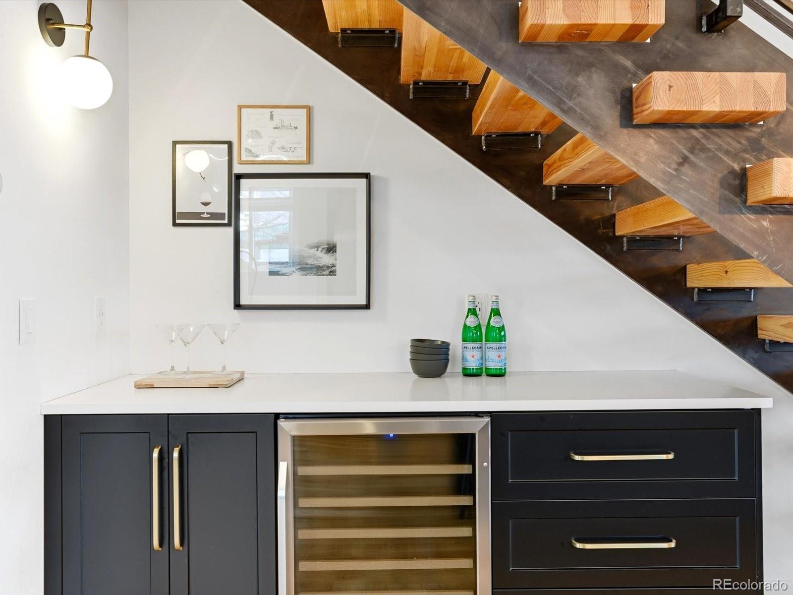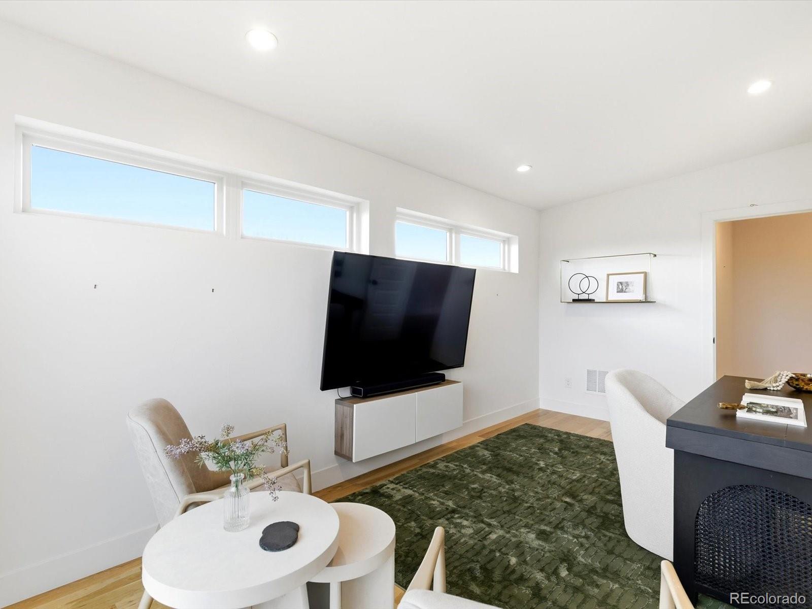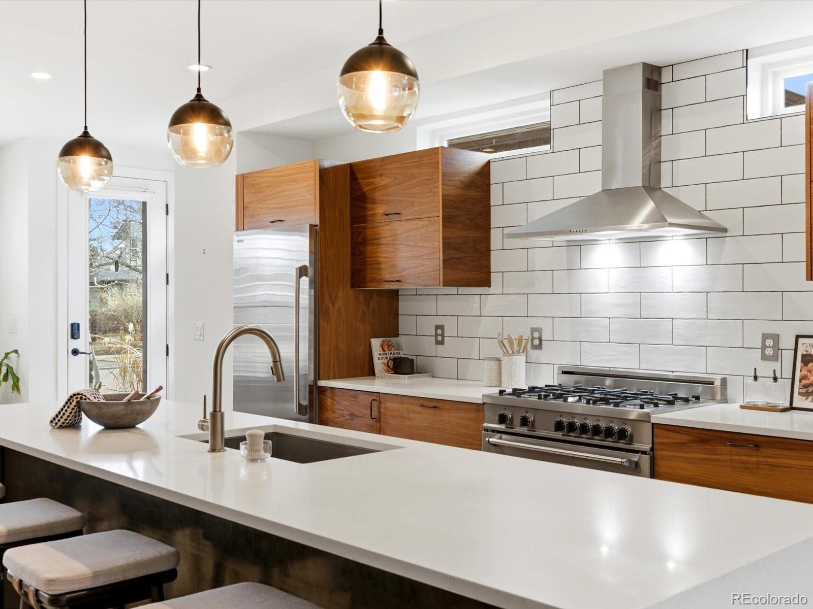 Modern Sunnyside living at its best. Three bedrooms plus an office! Built in 2018 by Work Shop, this nearly new half-duplex delivers standout design, smart layout, and true indoor-outdoor living. Skip the wait on new construction and move right into a home built for entertaining and everyday comfort. The main level features an open concept layout with custom finishes throughout. The kitchen flows effortlessly into the dining and living spaces and is anchored by quartz countertops, a large waterfall island, custom cabinetry, and a premium stainless appliance package with gas range and separate refrigerator and freezer. The great room is highlighted by a gas fireplace and dramatic glass overhead door that opens directly to the covered patio, creating a seamless connection between indoor and outdoor living spaces. Upstairs, the primary suite offers a spacious retreat with a spa inspired five-piece bathroom featuring a soaking tub, glass enclosed shower, dual sinks, and a large walk-in closet. A second upstairs bedroom includes its own full bathroom, ideal for kids or guests. The third level adds even more flexibility with an additional bedroom, stylish three quarter bath, and a versatile enclosed flex space complete with a wet bar. The current owners finished this space off with a door and wall to create an office/flex room setting. Step out onto the expansive rooftop deck and enjoy year-round downtown views, perfect for hosting or relaxing at the end of the day. Additional highlights include a detached two car garage, custom landscaping in the backyard for additional privacy and thoughtful design details throughout the home. Located just steps from Cherry Bean Coffee, El Jefe, The Wolf's Tailor, Bacon Social House, Chaffee Park, and minutes to LoHi and downtown Denver, this Sunnyside location delivers both convenience and lifestyle.