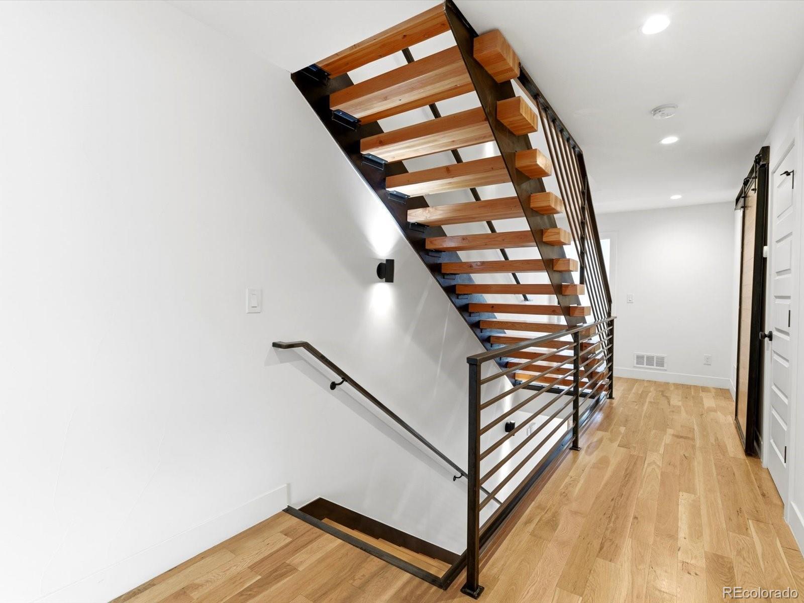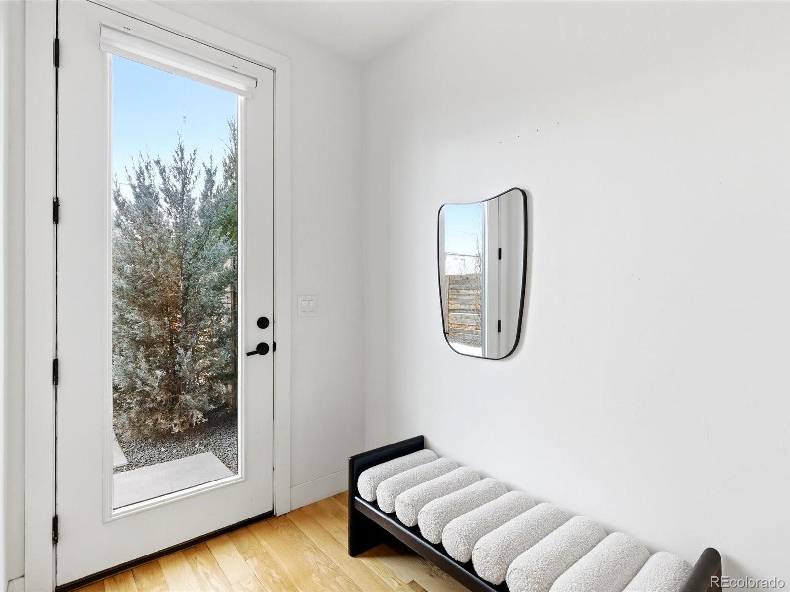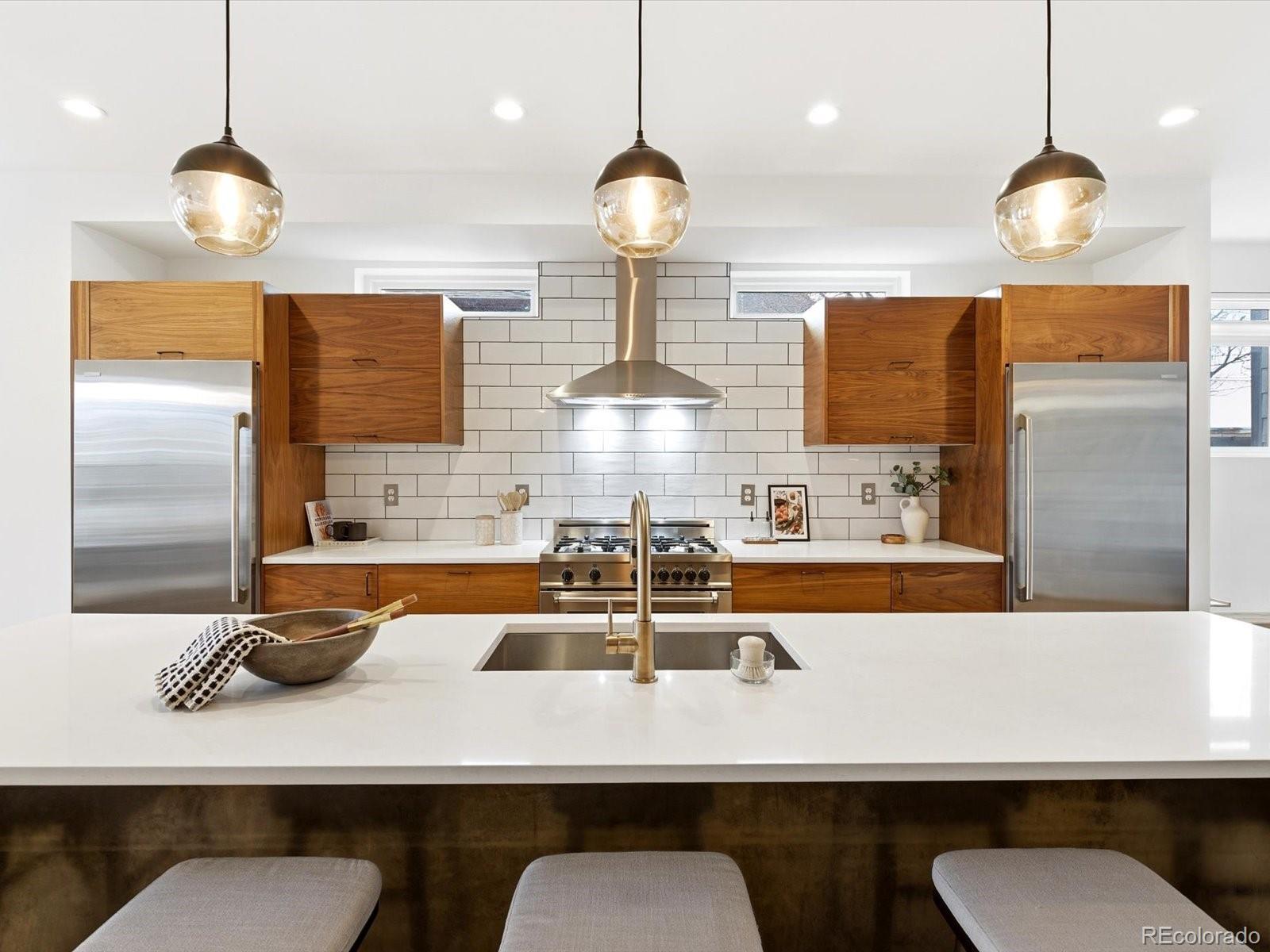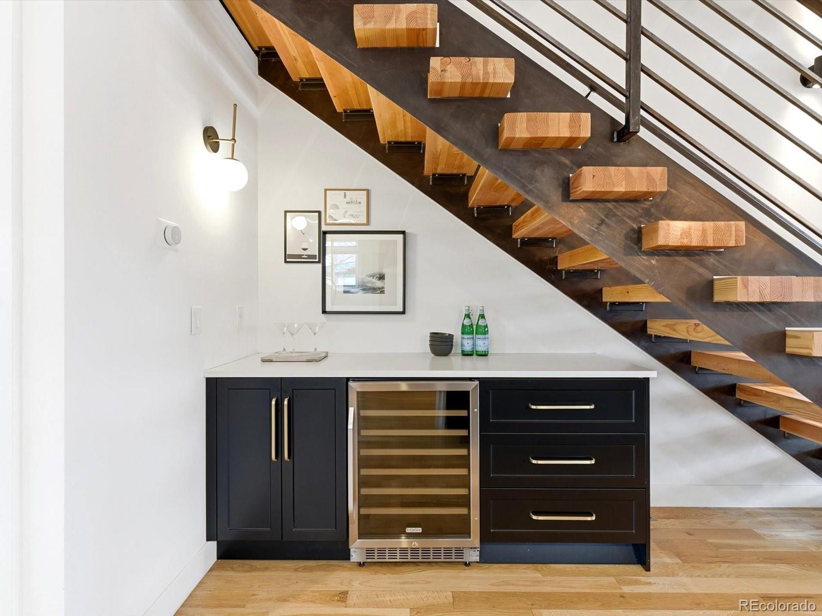Modern Sunnyside living at its best. Three bedrooms plus an office! Built in 2018 by Work Shop, this nearly new half-duplex delivers standout design, smart layout, and true indoor-outdoor living. Skip the wait on new construction and move right into a home built for entertaining and everyday comfort. The main level features an open concept layout with custom finishes throughout. The kitchen flows effortlessly into the dining and living spaces and is anchored by quartz countertops, a large waterfall island, custom cabinetry, and a premium stainless appliance package with gas range and separate refrigerator and freezer. The great room is highlighted by a gas fireplace and dramatic glass overhead door that opens directly to the covered patio, creating a seamless connection between indoor and outdoor living spaces. Upstairs, the primary suite offers a spacious retreat with a spa inspired five-piece bathroom featuring a soaking tub, glass enclosed shower, dual sinks, and a large walk-in closet. A second upstairs bedroom includes its own full bathroom, ideal for kids or guests. The third level adds even more flexibility with an additional bedroom, stylish three quarter bath, and a versatile enclosed flex space complete with a wet bar. The current owners finished this space off with a door and wall to create an office/flex room setting. Step out onto the expansive rooftop deck and enjoy year-round downtown views, perfect for hosting or relaxing at the end of the day. Additional highlights include a detached two car garage, custom landscaping in the backyard for additional privacy and thoughtful design details throughout the home. Located just steps from Cherry Bean Coffee, El Jefe, The Wolf's Tailor, Bacon Social House, Chaffee Park, and minutes to LoHi and downtown Denver, this Sunnyside location delivers both convenience and lifestyle.