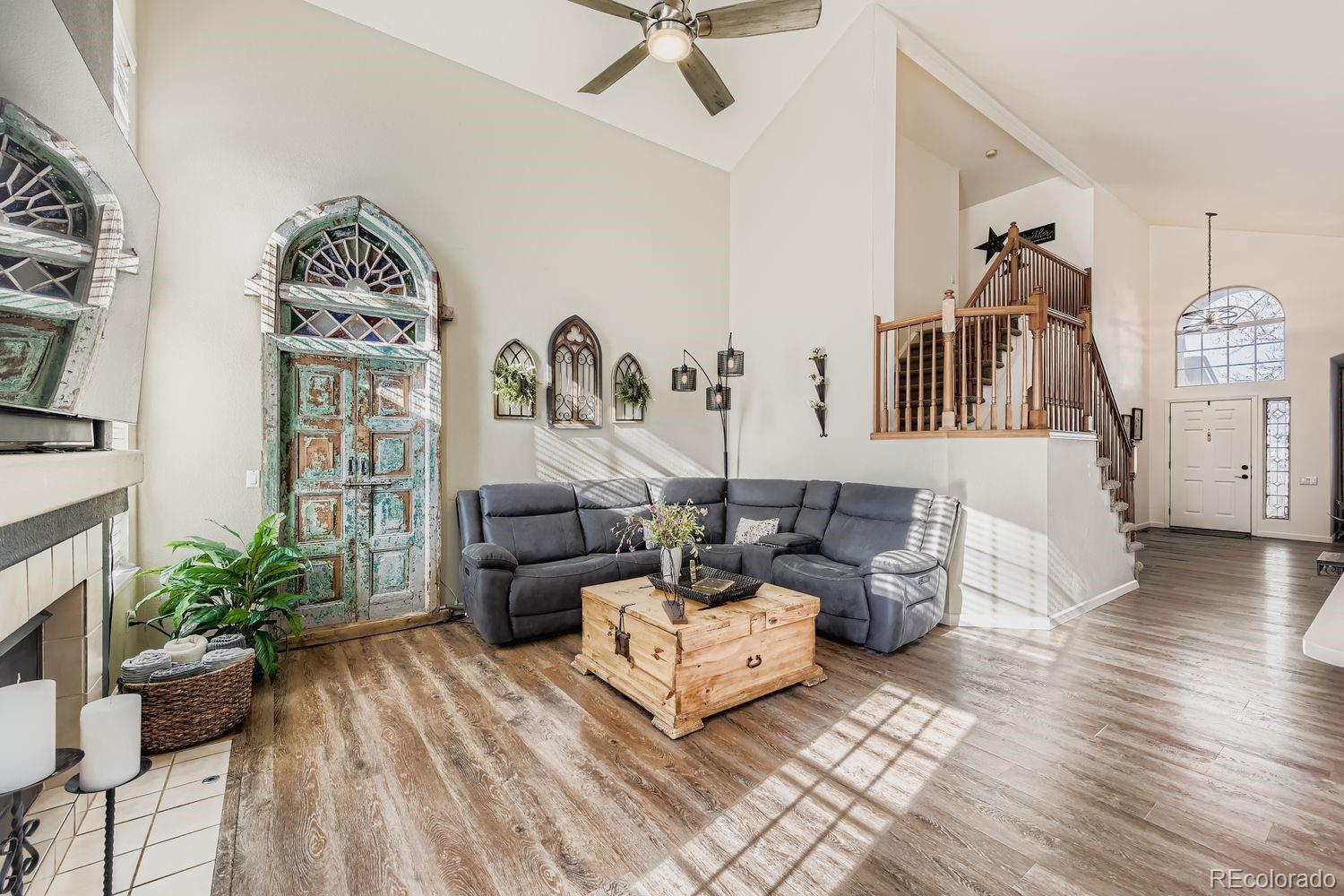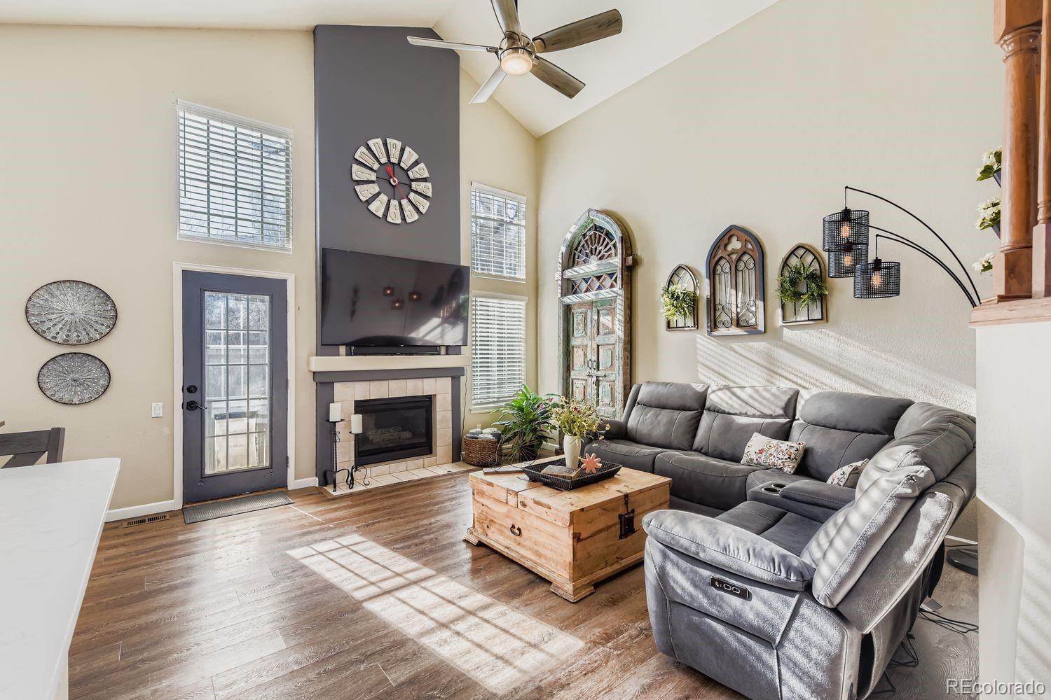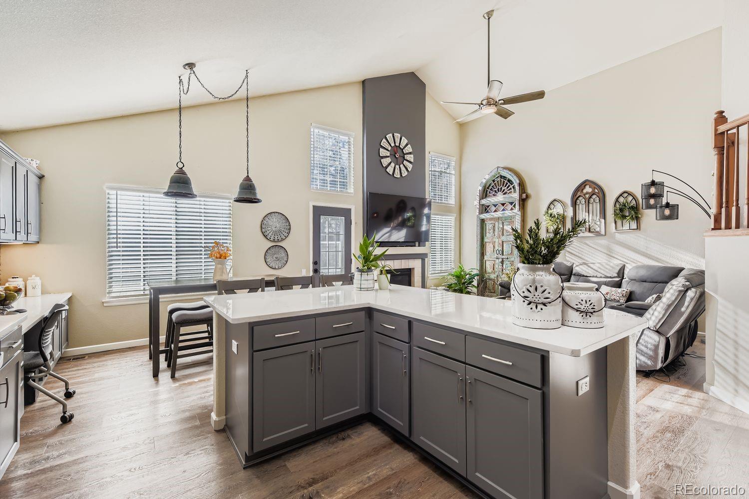 Welcome to this charming and spacious 4-bedroom home nestled in the highly sought-after Highlands Ranch community. Upon entry, soaring vaulted ceilings and abundant natural light create an immediate sense of warmth and openness. Formal living and dining rooms greet you at the front of the home, offering elegant spaces for everyday living or special gatherings. The updated kitchen is thoughtfully designed with a large L-shaped quartz island, stainless steel appliances, ample cabinetry, and a spacious pantry. A sunny breakfast nook overlooks the backyard, while the kitchen flows seamlessly into the family room, featuring vaulted ceilings, a cozy gas fireplace, and direct access to outdoor living. A true highlight of the home is the main-floor primary suite, providing convenience and comfort. This generous retreat includes a beautifully remodeled five-piece bathroom with a soaking tub, walk-in shower, and walk-in closet. Upstairs, three additional bedrooms and a full bathroom offer flexibility for guests, work-from-home space, or family needs. The finished basement is perfect for entertaining, complete with a wet bar, seating area, and a large space for movies, games, or gatherings. Outside, enjoy a low-maintenance backyard with multiple patio areas and a turf lawn, ideal for relaxing or hosting. Located in a vibrant neighborhood with access to four state-of-the-art recreation centers, miles of trails, and convenient shopping and dining just minutes away, this home offers the best of Highlands Ranch living.