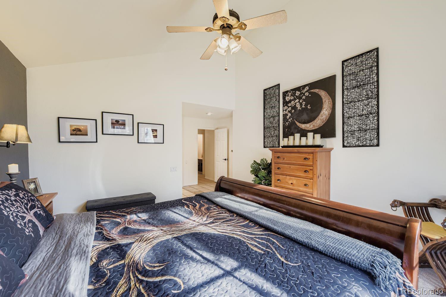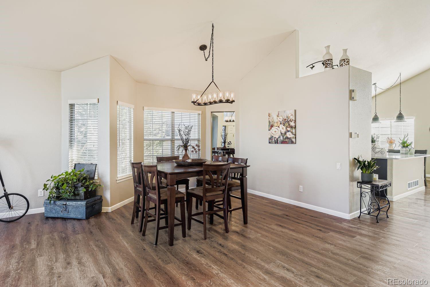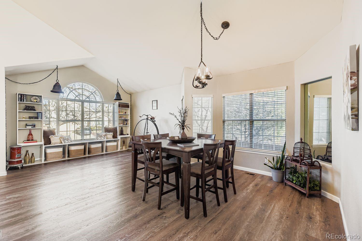 Welcome to this charming and spacious 4-bedroom home nestled in the highly sought-after Highlands Ranch community. Upon entry, soaring vaulted ceilings and abundant natural light create an immediate sense of warmth and openness. Formal living and dining rooms greet you at the front of the home, offering elegant spaces for everyday living or special gatherings. The updated kitchen is thoughtfully designed with a large L-shaped quartz island, stainless steel appliances, ample cabinetry, and a spacious pantry. A sunny breakfast nook overlooks the backyard, while the kitchen flows seamlessly into the family room, featuring vaulted ceilings, a cozy gas fireplace, and direct access to outdoor living. A true highlight of the home is the main-floor primary suite, providing convenience and comfort. This generous retreat includes a beautifully remodeled five-piece bathroom with a soaking tub, walk-in shower, and walk-in closet. Upstairs, three additional bedrooms and a full bathroom offer flexibility for guests, work-from-home space, or family needs. The finished basement is perfect for entertaining, complete with a wet bar, seating area, and a large space for movies, games, or gatherings. Outside, enjoy a low-maintenance backyard with multiple patio areas and a turf lawn, ideal for relaxing or hosting. Located in a vibrant neighborhood with access to four state-of-the-art recreation centers, miles of trails, and convenient shopping and dining just minutes away, this home offers the best of Highlands Ranch living.