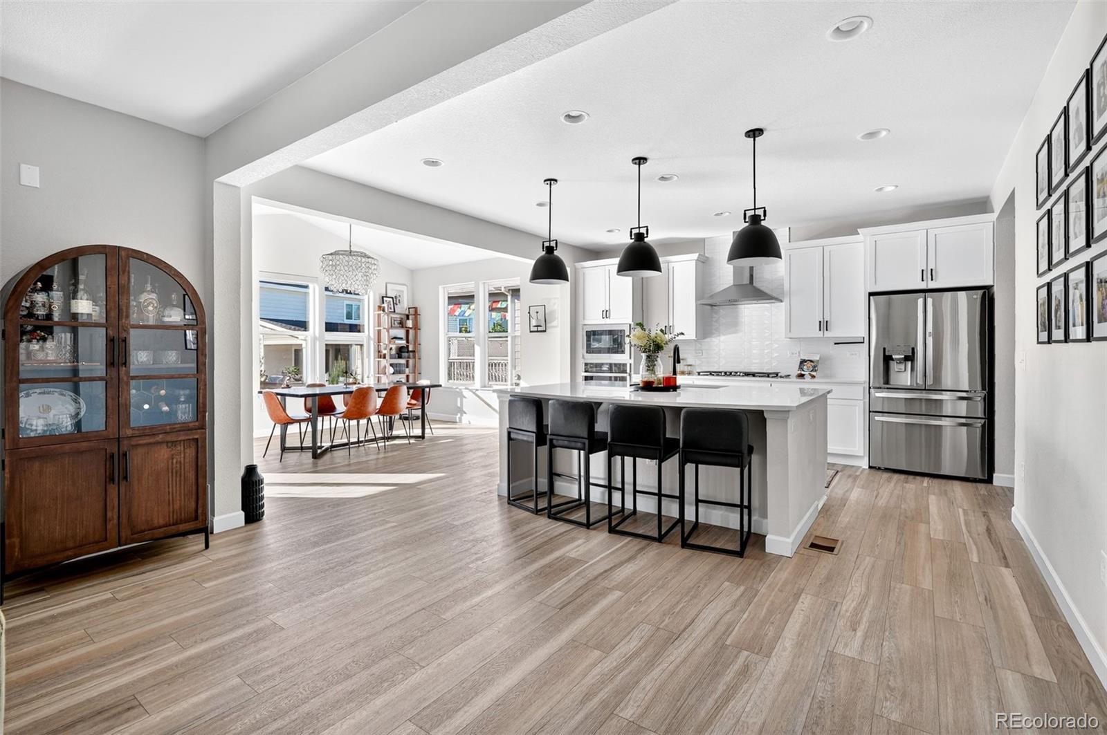Set in the heart of Colliers Hill, this refined and move-in ready Hemingway model offers over 3,700 finished square feet of thoughtfully designed living space, blending elevated style with everyday functionality. The main floor features a private study framed by french doors and an open-concept layout ideal for entertaining, complete with a modern fireplace, upgraded designer lighting, and a sun-filled dining area that opens to the covered patio and fully landscaped backyard. The kitchen anchors the space with quartz countertops, stainless steel appliances, dedicated pantry storage, and a large center island perfect for hosting guests, casual family meals, and intimate dinners. Upstairs, you’ll find a spacious loft, three well-sized secondary bedrooms, and a serene primary suite with a large, custom walk-in closet and private en-suite bath. The finished basement adds flexible living space with a dedicated media and recreation area, guest bedroom, and a full bath, offering comfort and privacy for visitors or multigenerational living. Located just steps from Colliers Hill’s exceptional amenities- including two resort style pools, a state-of-the-art fitness center, clubhouse, miles of walking and biking trails, community parks, and top-rated St. Vrain Valley schools- this home offers the rare opportunity to enjoy a nearly new build with the added benefit of high-end finishes and a fully completed outdoor living space.