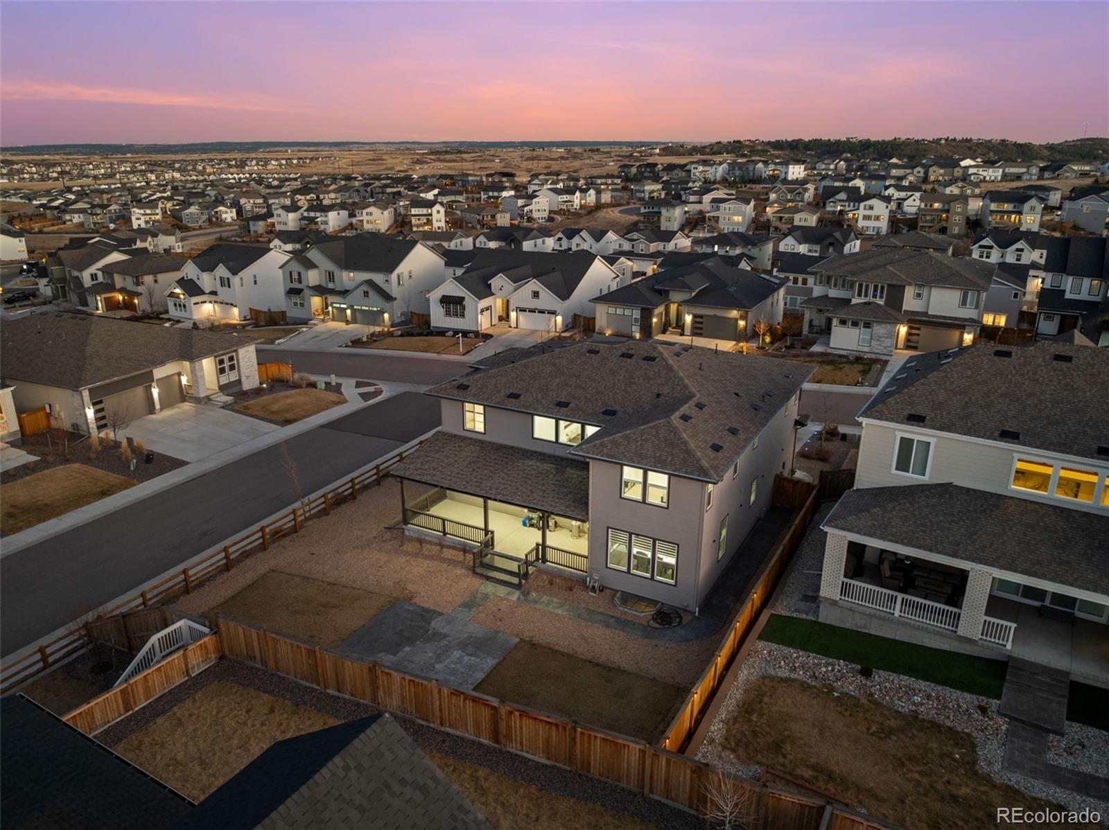 Step into refined Colorado living with this Keystone II home by Taylor Morrison, ideally located in the desirable Timberline community of Castle Pines. This thoughtfully designed residence offers five bedrooms, five bathrooms, and a three-car garage, complemented by vaulted ceilings and nine-foot ceilings on every level for a bright, open atmosphere. The main floor features a guest bedroom with a full bath and a private study with French doors—ideal for working from home. The great room showcases soaring ceilings, a cozy fireplace, and custom design details that flow seamlessly into the chef-inspired kitchen, featuring upgraded finishes and a stylish backsplash, perfect for entertaining. Outdoor living is a standout with a professionally finished backyard featuring a stamped concrete patio, stained fencing, an integrated sprinkler system, and a covered patio for year-round enjoyment. Comfort and technology upgrades include a pre-wired home theater sound system with 7.2 surround sound in the living room and 5.2 in the primary suite; remote-controlled dual-shade blinds with honeycomb blackout shades in all bedrooms; and a water softener and reverse osmosis system. The unfinished basement includes rough-ins and ample storage, offering excellent potential for future expansion. Located in the award-winning Douglas County School District and minutes from top-rated elementary, middle, and high schools. Enjoy proximity to neighborhood parks, Daniels Park, The Country Club at Castle Pines, and convenient access to E-470, I-25, DTC, and Castle Rock Outlets. HOA included through the metro tax district.