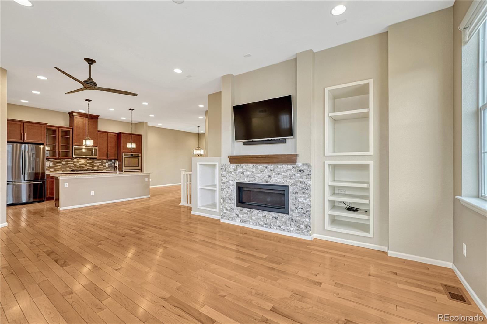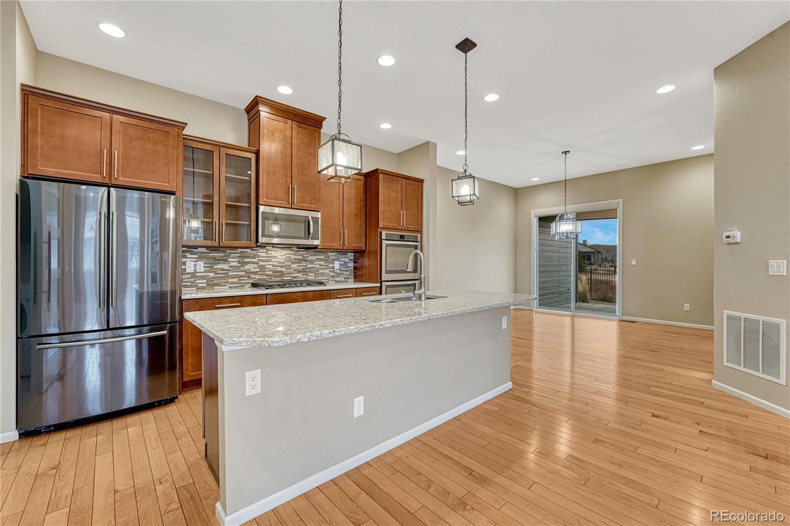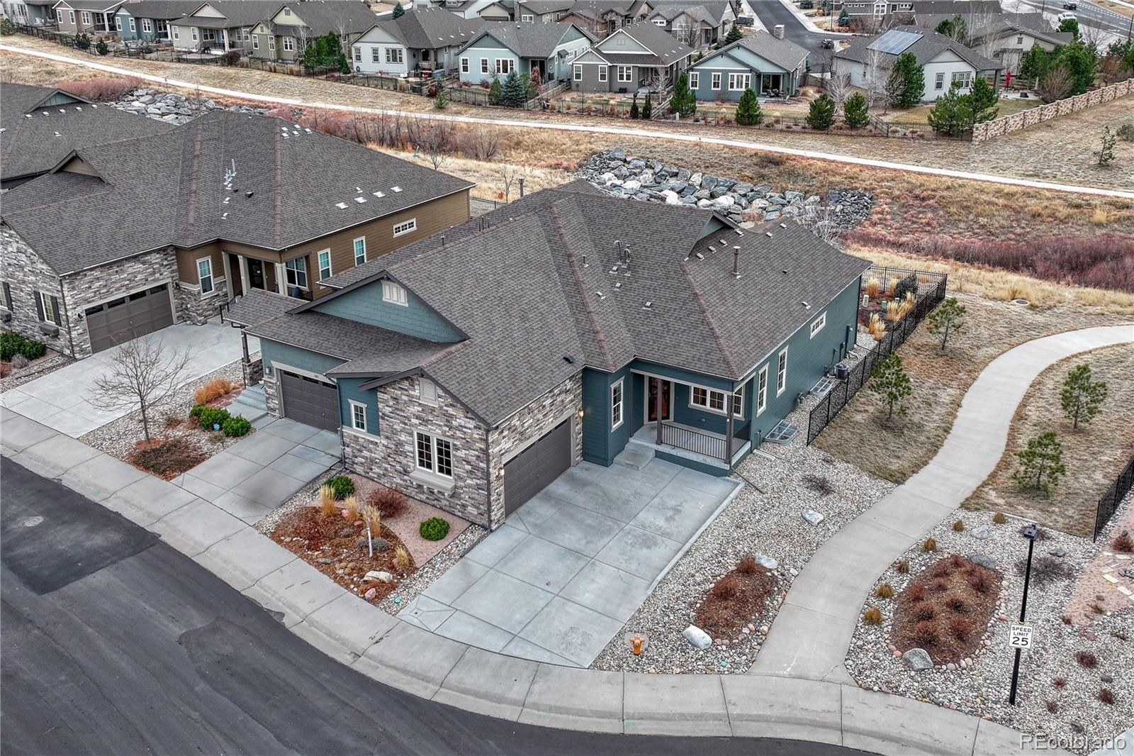 PRICED TO SELL. BEST LOT AVAILABLE AT NEW HAVEN IN THE MEADOWS. Backs to open space, open floor plan, finished basement. Main level includes 2 bedrooms, 2 bathrooms, office, laundry room with utility sink, gas fireplace, stone surround, hardwood floors, 10' ceilings, covered front porch, & lots of natural lighting. Gourmet kitchen includes a double oven, 4 burner gas cooktop, stainless steel appliances, large island, slab granite countertops, room for stools, beautiful backsplash, and designer pendant lighting. Primary bedroom includes views of the open space, coffered ceiling, bathroom with a walk-in shower, closet w/built-in shelving, dual sink vanity, Corian countertops and tile floors. Fully finished basement has 9' ceilings, large great room, wet bar rough-in, bedroom, full bathroom, & finished/unfinished storage areas. All appliances at the property are included. Other items include private covered back patio w/views, sun shades, garage w/epoxy flooring, professionally landscaped yard, central A/C. HOA includes exterior maintenance & insurance, snow removal, yard maintenance/watering, trash/recycle, and more. This home has a no maintenance yard plus reduced homeowners insurance with an H06 policy. Located in The Meadows, this property is close to stores, restaurants, hiking/biking trails, parks with tennis & pickle ball courts, schools, I-25, DTC, and much more.