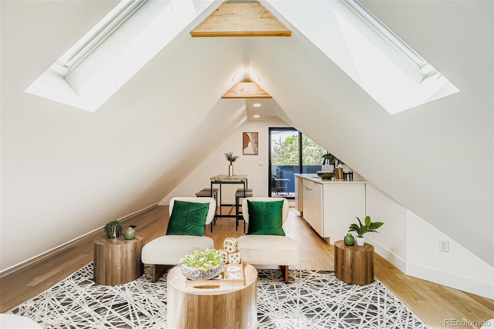 Stunning contemporary Duplex in the heart of highly desirable Sunnyside, perfectly positioned across from iconic La Raza Park—currently undergoing an impressive $8M renovation—ideal for dog walks, play, and everyday relaxation. Inside, an open, airy floor plan is flooded with natural light from dramatic floor-to-ceiling windows and skylights front to back of the home. The chef’s kitchen anchors the main level, featuring quartz countertops, a large island, stainless steel appliances, High efficiency induction stove, under-mount sink, in-wall pot filler, and generous prep and storage space—made for people who love to cook and entertain. Also on the main floor is a private bedroom with ensuite five-piece bath and spacious walk-in closet, easily functioning as a main-floor primary suite. Upstairs, you’ll find a second primary suite with 3/4 bath, an additional bedroom with full bath, and a cozy loft with park and city views—perfect for an office, reading nook, or lounge. The third level offers a private retreat with wet bar and a west-facing balcony to enjoy evening sunsets. The finished basement lives large with tall ceilings, two egress windows, a generous recreation room, guest bedroom, full bath, and extra storage—great for guests, gym, media room, or kids’ space. Outside, the low-maintenance backyard is private and leads to a two-car detached garage. Thoughtful upgrades include oak hardwood floors, custom lighting, sleek metal railings, multi-zone heating and cooling, tankless water heater, and seller-owned solar panels—keeping average utilities around $100/month, home is completely build green with excellent walkability to Sunnyside’s popular shops, coffee spots, and restaurants, this home delivers the space, style, and location buyers are looking for.