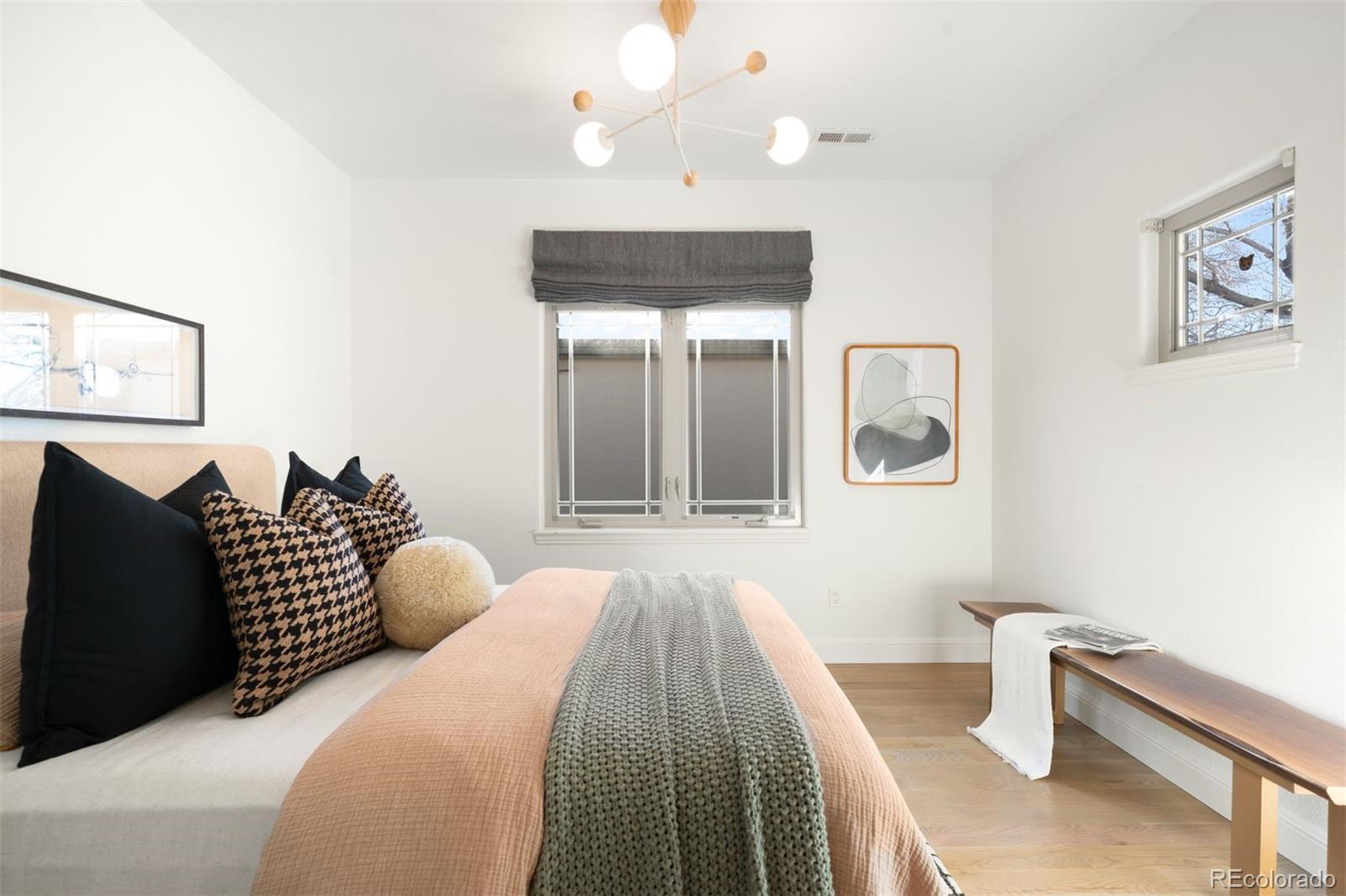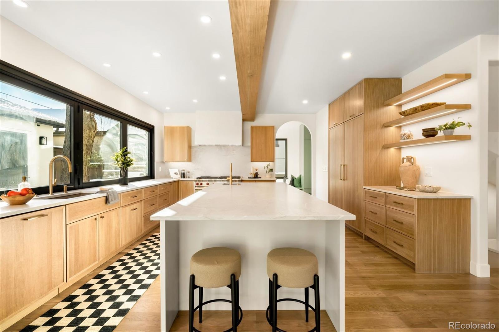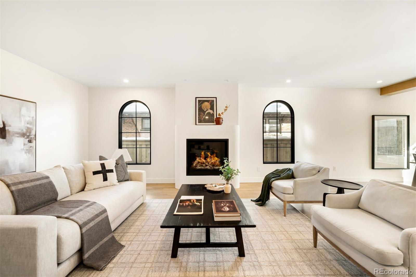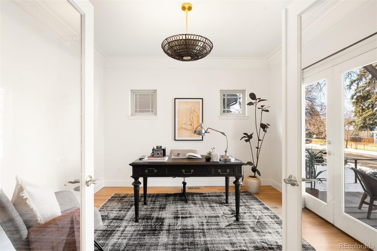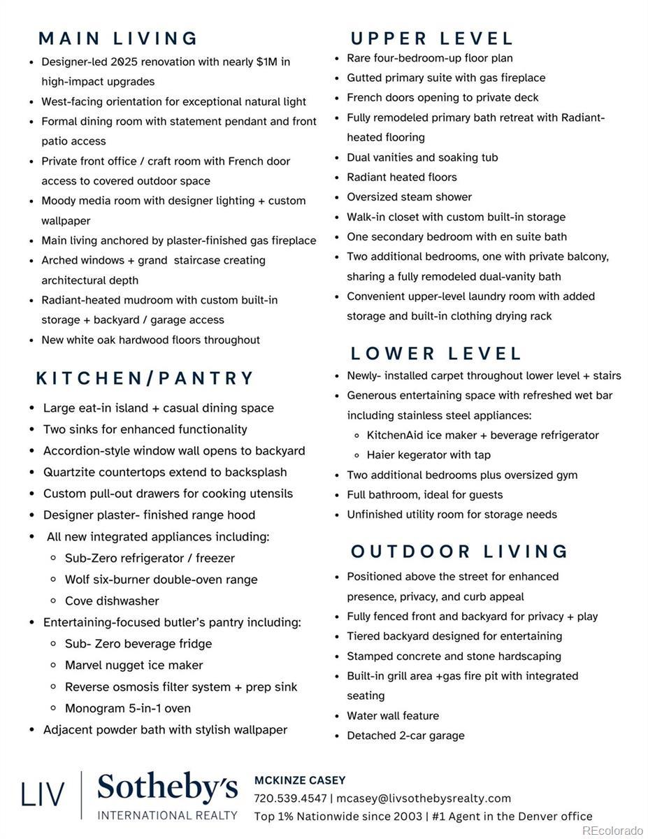 Light and mood define this west-facing Cory Merrill residence, fully reimagined in 2025 through a designer-led renovation with the intention of being a forever home. Set on a tree-lined street, it balances classic Denver charm with nearly $1M in high-impact updates, including brand new major mechanicals. White oak hardwood floors now run throughout the main and upper levels, replacing all carpet, and all bathrooms feature new fixtures. A formal dining room and private office open through French doors to outdoor spaces, creating seamless indoor-outdoor flow. The main floor was fully renovated with a stylish powder bath, a mudroom with radiant heated floors, and a butler’s kitchen featuring reverse osmosis water system, built-in ice machine, prep sink, beverage fridge, and 5-in-1 oven. A moody media room leads to the main living area, where arched windows, gas fireplace, and winding staircase add architectural presence. The new kitchen anchors daily living: a large eat-in island faces accordion-style windows to the backyard, with Sub-Zero refrigeration, Wolf double oven range, custom plaster hood, quartzite countertops and backsplash, and generous storage. The primary suite is a private retreat with gas fireplace, French doors to a secluded deck, renovated bath with dual vanities, soaking tub, steam shower, radiant heated floors, and custom walk-in closet. Three additional bedrooms complete a rare four-bed-up layout, including one en suite and two sharing a dual-vanity bath, plus a convenient laundry. The lower level expands livability with new carpet, a refreshed wet bar, two bedrooms-plus oversized gym-a full bath, and ample storage. Outdoors, fully fenced front and back yards feature tiered landscaping, stamped concrete, built-in gas fire pit, grill area, water feature, and seating, perfect for entertaining. Thoughtfully designed for comfort, function, and enduring style, this home was only left by its owners due to a job relocation.