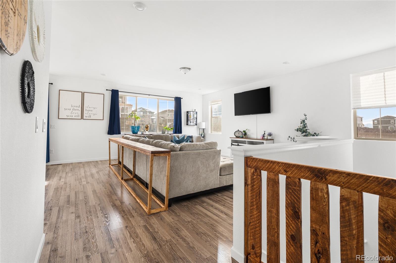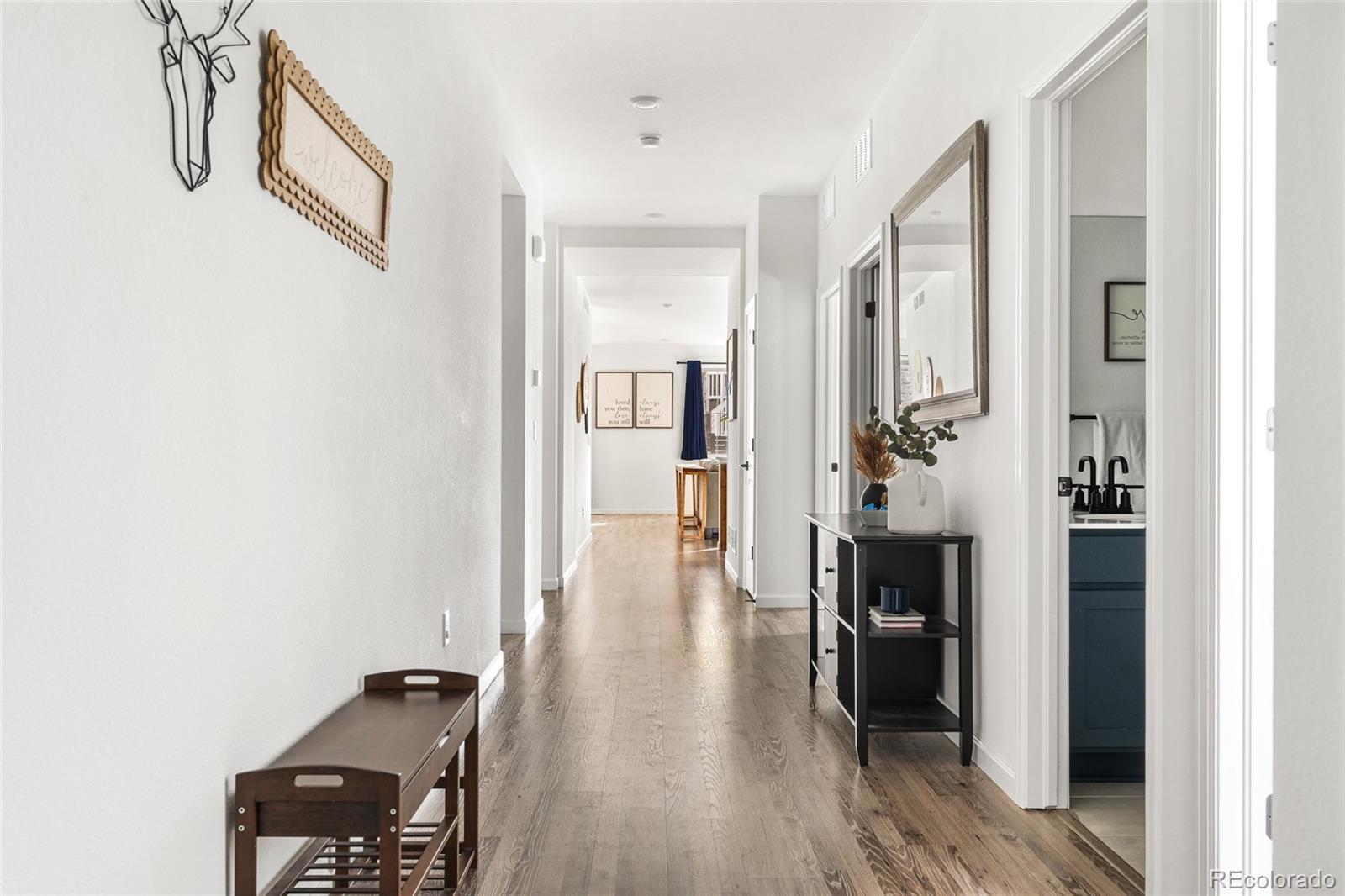A rare Ranch style home on a corner lot in the gorgeous newer community of Harmony. Built in 2024, this home feels brand new, yet you won't have to deal with ongoing neighborhood construction, nor spend your summer landscaping the backyard! This move-in ready home welcomes you with a covered front porch where you can sip your morning coffee while gazing across the street at the green space. Step inside to an expansive open floor plan, featuring 3 spacious bedrooms and 2 beautiful bathrooms. The primary suite feels incredibly private and you will love the walk-in closet. The kitchen gets tons of natural light and flows freely into the dining and living rooms. Outside, enjoy a fully fenced backyard with an extended deck, ideal for gatherings, summer barbecues, or simply soaking up the Colorado sunshine. High-end pet-friendly turf with french drains have been installed for practicality and low maintenance living. A huge unfinished basement provides endless possibilities — finish out a game room, an office, another bed & bath — perfect for entertaining or spreading out. Life here extends beyond your front door with resort-style amenities including a clubhouse with fitness center, sparkling pool & hot tub, game room, golf simulator, parks, trails and basketball courts. Neighbors come together for food trucks, community events and year-round gatherings, creating a lively and welcoming community. With easy access to I-70, E-470, DIA, shopping and dining at Southlands, everything you need is in close proximity. If you love to travel & frequent the airport, living here is a huge bonus! Schedule your showing today.