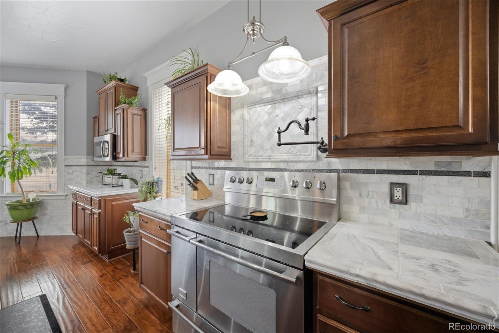 Welcome to this beautifully preserved Victorian built in 1908 that has been updated for modern living. This move-in-ready home showcases striking curb appeal with a classic stucco-and-stone exterior, a welcoming covered front porch, and a private covered side patio. A fully fenced backyard creates an ideal space for relaxing or entertaining. Interior features: central air, a secondary mini-split system, ceiling fans, a tankless water heater, a whole-house water softening system. Stained and painted wood trim paired with premium flooring, hand-scraped teak hardwoods. Gourmet kitchen featuring stainless steel appliances, a double wall oven, a range with two ovens, pot filler, microwave, white marble countertops. A 13-foot custom island anchors the space, and a walk-in pantry for ample storage. The main level features a living room, formal dining room, mudroom, half bath, and a flexible bonus room. Upstairs you will find a sitting room, laundry room, full bathroom, three bedrooms, and a balcony. The primary suite occupies the third level. This features a breakfast bar, microwave, mini-fridge, walk-in closet, a 5-foot shower, and two-person jetted tub. The finished basement provides an ideal storm shelter and possible wine cellar, along with an unfinished utility room. Outdoor you will find a detached heated shop offering 1,416 sq. ft. with of upstairs storage. The property also includes a 1,115 sq. ft. ADU with a full kitchen, bedroom, and bathroom—currently leased as business space—as well as a separate 300 sq. ft. unattached single-car garage. Additional highlights include a covered RV carport with a 30-amp connection. This exceptional property blends historic charm, modern upgrades, income potential, and versatile space. Appraised on October 3, 2025, at $610,000. This property is ideal for a multi-generational home. Could be a Bed and Breakfast or an Airbnb.