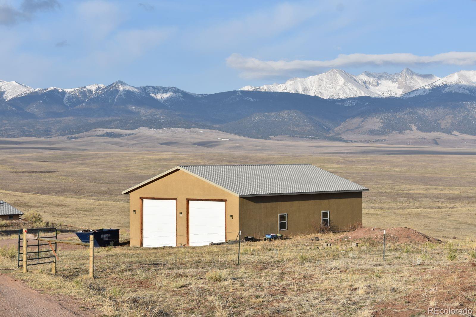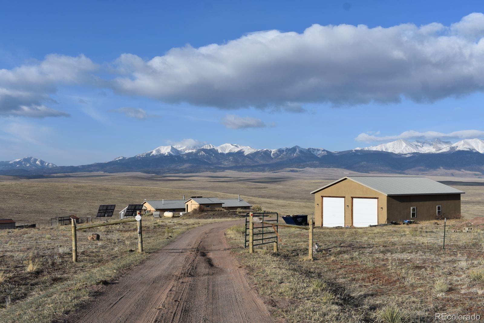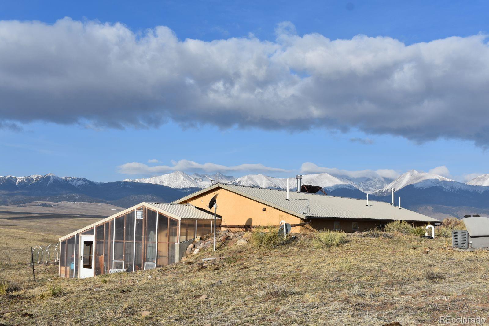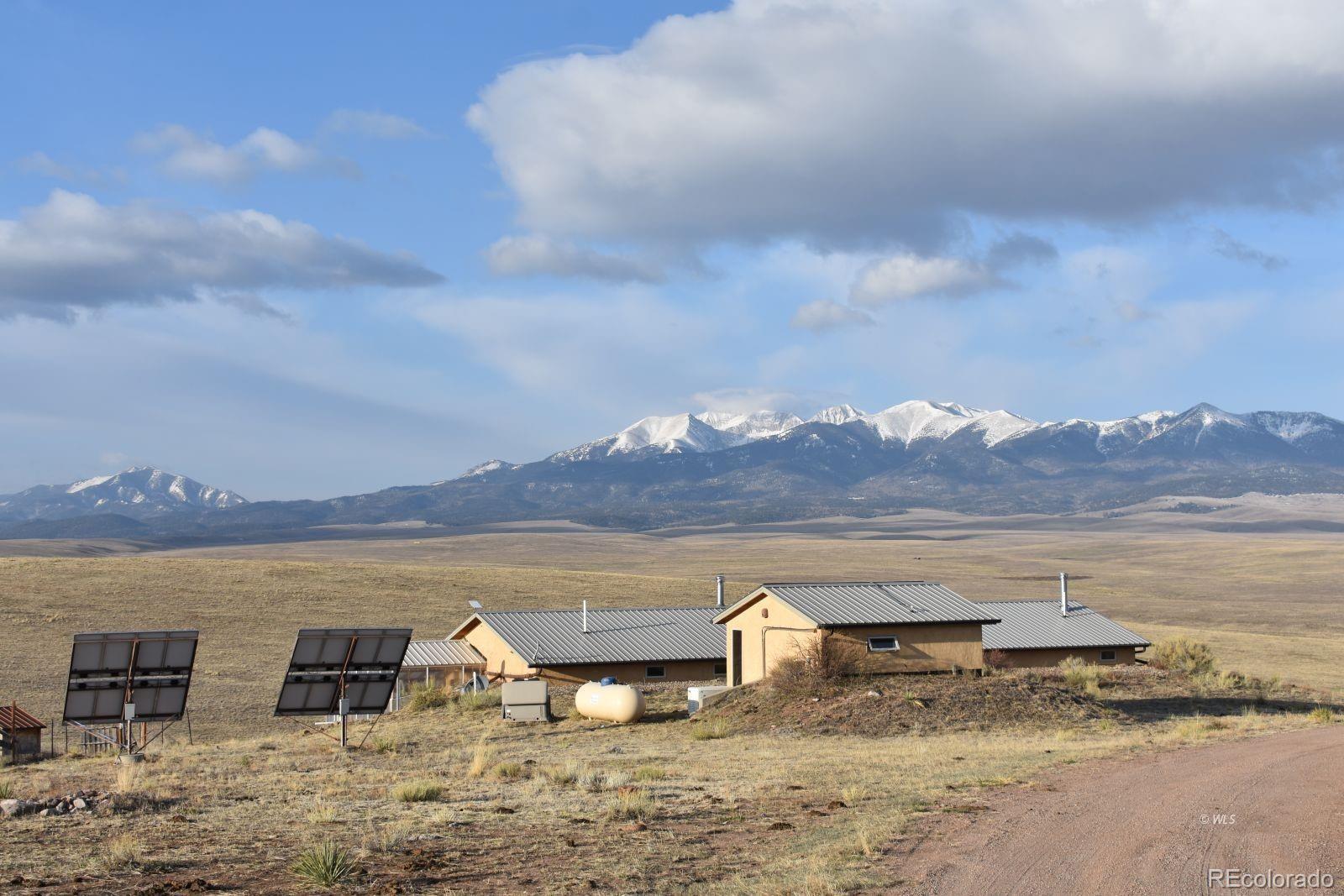 This welcoming one-story stucco home on 35 acres offers stunning, panoramic mountain views and the ultimate off-grid living experience. With 3 bedrooms, 3 baths, and 1,976 square feet, this Energy Star V2 certified home is designed for eco-friendly living. The home features bright windows for generous solar passive heat and forced air heat, an ample solar power system and automatic Generac backup generator. A highlight is the attached 500 sq ft greenhouse and built-in planters with a 2,400-gallon roof rainwater catchment system, gravity-fed to nourish your plants. The spacious greenhouse provides ample room for year-round growing. Additional out buildings include a studio/solar barn perfect for hobbies or a creative workspace, and a large garage/workshop with 14-foot ceilings, double 12x12 overhead doors, and rough-in plumbing for a future bathroom and kitchen. This property offers off-grid living at its best, with everything you need for sustainable homesteading. Located just 1.5 miles off the highway and 12 miles from the charming town of Westcliffe, it combines seclusion with easy access to amenities. Don't miss this rare opportunity!