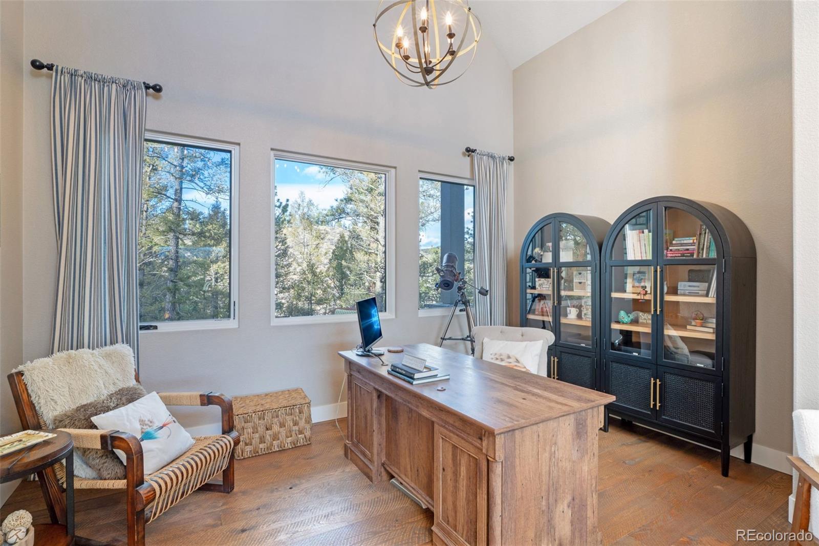 Set on 35+ acres of usable mountain land, this property offers rare privacy and endless possibility. Imagine horses grazing at sunset, a hobby farm tucked into the hills, or simply wide-open space to call your own. The acreage includes grazing areas and room for a future barn or shop. Zoning allows for additional living space — whether you envision a charming bunk house, private retreat, or comfortable in-law quarters — and the well and septic system are already prepared for expansion. Explore your own land with hiking, 4-wheeling adventures, or safe target practice right on your property. Watch wildlife wander through the trees and enjoy wide-open skies by day and brilliant stars at night. Surrounded by wonderful neighbors who value community yet respect privacy, you’ll experience the perfect balance — close enough to connect, yet far enough to truly unwind. The home itself is a true show home, thoughtfully designed with every high-end detail included. Expansive windows bring the outdoors in, filling the space with natural light and breathtaking views. The covered deck with outdoor heaters invites year-round enjoyment — from quiet mornings overlooking Pikes Peak to relaxed evenings under open skies. Designed to be low maintenance inside and out, the home allows you to spend less time on upkeep and more time enjoying mountain life. Quality finishes and intentional design make everyday living effortless. Perfectly positioned near Pine Junction with easy access to Highway 285, you’re close to dining, and daily essentials while still immersed in peaceful mountain beauty. Just minutes to Pine Valley Ranch for hiking and biking, approximately 30 minutes to Deckers and the Gold Medal waters of the South Platte for world-class fly fishing, and just over an hour to popular ski resorts, this location blends accessibility, recreation, all anchored by your own 35-acre sanctuary — a place to slow down, breathe deeply, and step away from the pace of everyday life.