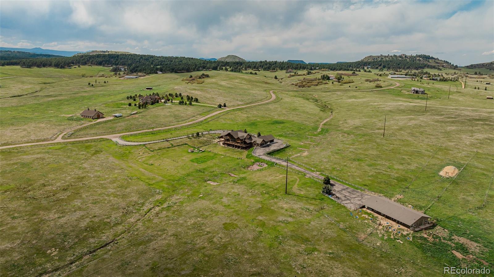 Set on 35 acres of pristine Colorado landscape, this exceptional ranch estate with a loft offers 4 bedrooms, 5 bathrooms, and an unmatched blend of privacy, luxury, and panoramic views of the valley and Pikes Peak. Every inch of this home reflects thoughtful design and timeless craftsmanship. The breathtaking great room features a 29-foot vaulted ceiling with exposed timber beams, a wall of windows that floods the space with natural light, rich hardwood flooring, elegant chandeliers, and a dramatic stone-wrapped fireplace. The gourmet kitchen is a chef’s dream with slab granite countertops, custom cabinetry, dual oversized islands—one with a gas cooktop and antler chandelier, the other with a prep sink and bar seating—plus a cozy breakfast nook and walk-in pantry. A formal dining room with vaulted wood ceilings and hardwood floors sets the stage for memorable gatherings. The main-level primary suite is a luxurious retreat with a fireplace, vaulted wood ceiling, and access to a wrap-around covered deck. The spa-inspired en-suite bath features a massive walk-in steam shower, soaking tub, dual vanities, and two walk-in closets—one with its own washer and dryer. Downstairs, the finished walk-out lower level includes a spacious family room with wet bar and fireplace, an authentic in-home theater, and two additional en-suite bedrooms. Outdoors, enjoy a fenced backyard, fenced pasture, and a 3,500+ sq ft barn with 3 stalls and 10 doors—perfect for horses or hobby livestock. This is Colorado living at its finest—where beauty, privacy, and sophistication converge. It’s more than a home—it’s a legacy. Conveniently located just 6 minutes from I-25! View the aerial tour here: sites.listvt.com/vd/192473071 and the Matterport tour here: my.matterport.com/show/?m=dZkrVBPyUiJ