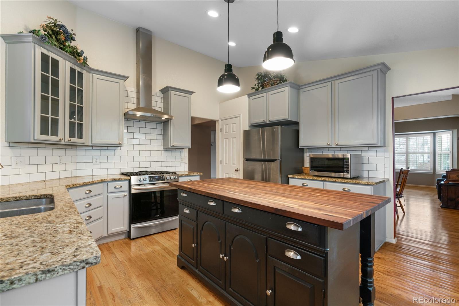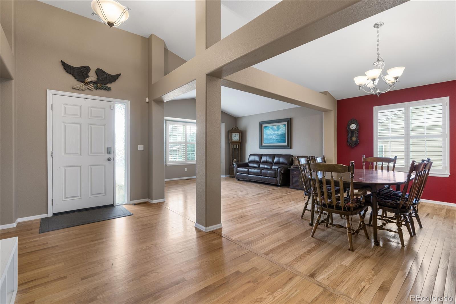 Welcome to 875 Dales Pony Dr. in Castle Rock, Colorado. Enjoy the small town feel with unparalleled shopping and dining, and incredible community events. Nestled in the tranquil Haven neighborhood, this five bedroom retreat is ready to entertain your guests. Upon entering through the foyer, spacious formal living and dining rooms with vaulted ceilings and gleaming hardwood floors are sure to impress. Unwind in the great room featuring a stone, gas fireplace, and abundant windows flowing into the updated kitchen with gorgeous granite countertops, butcher block island, crisp subway tile backsplash, pantry, and precision gas range perfect for passionate home chefs. Elegant white plantation shutters grace nearly every window- close them for ultimate seclusion or raise them to flood the rooms with soft, natural sunlight. The primary bedroom again features high ceilings with an attached five-piece bathroom, large double vanity, soaking tub, and walk-in closet. Two more bedrooms upstairs share a bathroom with double sinks and the laundry room completes the main level. Downstairs in the basement, you’ll find a fourth and fifth bedroom, one with an ensuite bathroom. An additional full bathroom is set up alongside the large entertainment area featuring a sleek, wet bar, pool table, and media area. A large finished storage room completes the lower level. A three-car garage offers ample room for vehicles and all your toys, steps from the convenient mudroom bench for easy transitions. Outside, a low maintenance xeriscaped yard, raised garden beds, and flagstone pathways border the beautiful stamped concrete patio. Gather your loved ones and discover your dream home today!