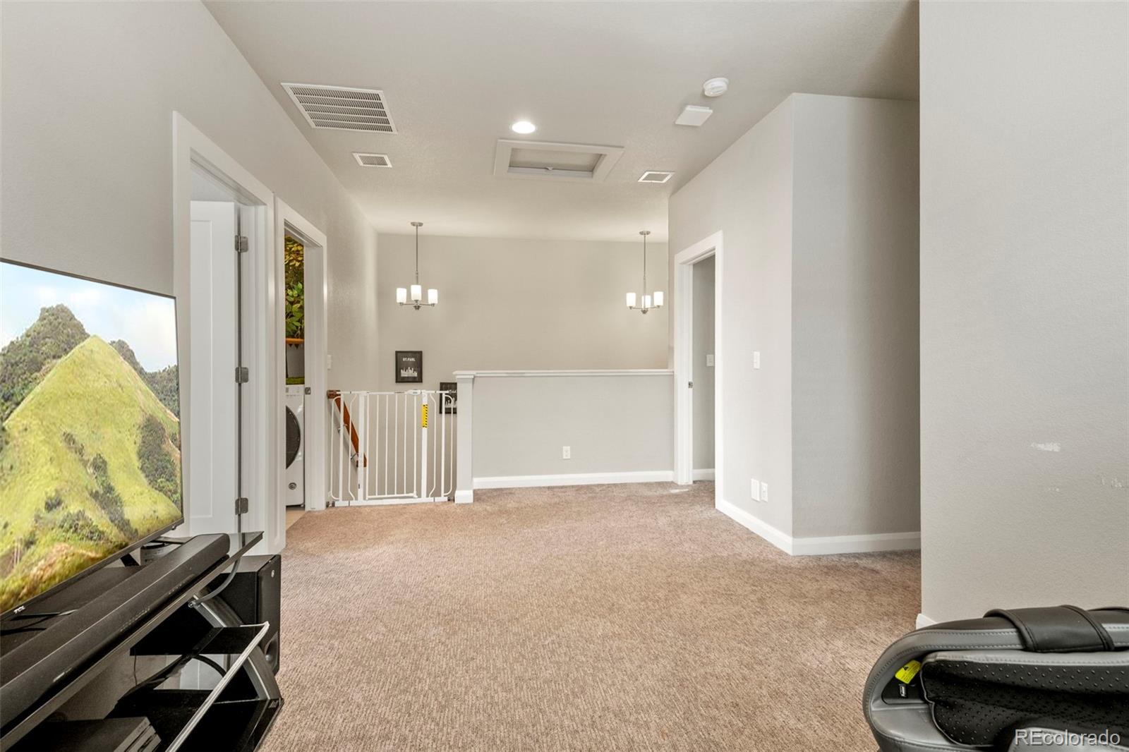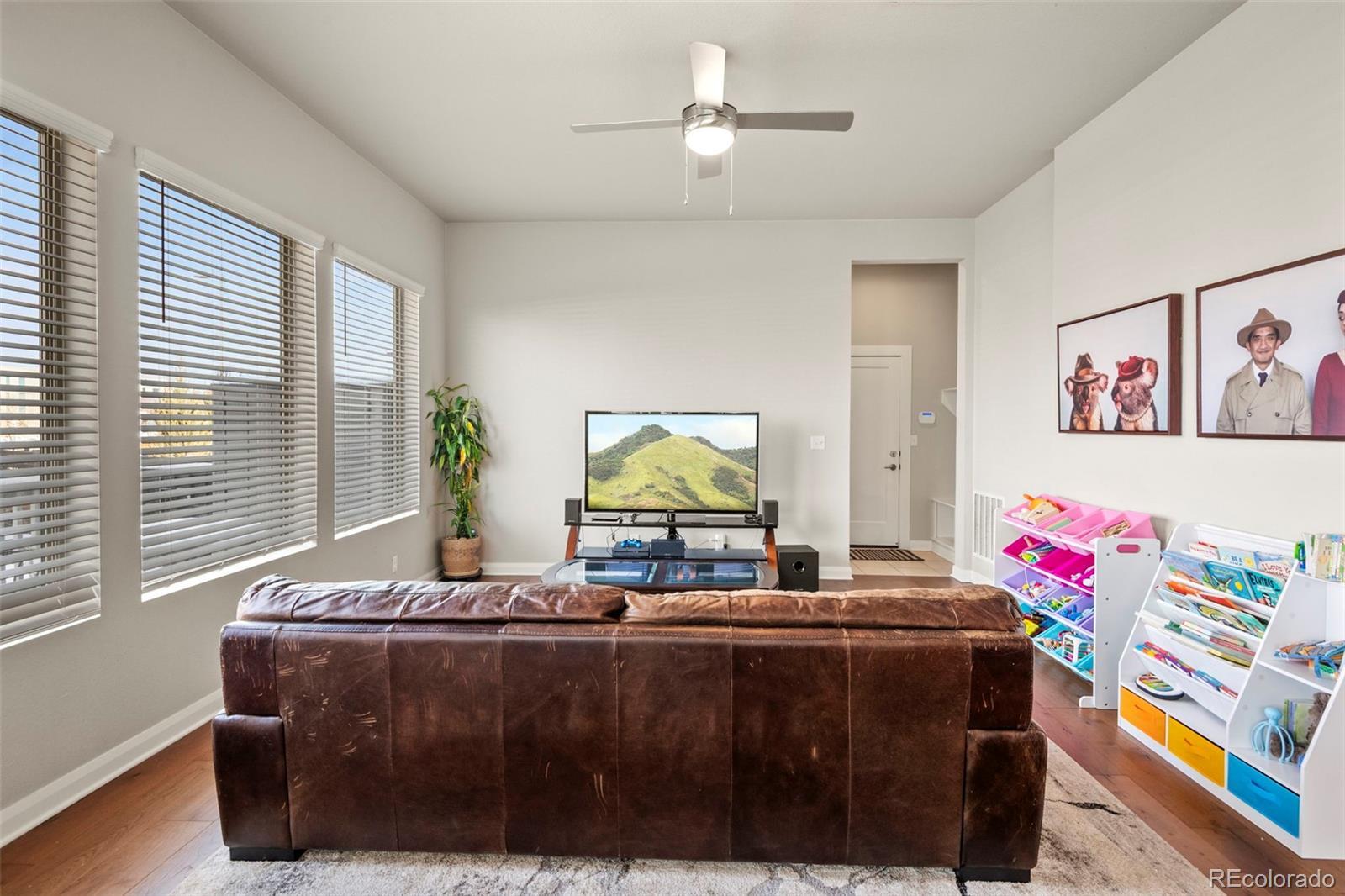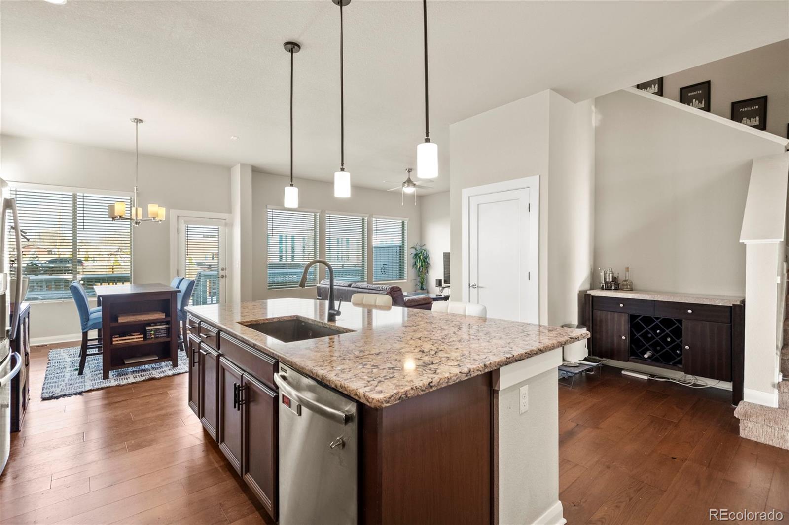 Welcome to this exceptional David Weekley Homes Energy Star–Certified residence with seller-owned solar, offering meaningful energy efficiency and long-term savings on utility bills. Thoughtfully designed for modern living, this home blends style, comfort, and sustainability in one of Denver’s most sought-after communities. Designed for effortless entertaining, the open-concept main level is anchored by a chef’s kitchen featuring a generous quartz island, stainless steel appliances, gas range, custom lighting, and abundant cabinetry. Hardwood floors run throughout the main level, creating a warm, cohesive feel. Just off the entry, a dedicated home office with French doors provides the perfect space for remote work, study, or creative pursuits. The expansive primary suite delivers a private retreat, with a roomy layout and ensuite bath. Additional bedrooms are thoughtfully placed to accommodate family, guests, or home office needs. An upstairs loft lends extra living space. Multiple full baths ensure comfort and convenience for everyone. Enjoy mountain views and gorgeous Colorado sunsets from your private backyard with no home immediately behind you. The lower level is built for relaxation and fun, boasting a built-in home theater ideal for movie nights, game days, or hosting guests. A spacious crawl space offers excellent additional storage, a rare and valuable feature. Located in the vibrant Midtown community, residents enjoy an unparalleled lifestyle with access to Trailside K-8 School, a Montessori preschool, community center, garden, microbrewery, multiple dog parks and playgrounds, extensive bike trails, and RTD Light Rail access. A new 20+ acre park sits just west of the neighborhood, while Trader Joe’s and Downtown Denver are only minutes away. With easy access to Downtown Denver and all of the recreational opportunities Colorado provides, this home offers the perfect balance of urban convenience, community living, and outdoor adventure.