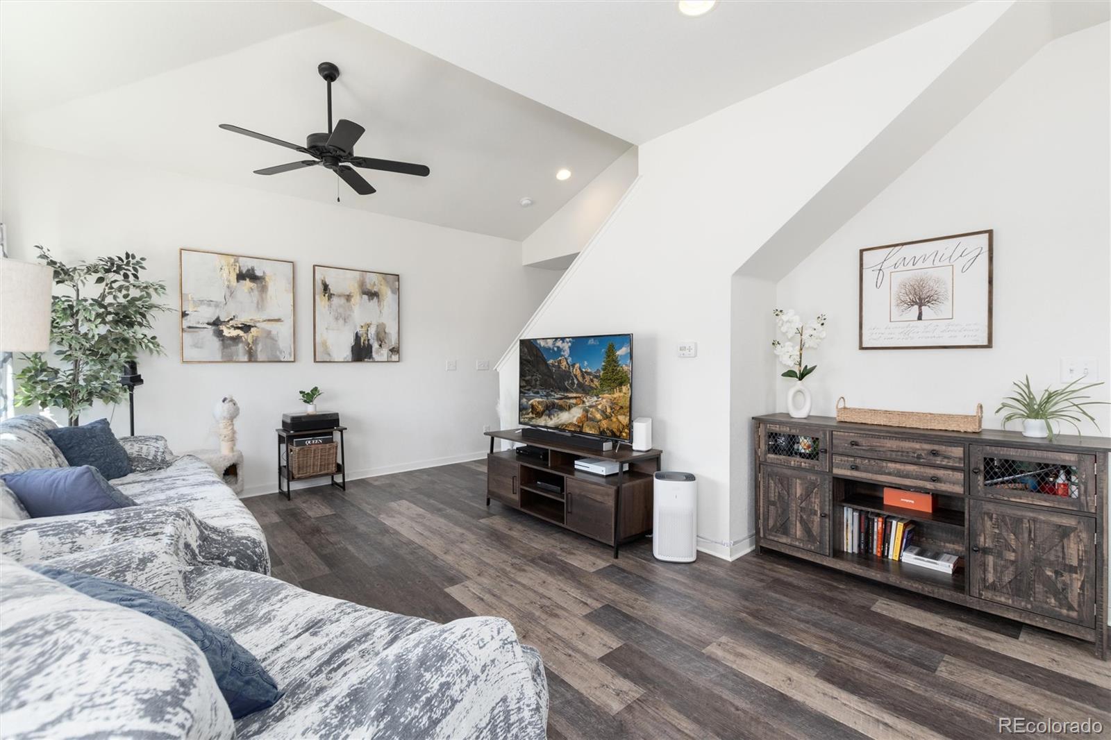 Vaulted ceilings • granite kitchen island • new luxury vinyl plank flooring • new roof 2024 • upper-level laundry • corner lot • turf backyard • garage overhead storage. Entering the home, vaulted ceilings create an open feel in the main living area, where the living room flows directly into the dining space and kitchen. New luxury vinyl plank flooring runs throughout the main level, connecting the living spaces with a durable and updated finish. The kitchen includes granite countertops, a center island with seating and prep space, and a newly installed dishwasher. The layout keeps the kitchen connected to the living area while maintaining dedicated workspace and storage. A half bathroom is also located on the main floor. Upstairs, the home features two bedrooms and two full bathrooms. The laundry area is conveniently positioned on the upper level near the bedrooms. The backyard sits on a corner lot and is finished with turf throughout, creating a low-maintenance outdoor space. Additional improvements and features include a new roof installed in 2024, four exterior security cameras included, and a garage with overhead storage. Listing Broker takes no responsibility for its accuracy and all information must be independently verified by buyers.