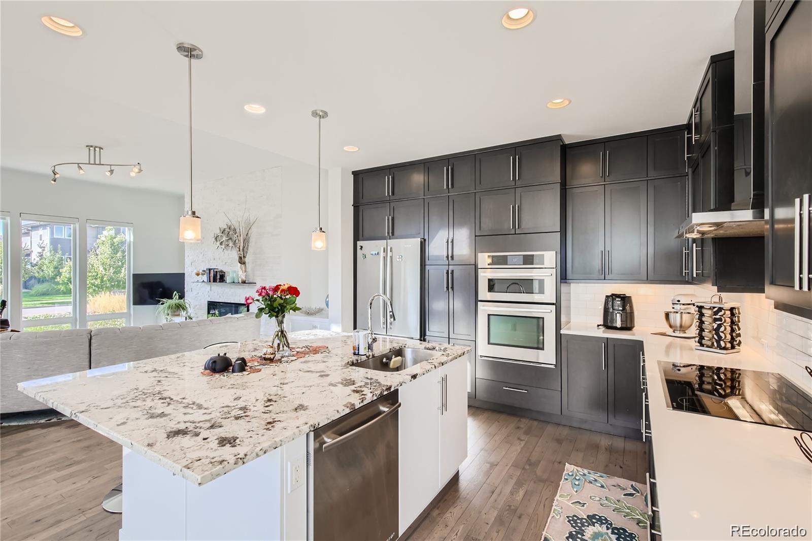 This beautifully designed 3-bedroom, 3-bath home combines modern architecture with warm, functional living spaces and abundant natural light. The striking exterior features clean lines and contemporary finishes, complemented by a welcoming covered front porch that creates a strong first impression. Inside, the open-concept layout feels bright and connected, ideal for both daily living and entertaining. The kitchen is the true heart of the home, showcasing rich, full-height cabinetry that offers generous storage while maintaining a sleek, modern look. An expansive center island with elegant stone countertops provides ample prep space and casual seating, making it a natural gathering point. High-end stainless steel appliances, including double wall ovens and a smooth cooktop, are seamlessly integrated, while a statement vent hood framed by classic subway tile adds texture and visual interest. Pendant lighting and recessed lighting enhance the space, and the kitchen flows effortlessly into the dining and living areas. The dining area is filled with sunlight and opens to the outdoor patio through sliding glass doors, creating an easy indoor-outdoor connection. A dedicated office offers a quiet and functional workspace with custom built-ins and a stylish accent wall. Upstairs, the primary suite serves as a peaceful retreat with generous space, soft natural light, and a private bath featuring dual vanities, sleek cabinetry, and a beautifully tiled shower. Two additional bedrooms are well-sized and versatile, ideal for guests or family. An upstairs living area adds flexibility as a lounge or media space. The unfinished basement offers excellent potential for future expansion or storage. Outside, the landscaped backyard features green lawn space, raised garden beds, and a covered patio, perfect for relaxing or entertaining. This home offers a refined balance of style, comfort, and functionality, designed for long-term enjoyment.