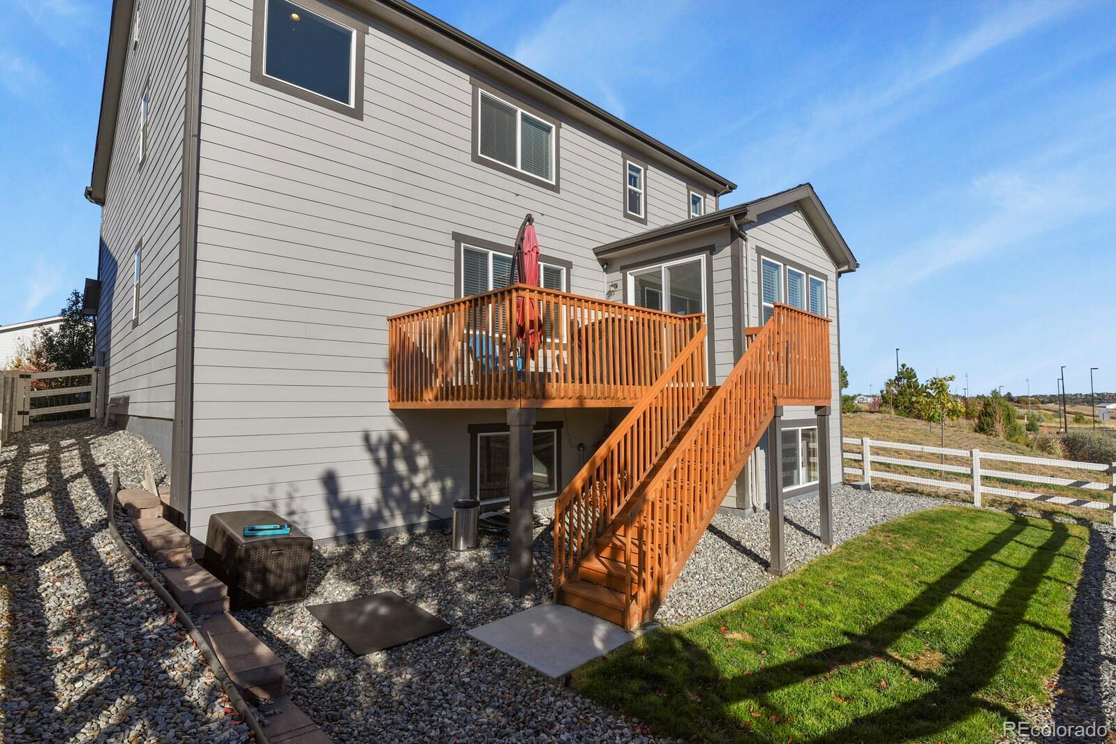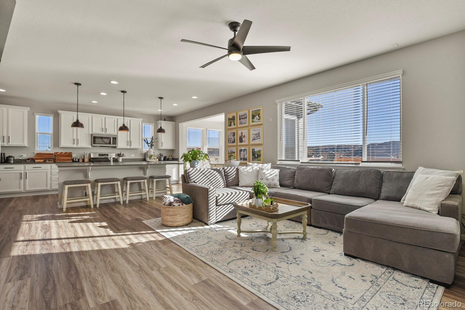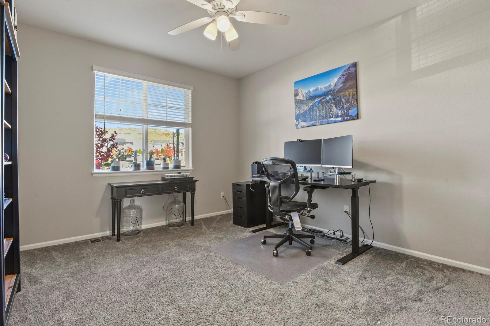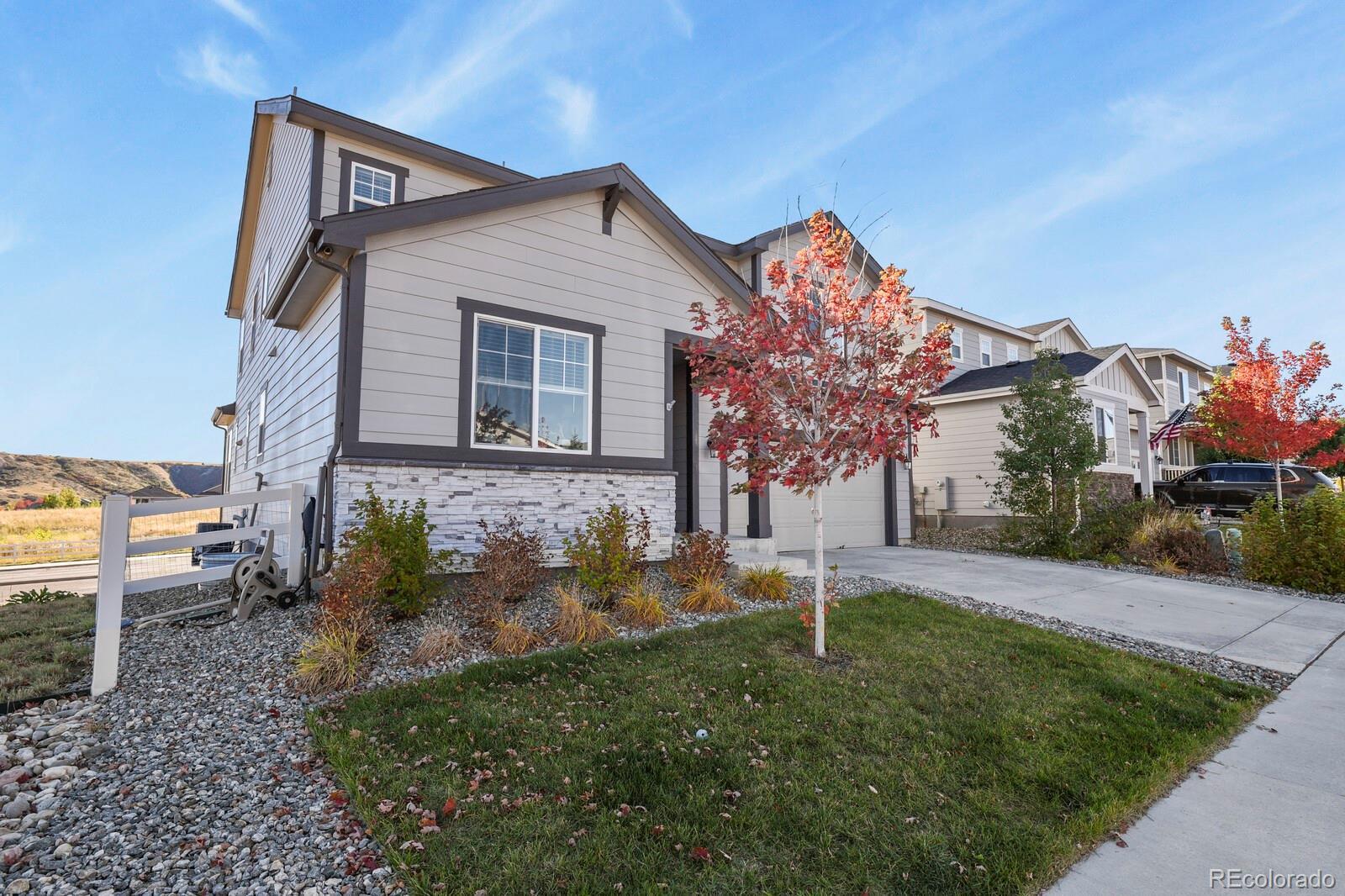 Sellers are offering $20,000 towards closing costs and rate buy-down on your dream home in the sought-after Crystal Valley Ranch community! This spacious and stylish modern farmhouse offers almost 2900 square feet of thoughtfully designed living space, featuring 3 bedrooms, 3 bathrooms, a versatile loft, and a dedicated office with elegant French doors—perfect for working from home. The main level boasts extensive luxury vinyl plank flooring, leading you into the open-concept family room with a contemporary gas fireplace, mantel, and pre-wired surround sound—ideal for entertaining or relaxing. The bright and east-facing sunroom, currently used as a dining room, floods the space with natural light and connects seamlessly to the well-appointed kitchen, complete with a large walk-in pantry, tech desk, and modern pendant lights. Upstairs, retreat to the spacious primary suite offering a luxurious 5-piece bath and generous walk-in closet. Two additional bedrooms, a full bath with double sinks, and a loft area provide plenty of room for family, guests, or hobbies. The full, unfinished garden-level basement adds over 1,400 sq ft of potential—use it for storage, a home gym, or customize it to suit your needs. Crystal Valley Ranch is a master planned community with a community pool, recreation center, trails and parks. Rhyolite Regional Park is across the street with turf fields, playground, covered pavilions, bike park, and disc golf course. Don't miss this rare opportunity to own a beautifully updated home with room to grow, all for under $650K!