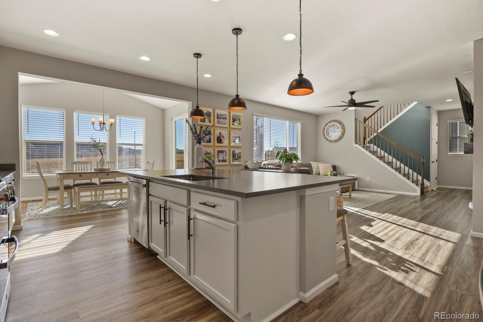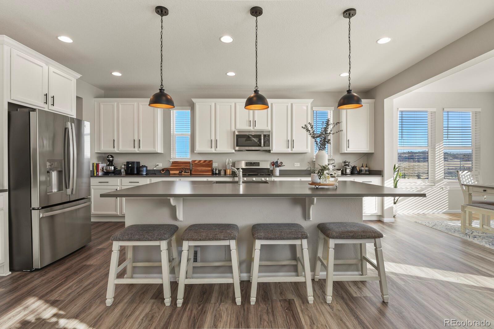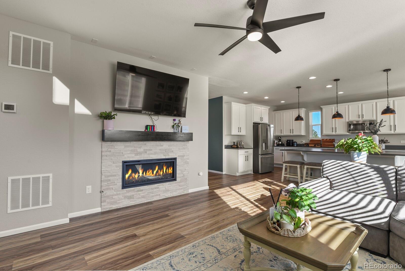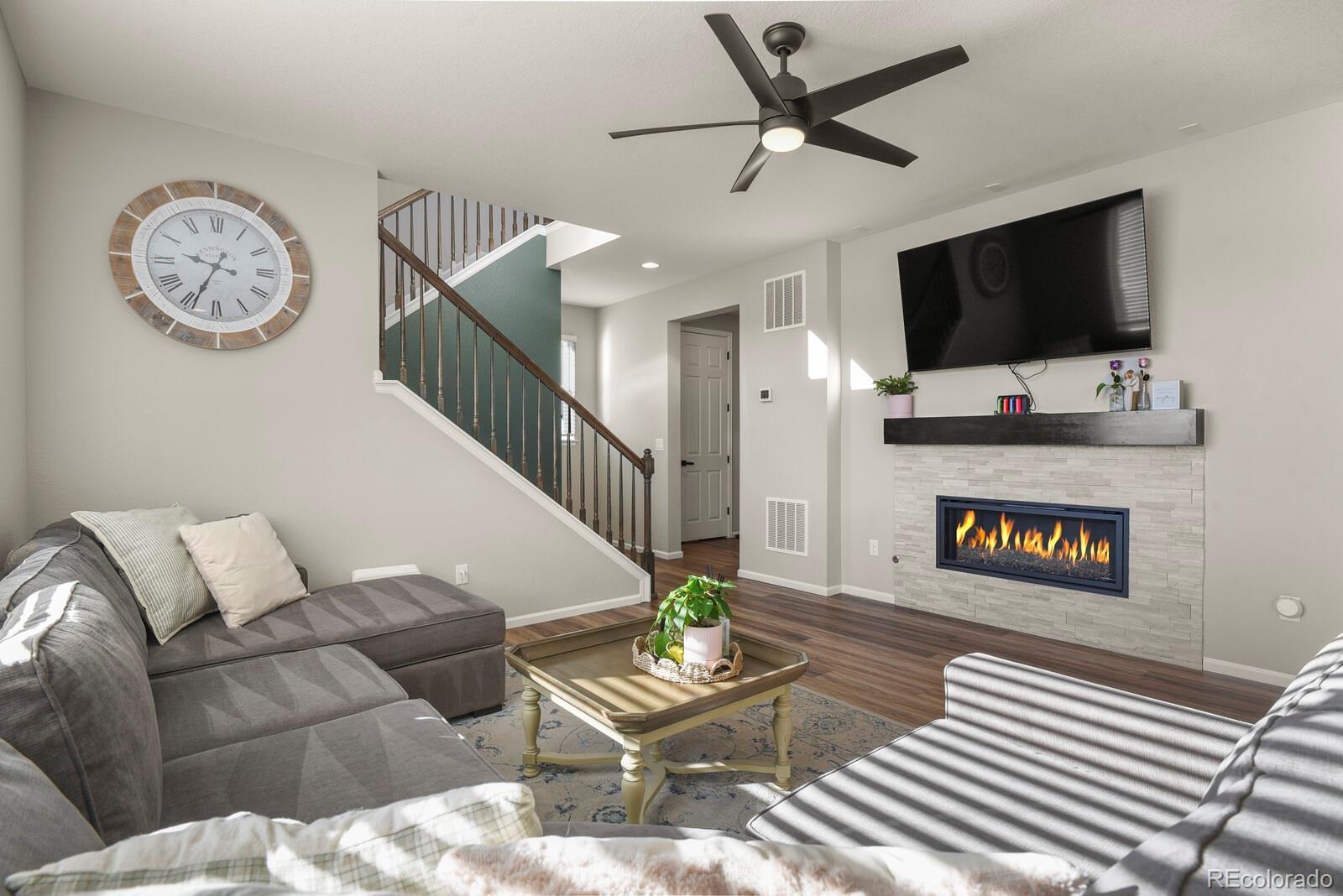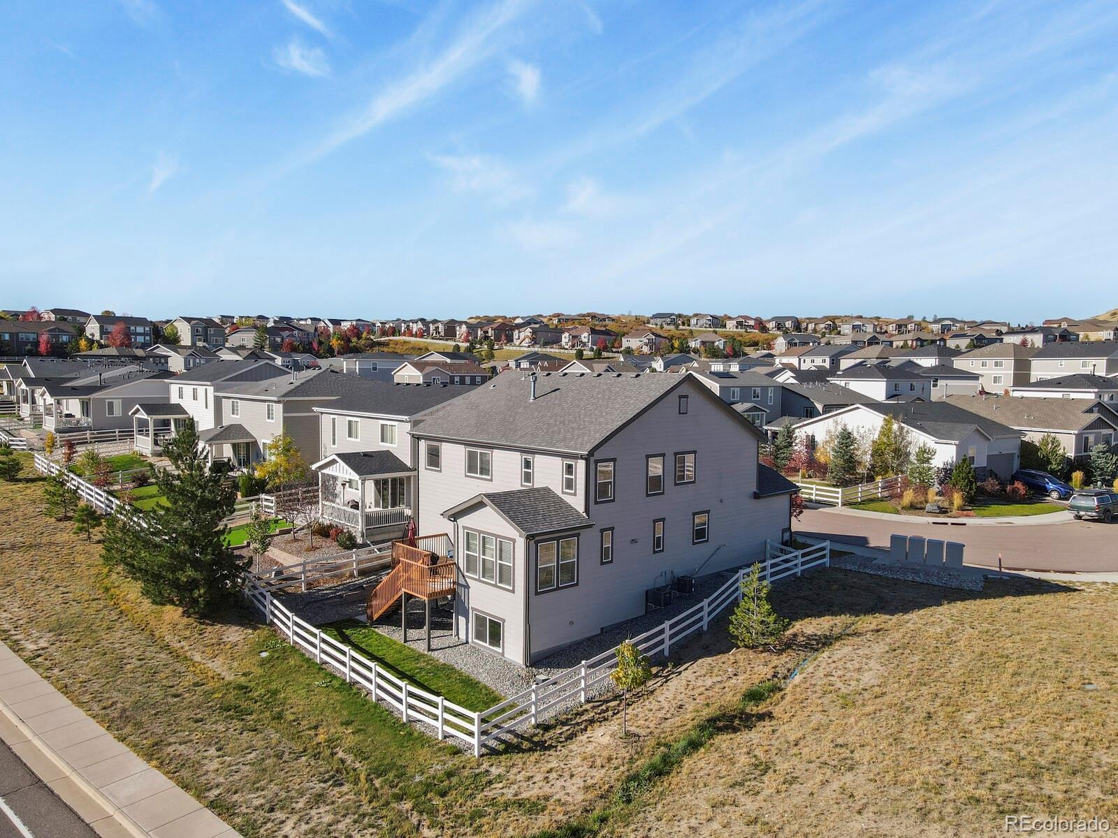 Sellers are offering $20,000 towards closing costs and rate buy-down on your dream home in the sought-after Crystal Valley Ranch community! This spacious and stylish modern farmhouse offers almost 2900 square feet of thoughtfully designed living space, featuring 3 bedrooms, 3 bathrooms, a versatile loft, and a dedicated office with elegant French doors—perfect for working from home. The main level boasts extensive luxury vinyl plank flooring, leading you into the open-concept family room with a contemporary gas fireplace, mantel, and pre-wired surround sound—ideal for entertaining or relaxing. The bright and east-facing sunroom, currently used as a dining room, floods the space with natural light and connects seamlessly to the well-appointed kitchen, complete with a large walk-in pantry, tech desk, and modern pendant lights. Upstairs, retreat to the spacious primary suite offering a luxurious 5-piece bath and generous walk-in closet. Two additional bedrooms, a full bath with double sinks, and a loft area provide plenty of room for family, guests, or hobbies. The full, unfinished garden-level basement adds over 1,400 sq ft of potential—use it for storage, a home gym, or customize it to suit your needs. Crystal Valley Ranch is a master planned community with a community pool, recreation center, trails and parks. Rhyolite Regional Park is across the street with turf fields, playground, covered pavilions, bike park, and disc golf course. Don't miss this rare opportunity to own a beautifully updated home with room to grow, all for under $650K!