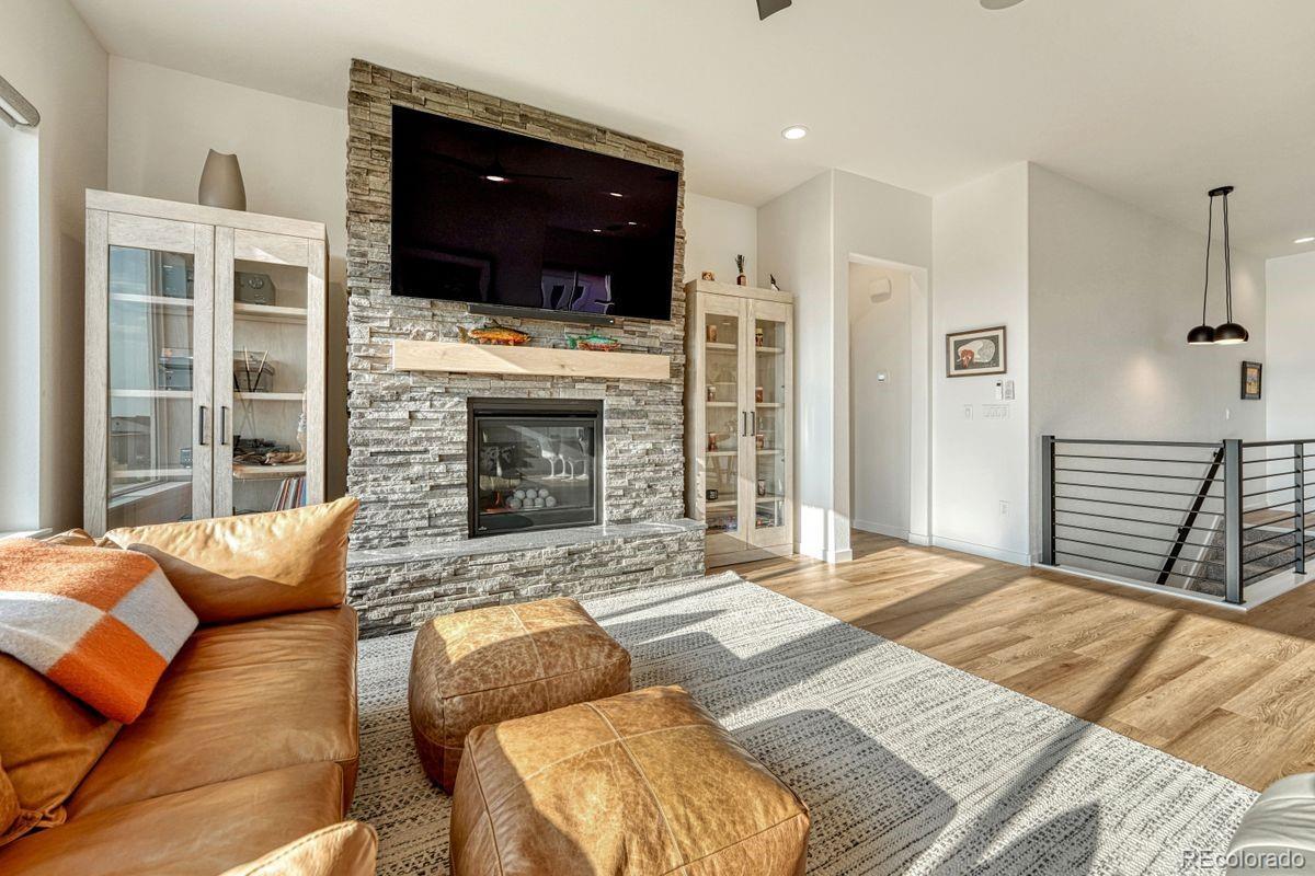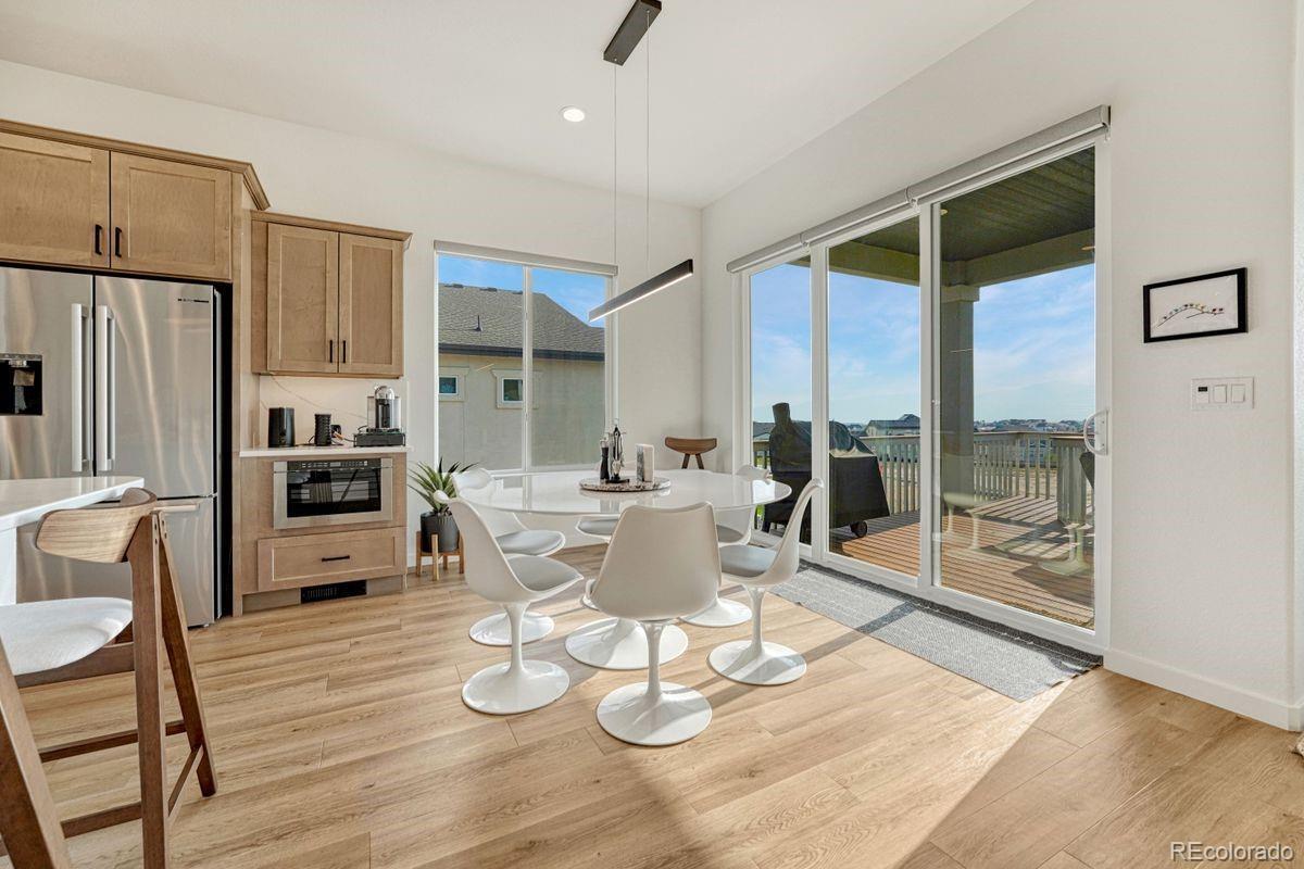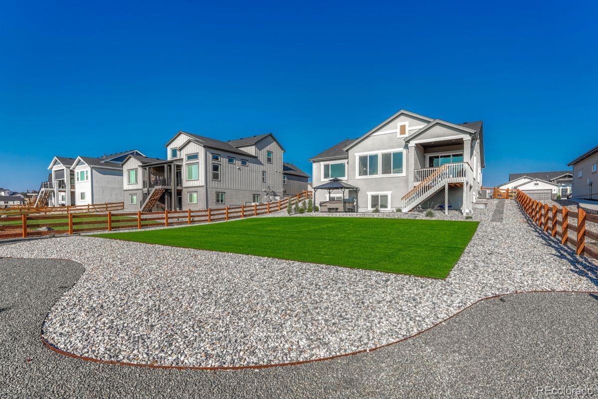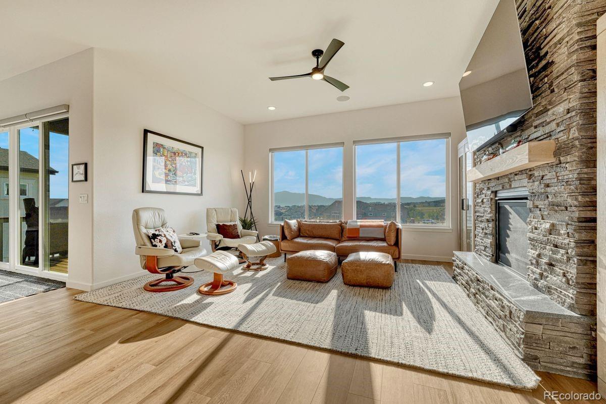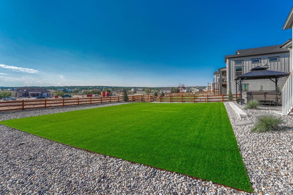 Stunning, nearly new and upgraded Vantage rancher w/ an alpine modern design in sought after south Black Forest perched on a knoll w/ over a third of an acre with sweeping unobstructed views of Pikes Peak, the mountain range and city lights. The main level is bright and open w/ massive windows which perfectly showcase the stellar mountain views, all hardwood floors throughout the main level, new modern high end style lighting throughout, window coverings, speaker system, gas log fireplace w/ full stacked stone surround and mantle, modern metal railings, wood paneled sound proof walls, two main level bedrooms and office. The kitchen is open to the great room and features slab Quartz counters, upgraded warm cabinetry, stainless appliances, a gas range, modern hood vent, pendant lighting over the large island w/ seating, recessed lighting, convection microwave, pantry and a dining room w/ huge whole wall glass door to the covered composite back deck. Central AC. Main level primary suite w/ walk-in closet, views, double vanity and over-sized shower w/ seamless glass surround. Huge professionally landscaped and fenced low maintenance backyard w/ artificial turf, large lower level patio w/ gazebo and hot tub hook-up. Main level office w/ wood paneled accent wall, french doors, built-in desk w/ Quartz counters. Main level laundry w/ utility sink and built-in cabinetry. Over-sized 3 car garage w/ tons of additional storage space, epoxy floors, utility sink and electric hook-up for heater. Garden lower level w/ tons of natural light, 2 bedrooms, an additional bath, large storage space which could be a 5th bedroom and a large family room w/ room for a game area and TV area/sitting. Low maintenance stucco exterior. Amazing outdoor recreation nearby with the 8 mile Sand Creek Trail, the 630 acre Section 16 open space and 1,070 acre Pineries Open Space both w/ miles of trails. Convenient location w/ great access to the amenities of Powers and Northgate.