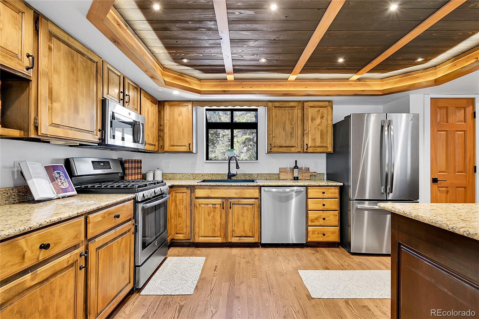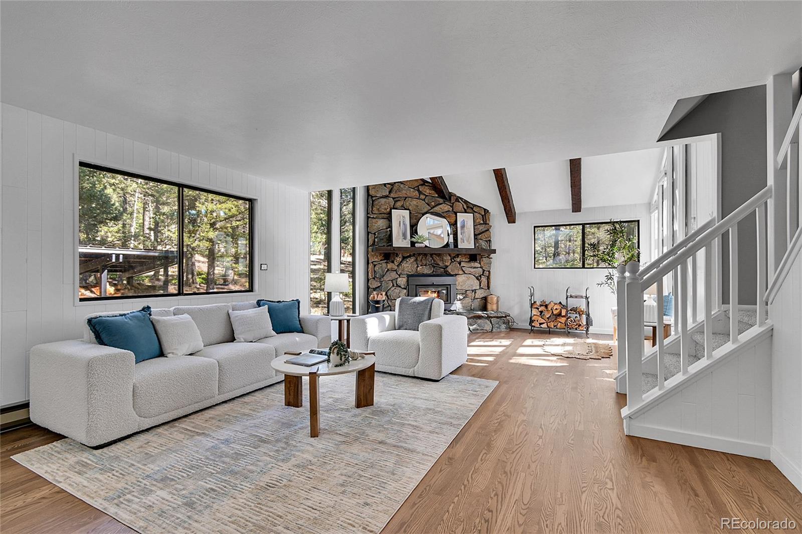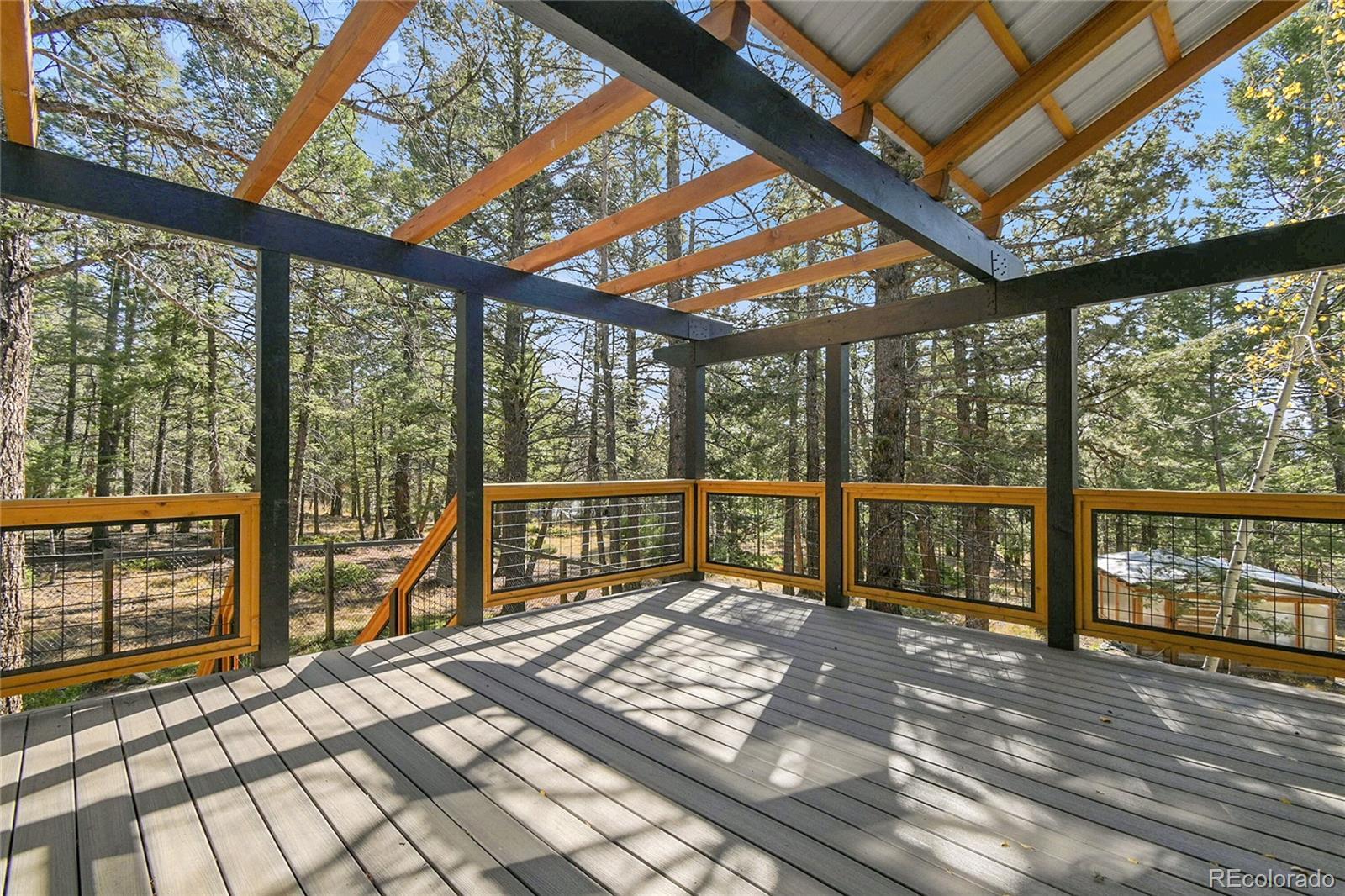 Pine Haven Retreat: mountain comfort on a full acre in Conifer. Newly refinished wood floors welcome you into sunlit living spaces that open to a new deck for effortless outdoor dining and relaxing. Updated baths and kitchen make this a move-in ready home right before the holidays. Haven Highlights: greenhouse, outdoor storage for every toy, while the lower level provides flexible living: in-law suite, prime guest space, rec room, office, you choose. Quiet setting among the pines with easy access to town and Hwy 285. This is the mountain lifestyle—simple, bright, and ready to enjoy. Community water & sewer.