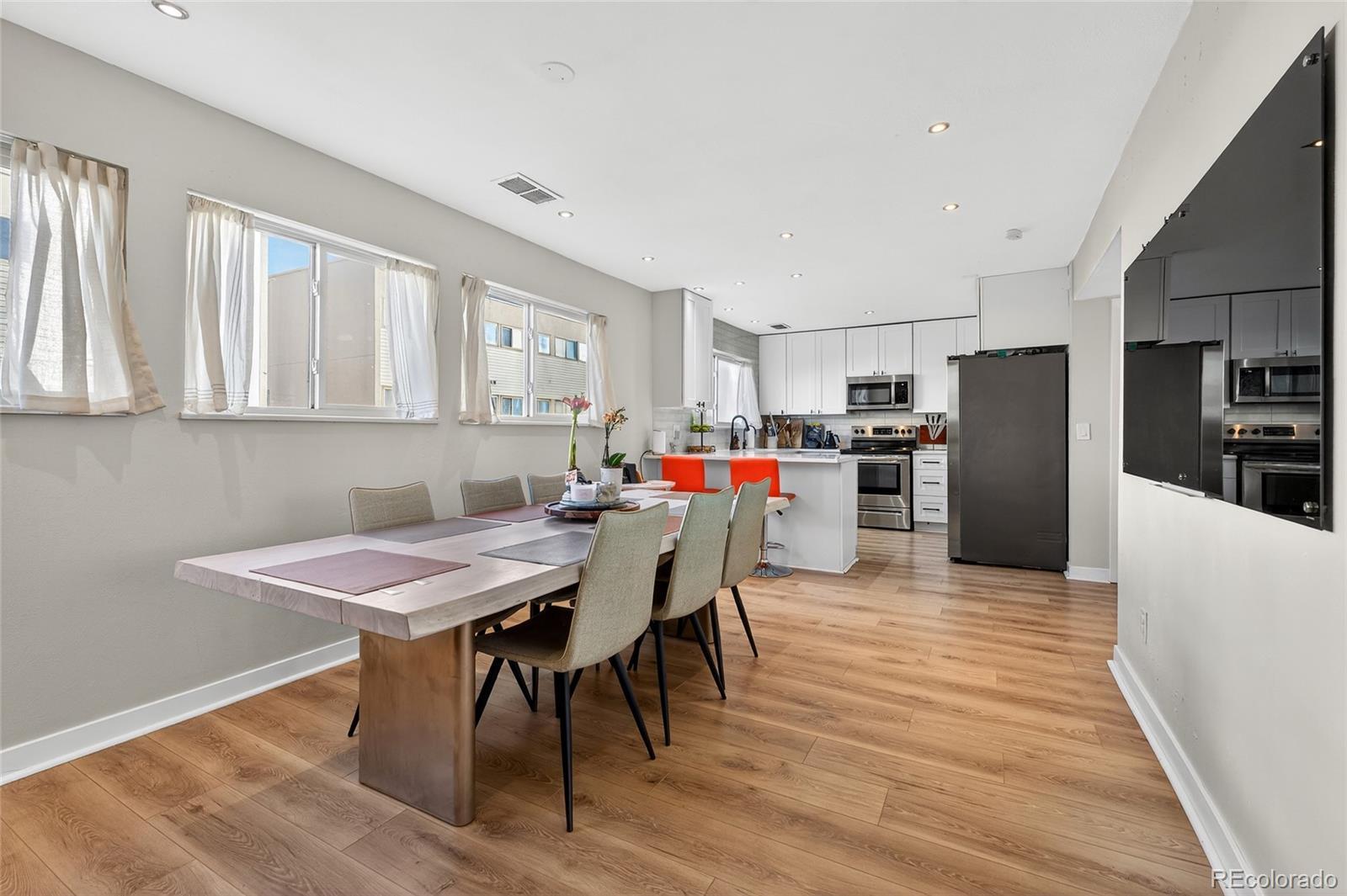 Bright, sunny, and move-in ready—this second-story townhome offers an unbeatable combination of space, style, and location. Enjoy easy access to Westerly Creek Trail and a commute of 25 minutes or less (with some traffic) to much of Denver and Aurora, all within a welcoming, well-connected community. The private 2-car garage sits on the first level, leading upstairs to an impressive open floor plan filled with natural light. A sunroom enhances the living space, and this is the only upstairs unit in the complex featuring walk-through access on both sides between the dining and living areas—creating a uniquely open and airy feel. Home chefs will love the updated kitchen that shines with white Shaker cabinetry, sleek quartz countertops, stainless steel appliances, and generous storage. It opens seamlessly to an expansive dining area, ideal for hosting and entertaining. Step out onto the spacious private balcony for effortless indoor/outdoor dining and relaxation. New LVP flooring runs throughout the entire main level. Upstairs, you’ll find three generously sized bedrooms with newer carpet. The primary suite features an updated en-suite bath and a walk-in closet, while the secondary bathroom has been tastefully updated with mosaic tile flooring. Convenient upper-level laundry adds to the home’s functionality. Recent updates include new siding (2024), a brand-new HVAC system (Fall 2025) and newly updated upstairs bath with new tile, new mirrors, and dimmers to all recessed lighting. Just blocks away are restaurants, grocery stores, schools, shopping, public transportation, and entertainment, with quick access to I-225, the airport, and Cherry Creek State Park. A bright, beautifully updated townhome in a fantastic location—this one is a true gem.