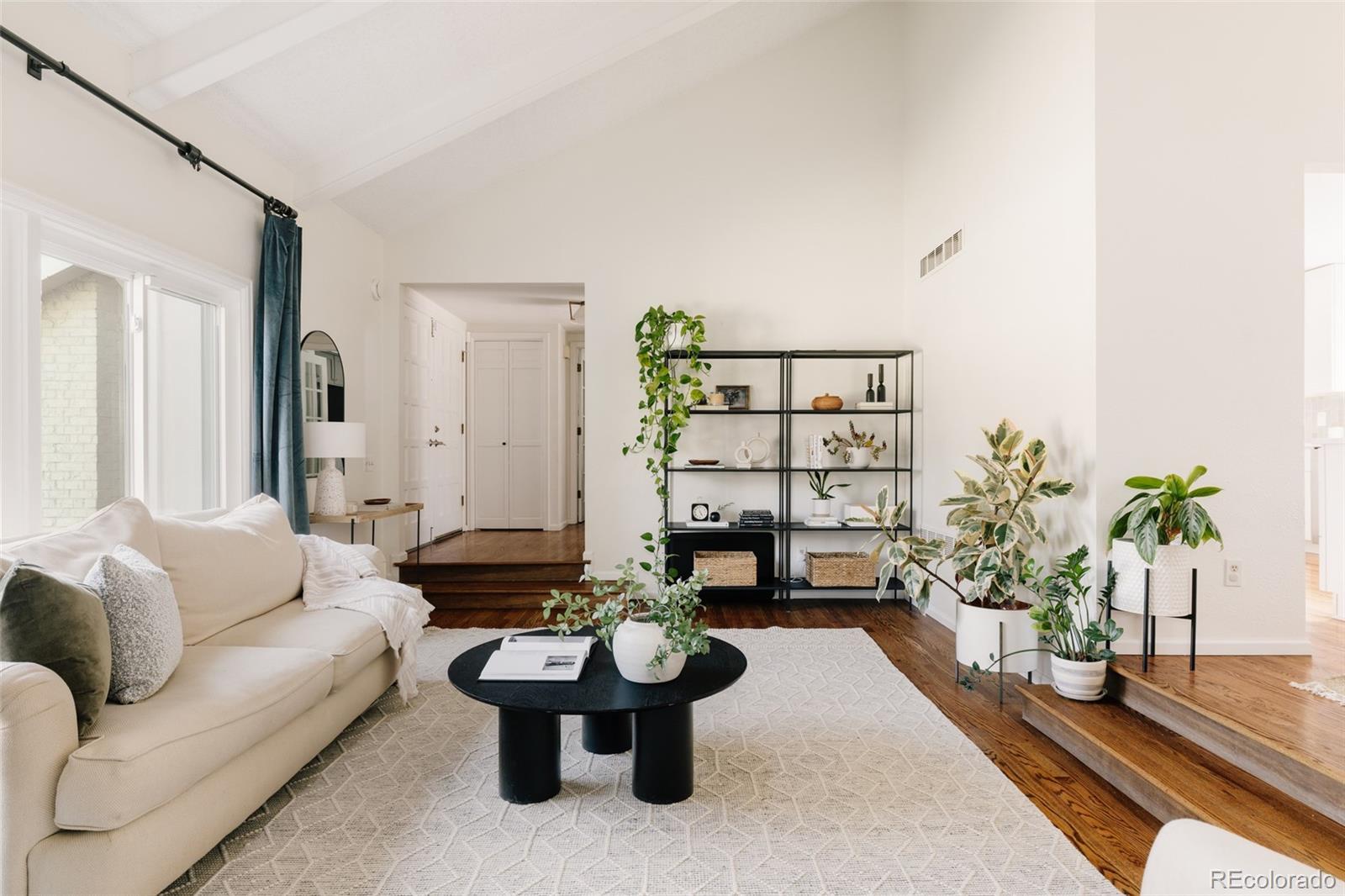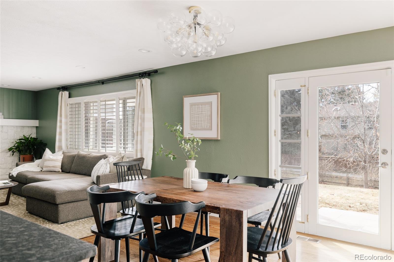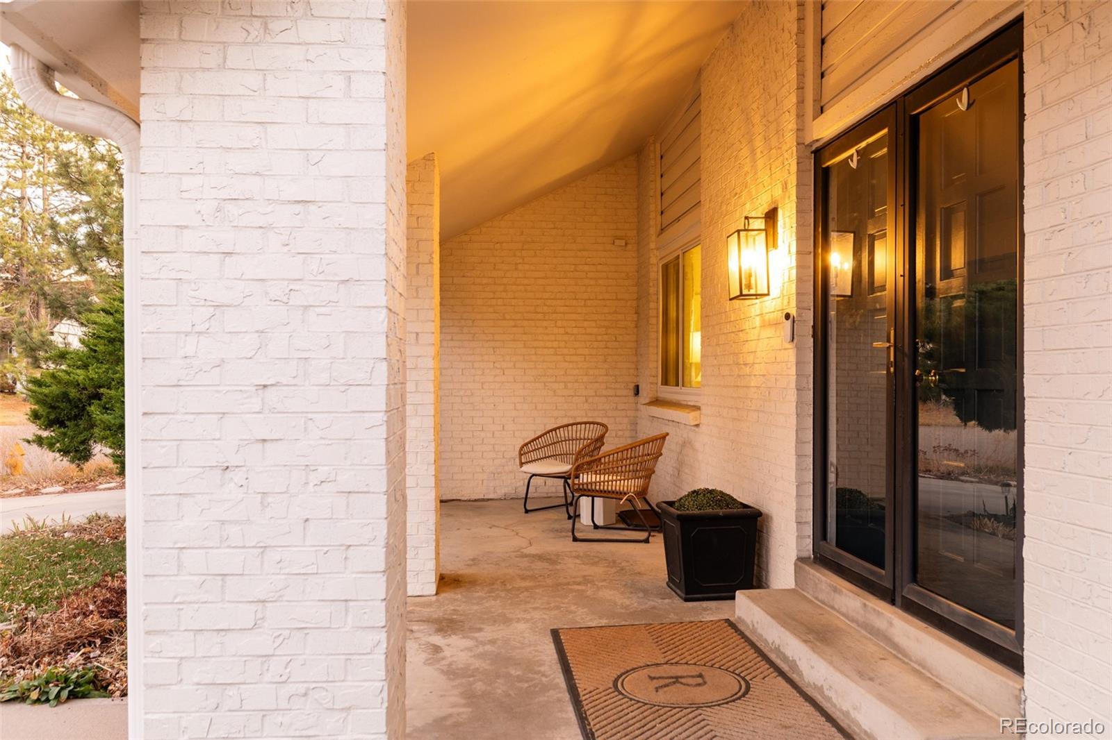 Arapahoe Lake residence. Located on a quiet street with no through traffic. A welcoming covered front porch sets the tone for a residence. Inside, vaulted ceilings accented with architectural beams create an airy & elevated first impression. To the right of the foyer, a beautifully appointed formal sitting room provides an inviting space to gather & relax. This room steps seamlessly into the formal dining area, anchored by a striking sputnik chandelier that creates an elegant backdrop for dinners & celebrations. Just beyond the entry, the home opens into the main living area where thoughtful design meets everyday functionality. The remodeled kitchen is the heart of the home, with white shaker cabinetry, quartz countertops, a designer backsplash, custom lighting & upgraded appliances including a gas range. The kitchen flows naturally into the eat-in dining area, enhanced by a built-in dry bar with wine fridge. Adjacent to the kitchen, the main living room is centered around a gas fireplace framed by a dramatic stone surround & mantle. The eat-in dining area opens directly to the expansive backyard, ideal for indoor-outdoor living. Enjoy a pergola-covered patio & a yard backing to open space & greenbelt with mature trees & access to scenic walking paths. The main level features refinished hardwood floors throughout, a custom mudroom with built-in cabinetry & a convenient powder bath. Upstairs offers 4 beds & 2 baths, including a serene primary suite with walk-in closet & a fully remodeled spa-like bath with dual-sink vanity, quartz counters, floor-to-ceiling subway tile, updated lighting, & a glass-enclosed shower. All upstairs carpet is new. The finished basement adds flexible living space for media, guests, or fitness. Major upgrades include newer HVAC, electrical panel, water heater, fresh exterior paint, electric fence & front-facing windows. Enjoy walkable access to the neighborhood pool, tennis & pickleball courts, parks, greenbelt trails, top-rated schools!